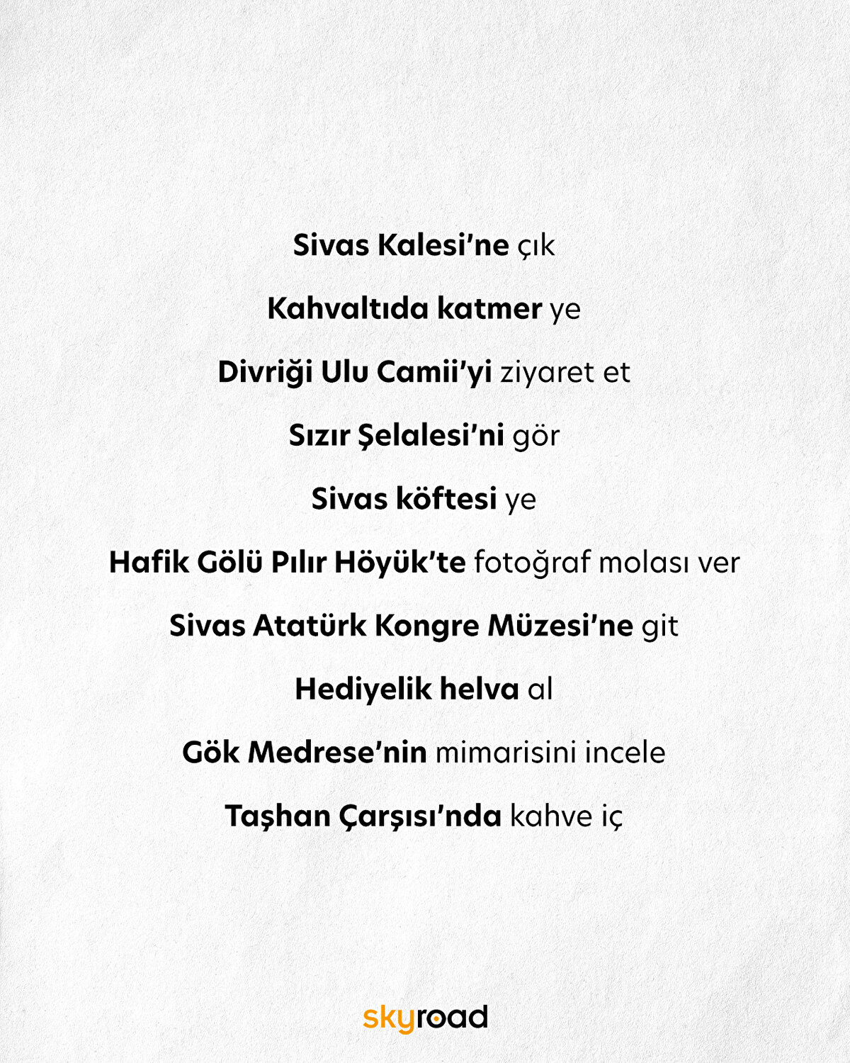 Sivas Kalesine çıkın. Sivas'ın kalbinde yer alan ve şehrin simgesi haline gelmiş olan Sivas Kongre Müzesi'ni ziyaret edin. Burada, Kurtuluş Savaşı'nın önemli anlarına tanıklık edebilirsiniz. Doğanın tadını çıkarmak için Hafik Gölü Pılır Hüyük'e uğrayın ve berrak sularında huzur bulun. Sivas'a özgü lezzetleri tatmadan dönmeyin; özellikle Sivas köftesi ve katmeri denemeniz gereken lezzetlerden.