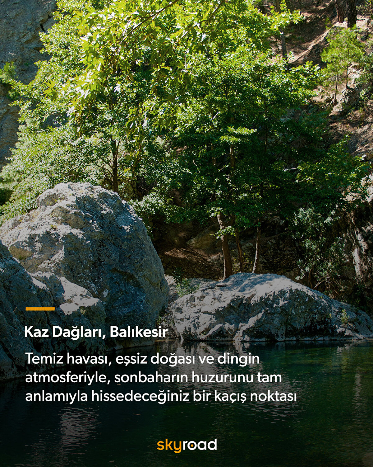 Balıkesir'deki Kaz Dağları, tertemiz havası ve dingin atmosferiyle sonbaharın huzurunu hissedebileceğiniz bir başka cennet. Doğanın içinde kaybolmak, yenilenmek ve bu mevsimin büyüsünü yaşamak isteyenler için bu rotalar mükemmel birer seçenek.