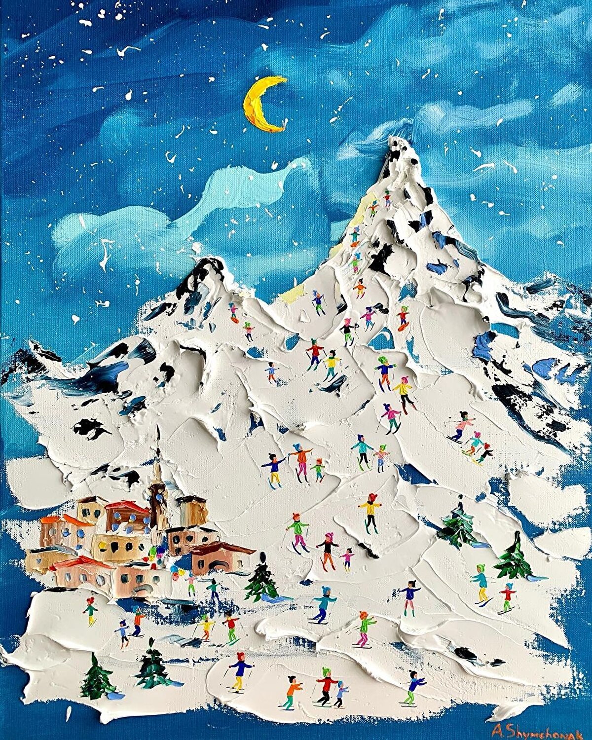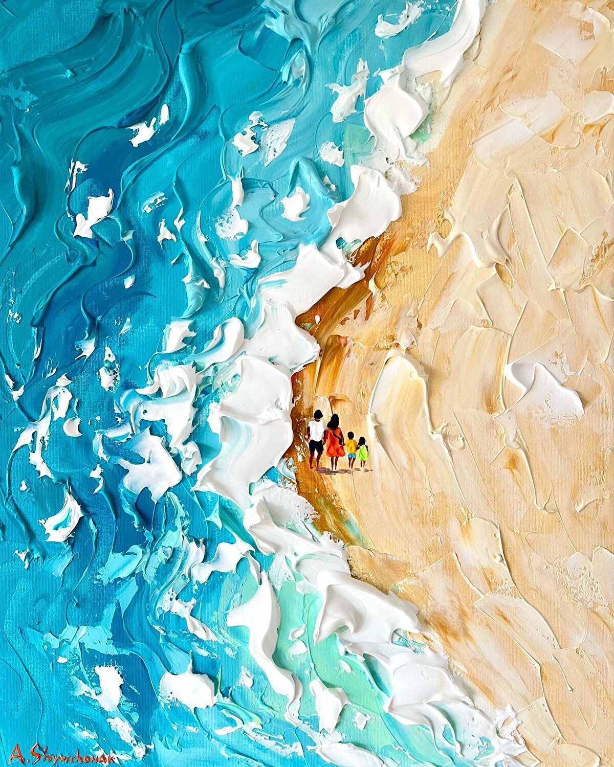 Sanatçının çalışmalarının en dikkat çeken noktası ise doku. Alena, bu dokuyu verebilmek için doğayı resmederken palet bıçağı kullanıyor. Anı, insanları ve doğayı uyum içinde birleştirdiği çalışmaları, hafızamızda yer alan ve bize 'iyi hissettiren' anıları akla getiriyor. Shymchonak, resimleri ile yalnızca gördüğü manzaraları değil benzersiz boyama sayesinde, yaptığı seyahatlerinin hissettirdiklerini de aktarıyor. Onları kuşatan dalgalar ve bembeyaz baştan çıkarıcı manzaralarda çizdiği karakterler adeta canlı ve o anı gerçekten yaşıyorlarmış gibi.