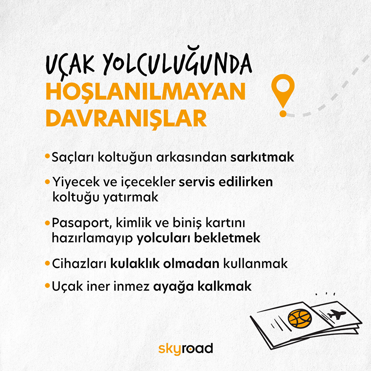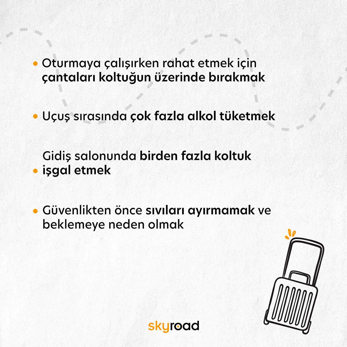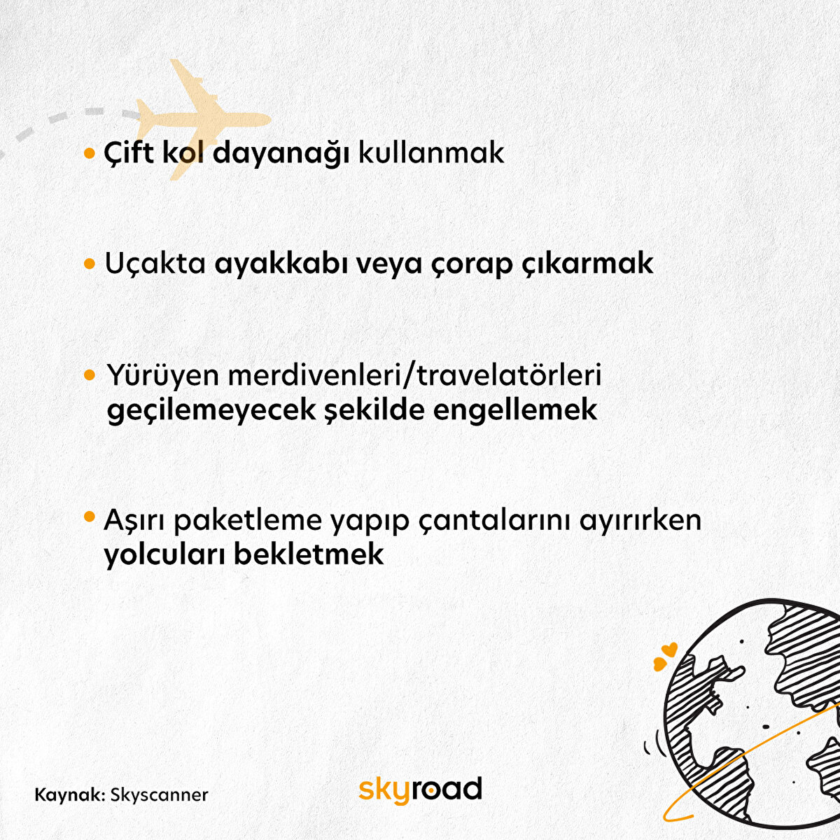 Skyscanner tarafından yakın zamanda 2 bin Birleşik Krallık yolcusu üzerinde yapılan bir araştırmaya göre Britanyalı havayolu yolcuları için diğer yolcuların aşırı alkol tüketimi en büyük şikayet konusu. Ankete katılanların yüzde 48'i, diğer yolcuların fazla içki içmesinden rahatsızlık duyduklarını belirtti. Yolcuların diğer şikayetleri arasında sırayla koltuklarını yiyecek veya içecek servisi sırasında geri yatıran kişiler ve kulaklık takmadan cihaz kullananlar yer aldı. Anket katılımcılarının beşte ikisi, uçuş sırasında koltuğunu yatırmanın uygunsuz olduğunu ifade etti.