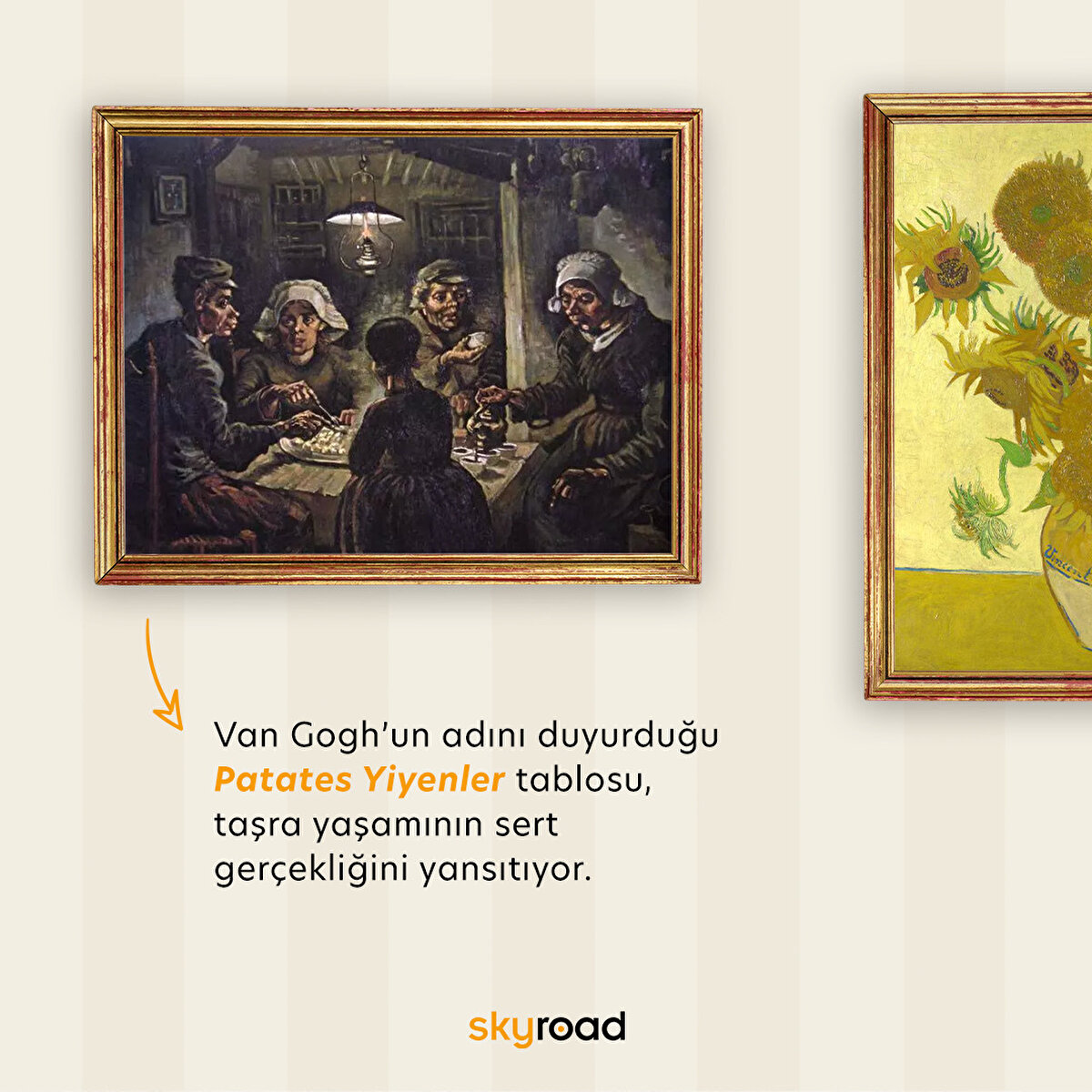 Şüphesiz ki bizim, Vincent van Gogh geliyor! Etkileyici renk tonları ve fırça darbeleriyle Van Gogh'un tabloları, gerçekçi bir dünyada kendi hayal dünyasını yansıtıyor. Yıldızlı Gece de olduğu gibi gerçeği farklı bir boyutta anlatan Van Gogh, Patates Yiyenler tablosunda olduğu gibi de salt gerçekliği tuvale aktarıyor.
