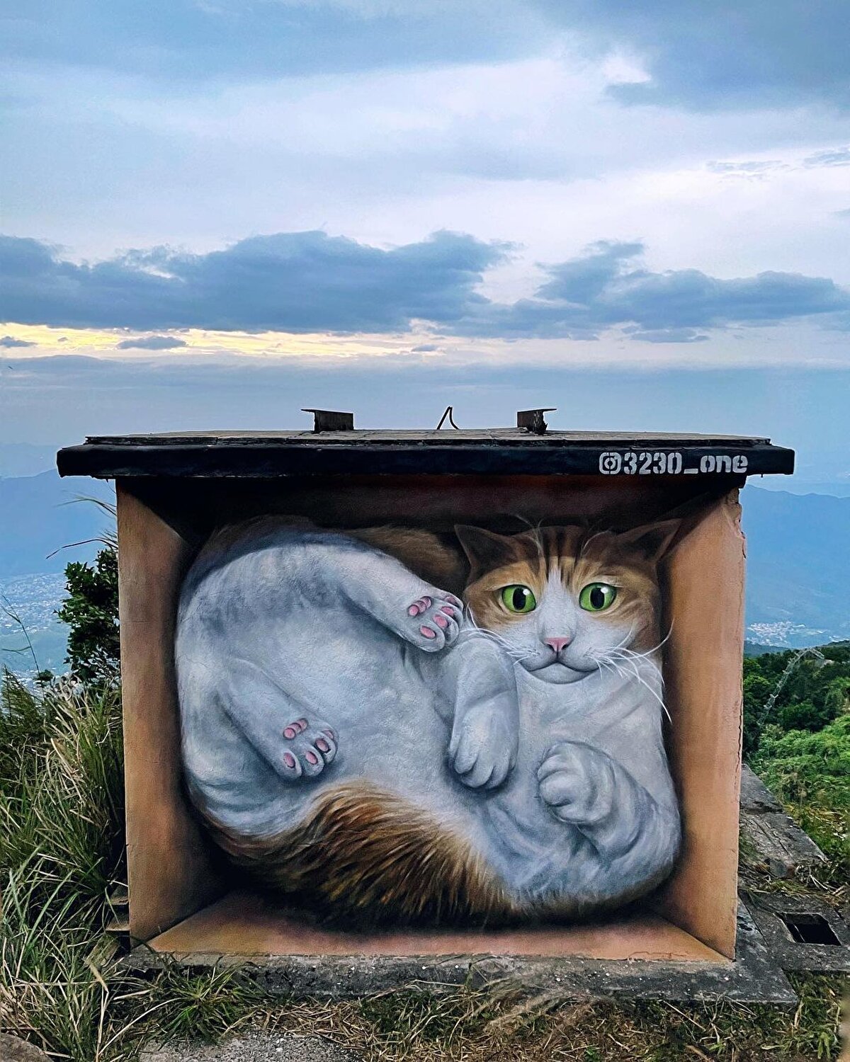 @3230_one, bazen metruk binalara, bazen restoranların dış cephelerine yaptığı kedi temalı resimleriyle ardında daha sevimli bir Hong-Kong bırakıyor. Hong-Kong'un en yüksek noktasındaki bir duvara yaptığı “Kutudaki Kedi" resmiyle bulutların arasında, bir kutuya sıkışıp kalan bir kediyi görüyoruz. Aman dikkat, çok bakarsanız siz de içine düşebilirsiniz!