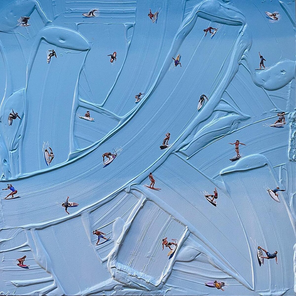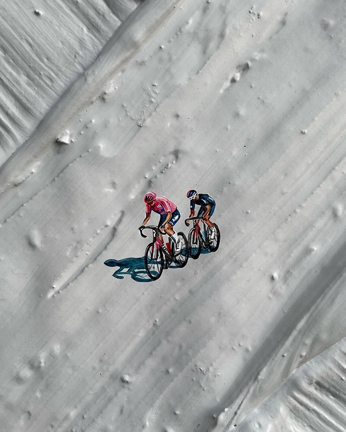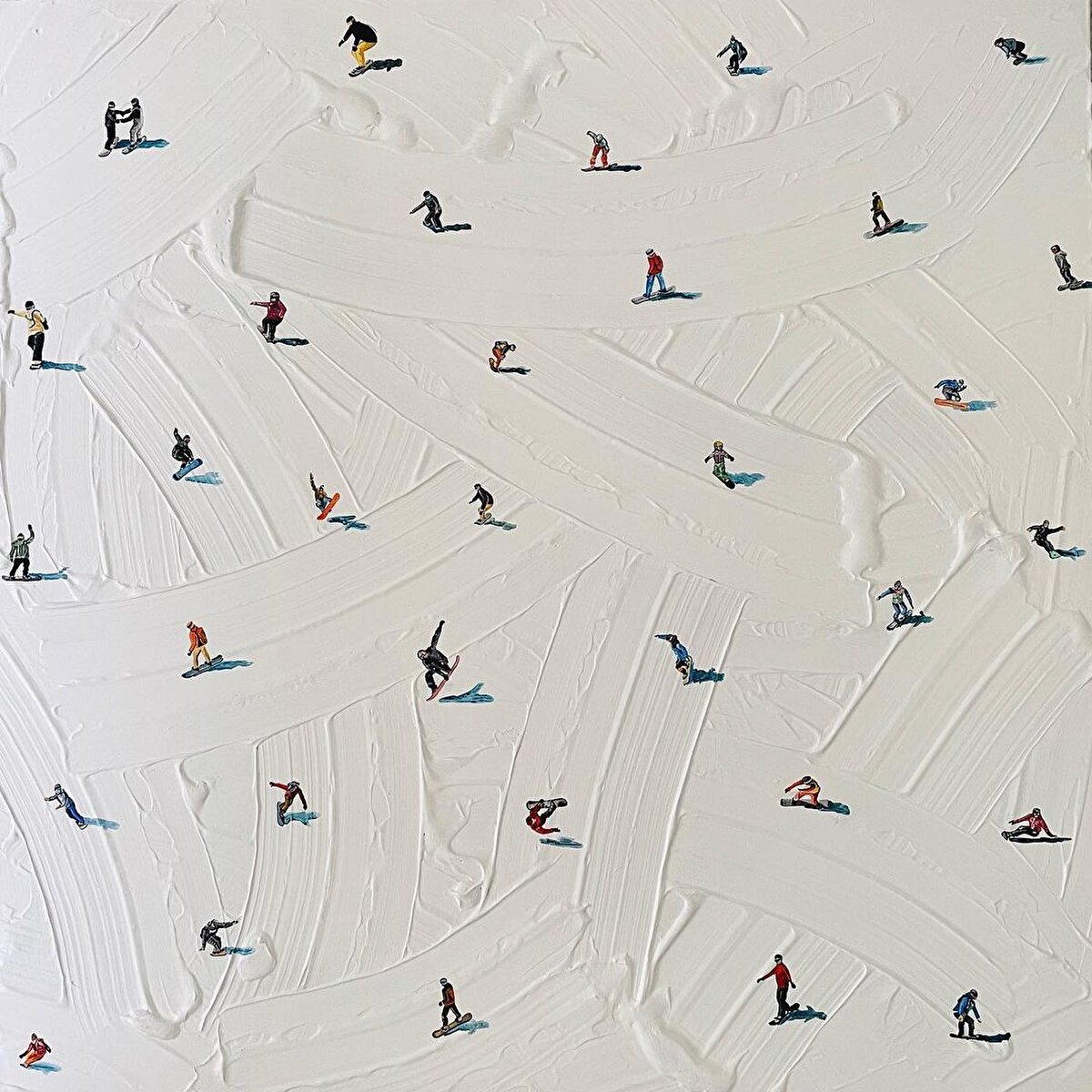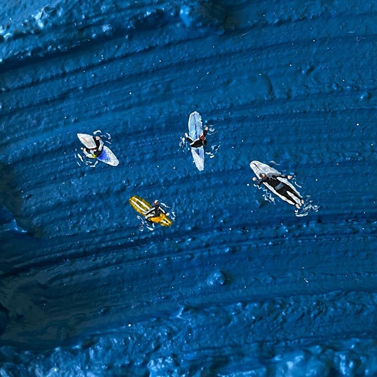 Avustralya'da yaşayan çağdaş sanatçı Werner Bronkhorst (@werner_bronkhorst), 2018 yılından beri kendi tarzında tablolar yapıyor. Aslında bir mobilya ustası olan sanatçı, tesadüfen kenara ayırdığı farklı inşaat malzemelerini kullanarak boyadığı arka planlar sayesinde resme ilgi duymaya başlamış. Teoride sanatla pek de bir ilgisi olmayan bu malzemeler, onun alışılmadık dokulu tuvallerini ortaya çıkarmış. Bu dokulu arka planları bir manzara gibi görmeye başlayan sanatçı, karla kaplı dağlara baktığını düşünüp ilk tuvalinin üzerine bir dizi kayakçı çizmiş ve daha sonra bu çalışmayı dağlar, plajlar, su sporları ve sörfçülerle oluşan çalışmaları takip etmiş. Çoğunlukla sportif mikro evrenler oluşturan sanatçı, ağır malzemelerle küçük kahramanları birleştirdiği doğal manzaralar ortaya koyuyor. Sanatçının soyut eserlerinde yaşayan bu küçük insanlar, izleyenleri gülümsetmeye, eleştirmeye ve eğlenmeye davet ediyor.