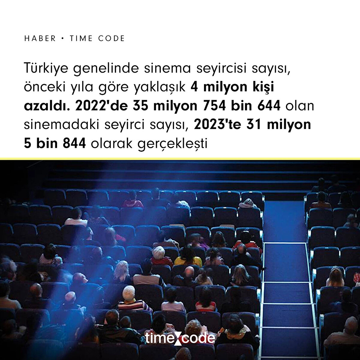 Türkiye İstatistik Kurumu'nun (TÜİK) açıkladığı sinema ve gösteri sanatları istatistiklerine göre; Türkiye genelinde sinema seyircisi sayısı önceki yıla göre yaklaşık 4 milyon kişi azaldı.⏩