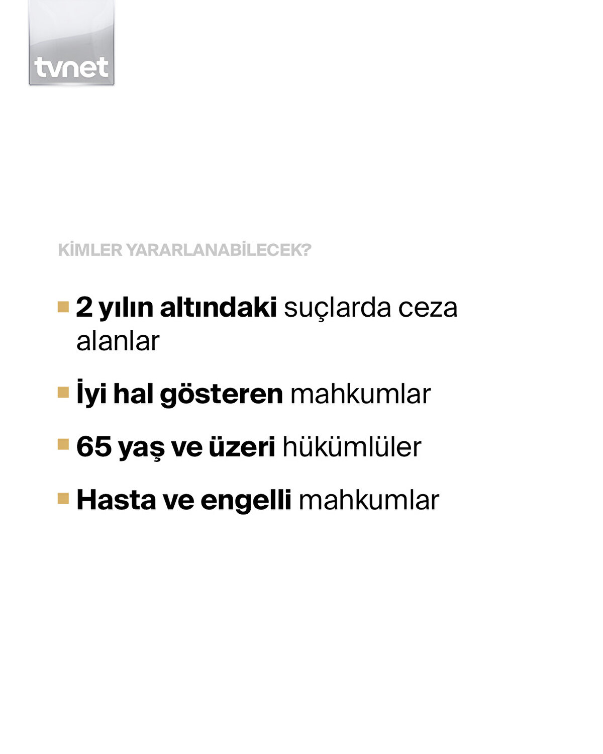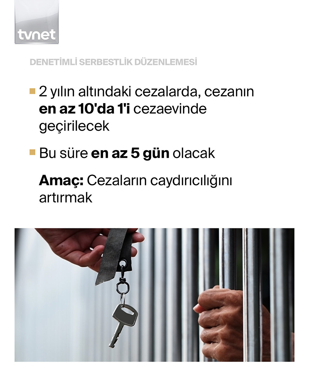 Ayrıca denetimli serbestlikten yararlanmak isteyen hükümlülerin, koşullu salıverilme tarihine kadar olan sürenin en az onda birini ceza infaz kurumunda geçirmesi zorunlu hale getirildi.
