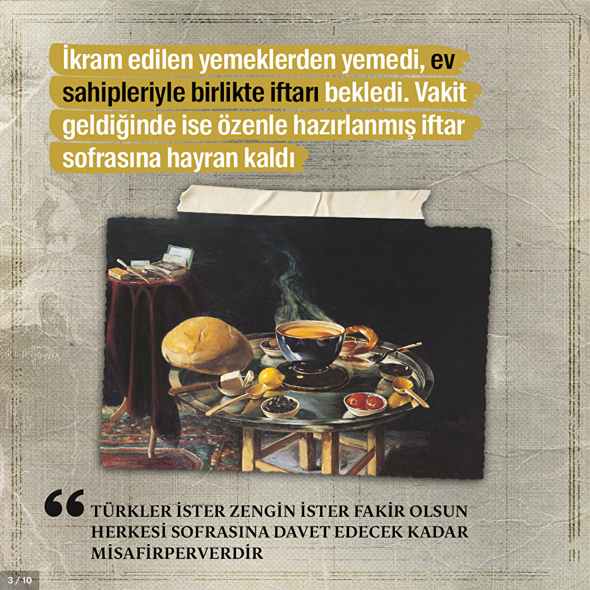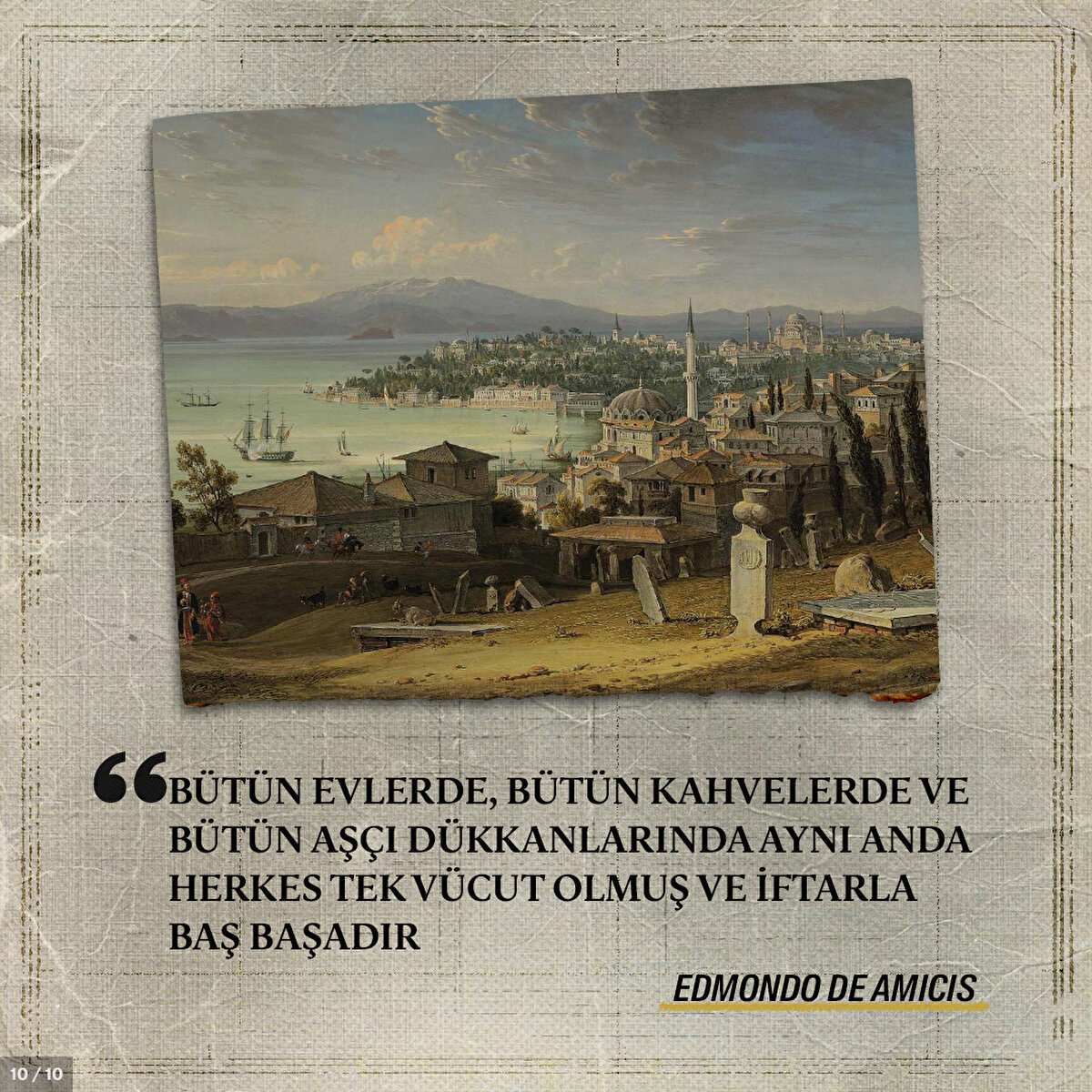 19. yüzyılda Batılı gezginlerin seyahatleri İstanbul'da Ramazan ayının yaşandığı bir döneme denk gelmişti. Kimisi Türk bir ailenin evinde oruçlu bir gün geçirdi kimisi de kılık değiştirerek İstanbul sokaklarını gezdi. Yazar ve şair olan gezginler hem şehre hem de insanlara olan hayranlıklarını gizleyemedi; gözlemlediklerini eserlerine yansıttılar. Peki hangi gezginler nereleri gezdi ve en çok neleri beğendi?
