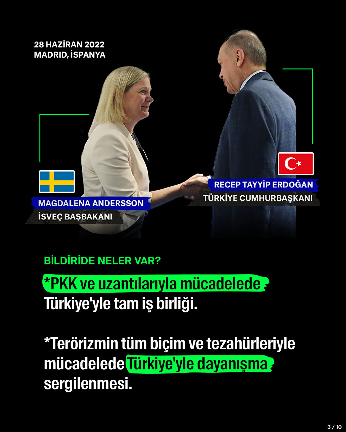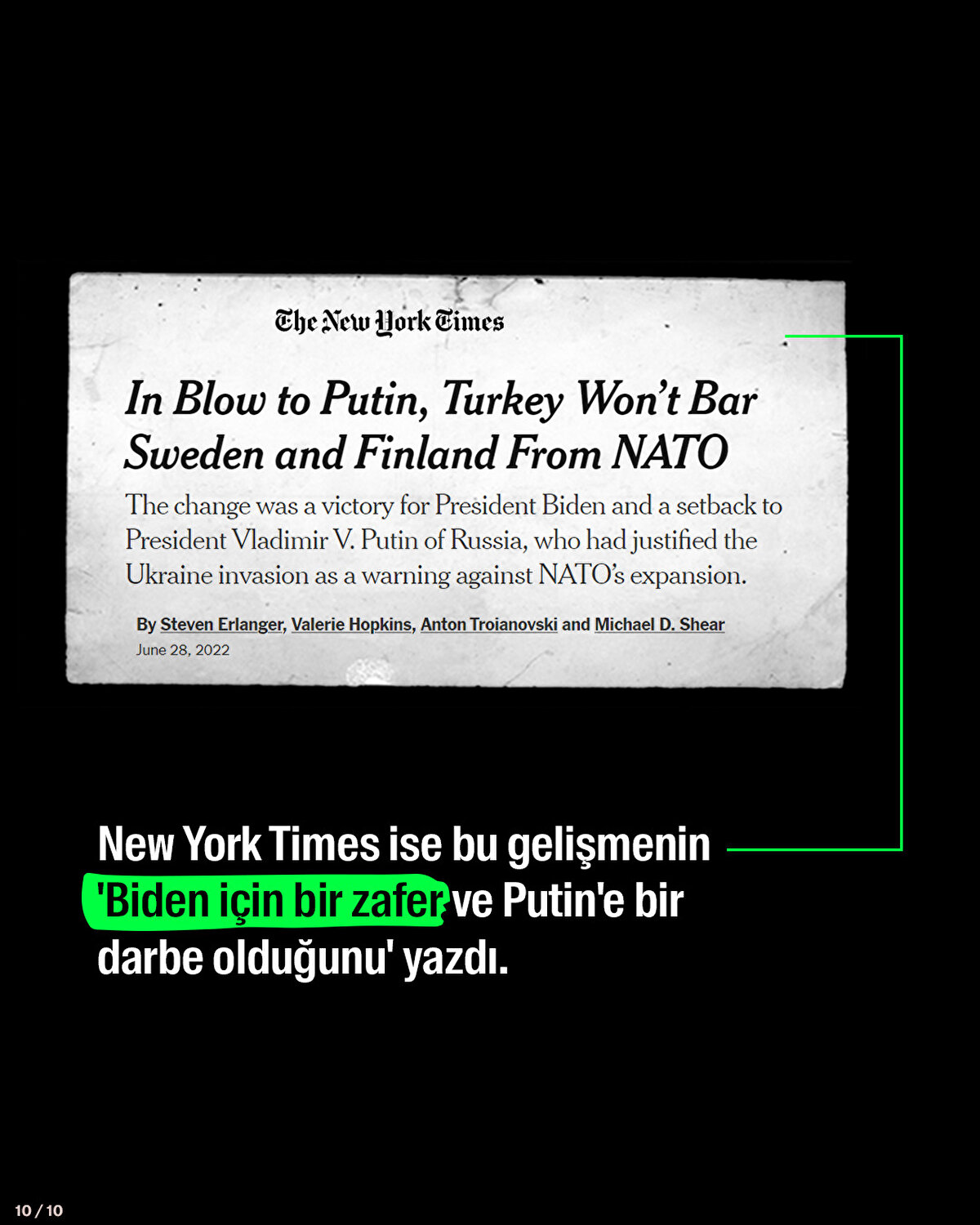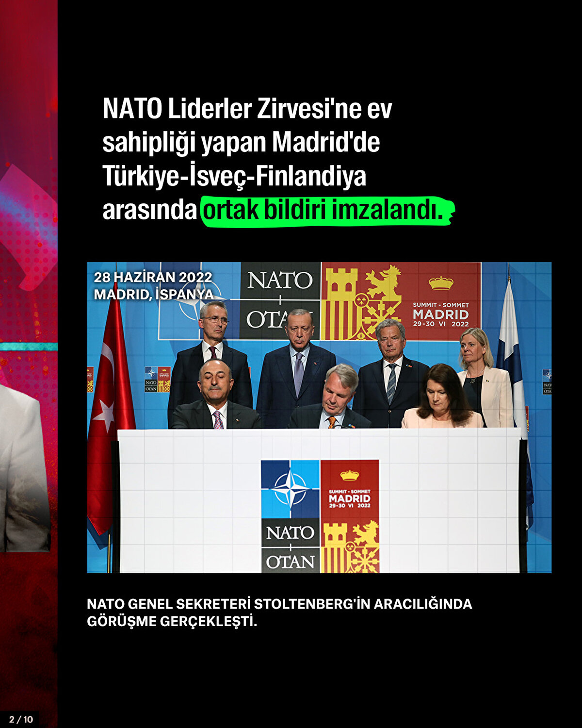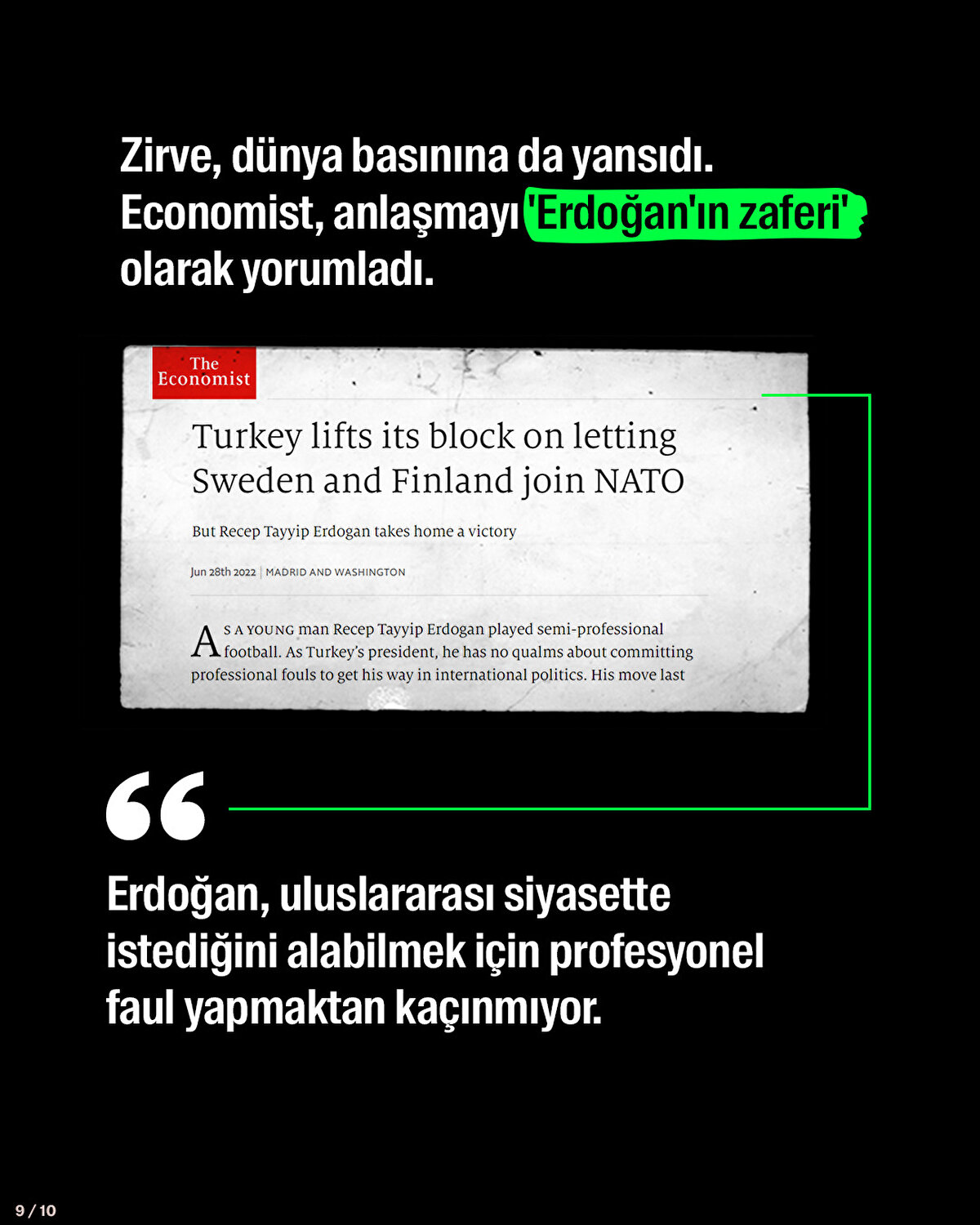 NATO Liderler Zirvesi'ne ev sahipliği yapan Madrid'de Türkiye-İsveç-Finlandiya arasında ortak bildiri imzalandı. Zirve, dünya basınına da yansıdı. Economist, anlaşmayı 'Erdoğan'ın zaferi' olarak yorumladı. New York Times ise bu gelişmenin 'Biden için bir zafer ve Putin'e bir darbe olduğunu' yazdı.