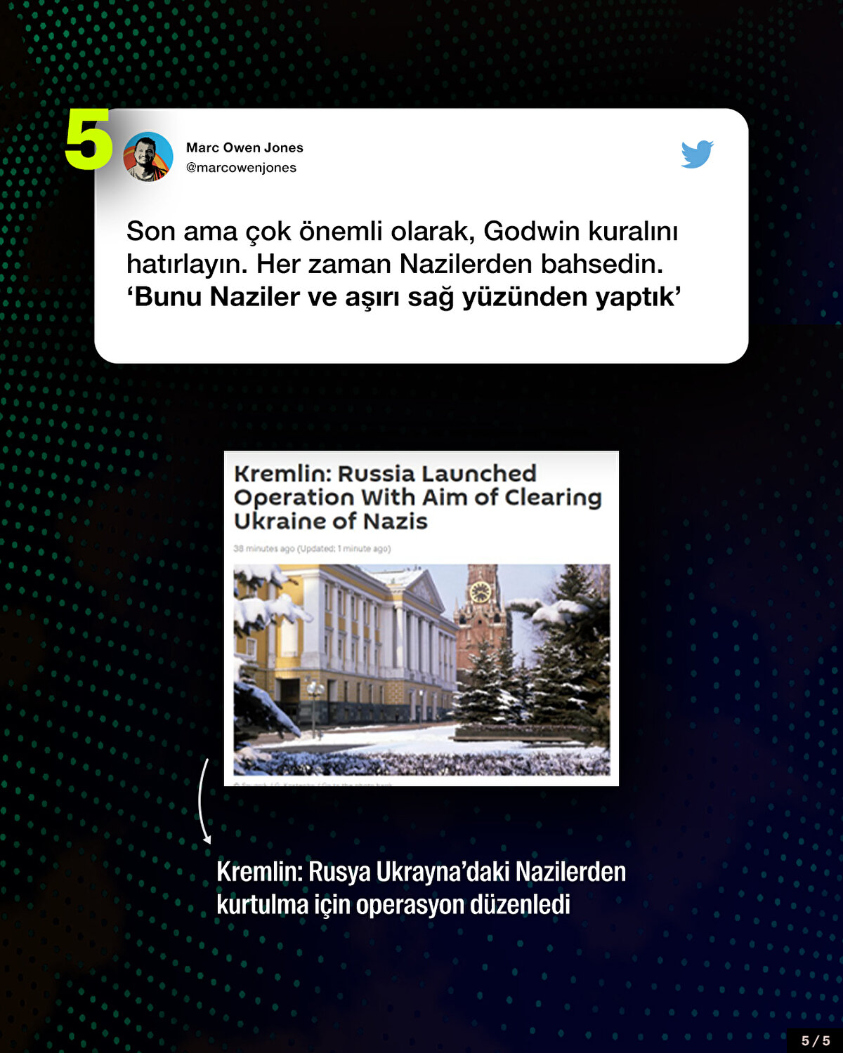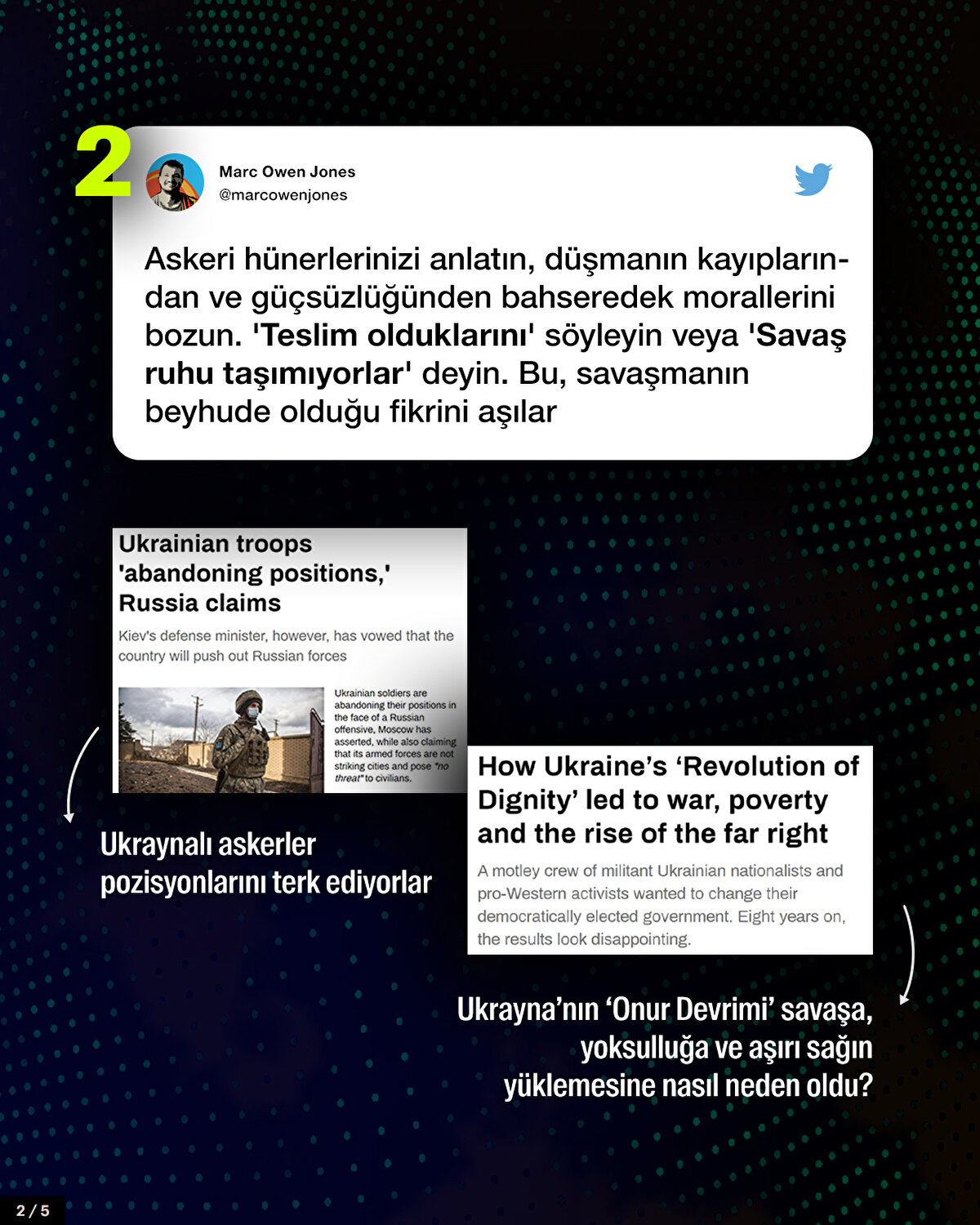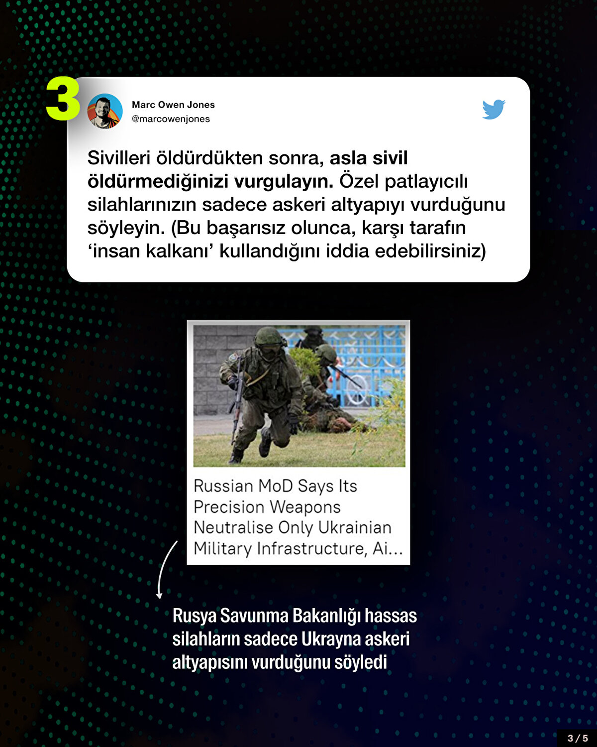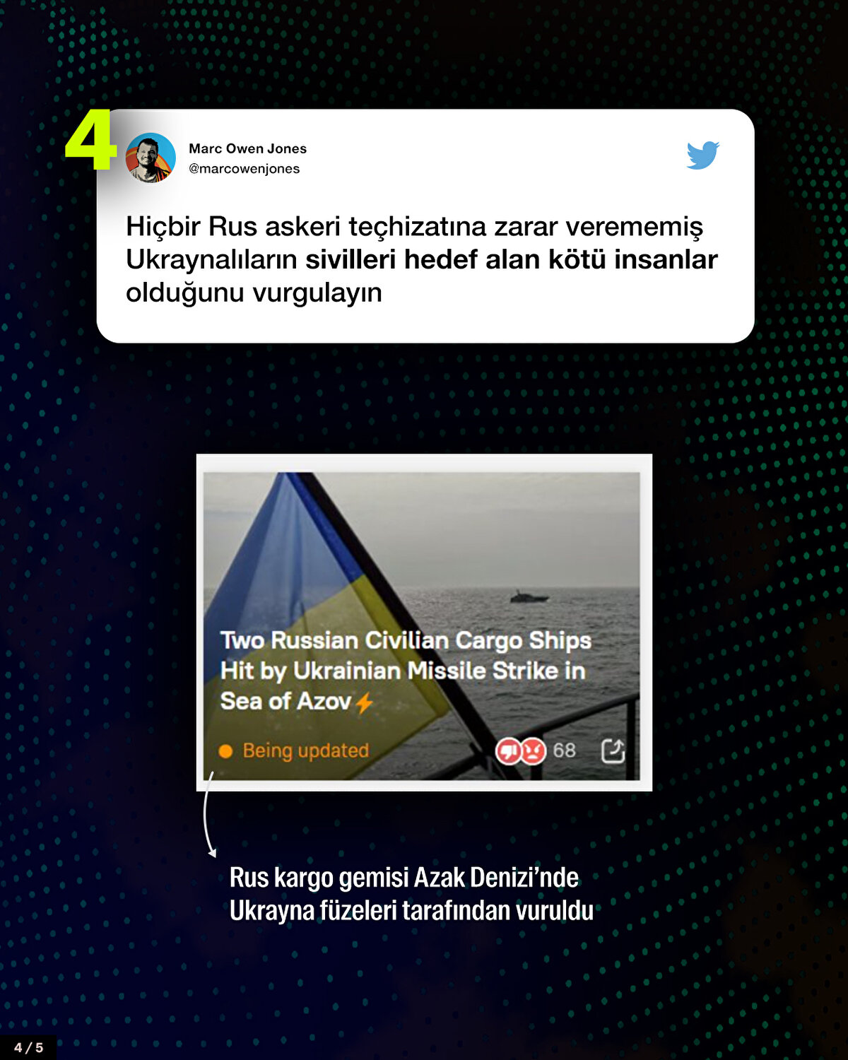 Sosyal medya ve dezenformasyon konularında çalışmalar yapan İngiliz uzman Marc Owen Jones, Rusya-Ukrayna savaşını mercek altına aldı. Twitter hesabından paylaşımlarla incelemelerini aktaran Jones, savaş propagandası analizi yaptı.