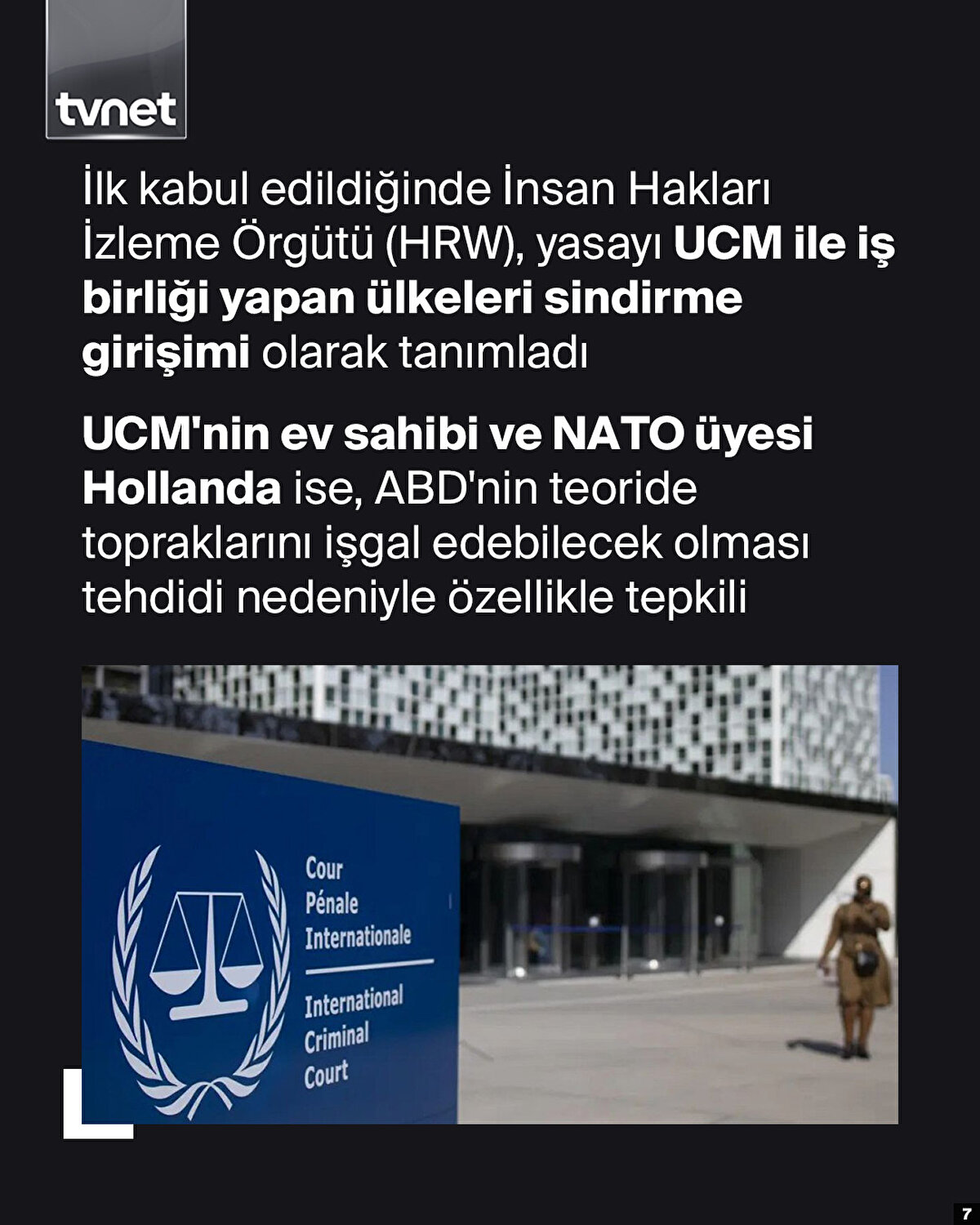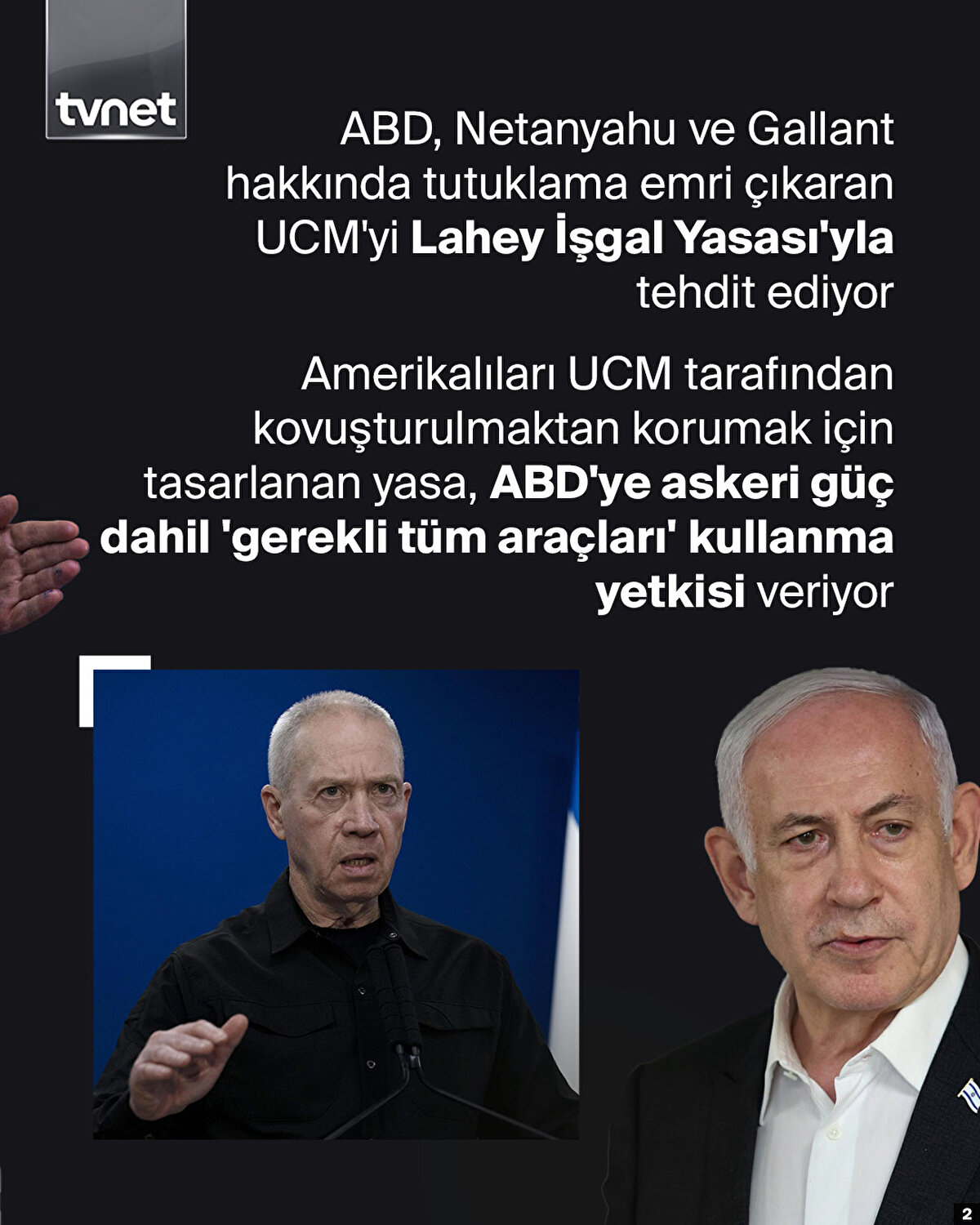 ABD, Netanyahu ve Galant hakkında tutuklama emri çıkaran UCM'yi Lahey İşgal Yasası'yla tehdit ediyor. Yasa teknik olarak ABD'nin, Hollanda'yı işgal etmesine ve UCM'nin gözaltına aldığı tüm Amerikalıları veya müttefiklerini serbest bırakmasına izin veriyor. İsrail bağlamında ise uluslararası adaletin sağlanmasını engellemek adına olası bir araç çünkü UCM'nin kararını uygulamakla yükümlü olan 124 üye ülke arasından buna yeltenecek olanlar için Lahey İşgal Yasası bir tehdit niteliğinde.