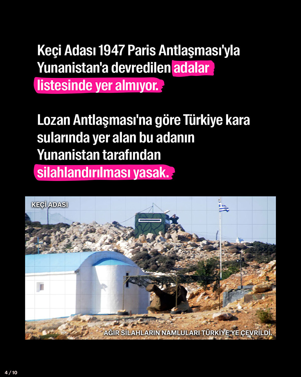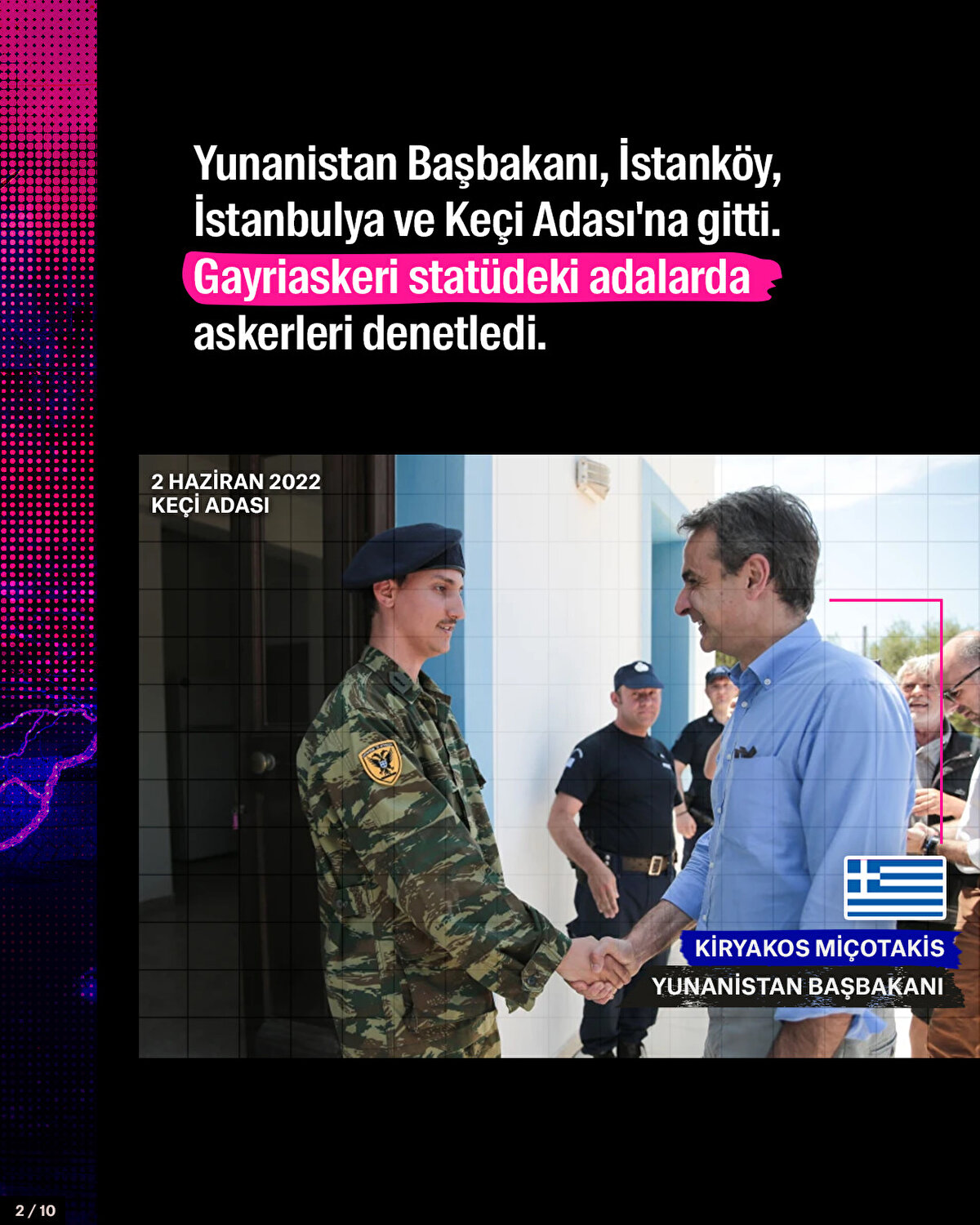 Yunanistan Başbakanı, İstanköy, İstanbulya ve Keçi Adası'na gitti. Gayriaskeri statüdeki adalarda askerleri denetledi. Keçi Adası 1947 Paris Antlaşması'yla Yunanistan'a devredilen adalar listesinde yer almıyor. Lozan Antlaşması'na göre Türkiye kara sularında yer alan bu adanın Yunanistan tarafından silahlandırılması yasak. Ancak Atina, diğer adalarda yaptığı gibi, uluslararası hukuku da çiğneyerek Keçi Adası'nı silahlandırıyor.