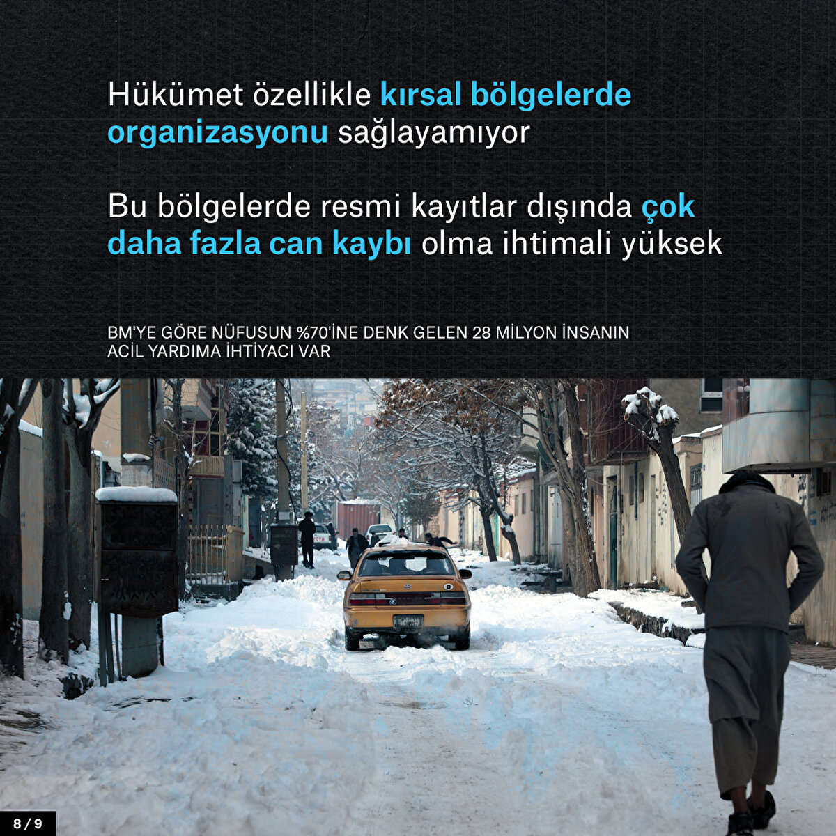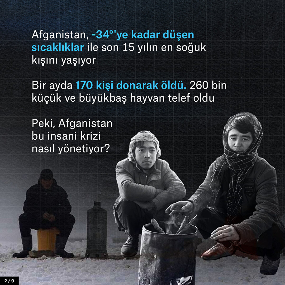 Afganistan, -34°'ye kadar düşen sıcaklıklar ile son 15 yılın en soğuk kışını yaşıyor. Bir ayda 170 kişi donarak öldü ve 260 bin küçük ve büyükbaş hayvan telef oldu. Peki, Afganistan bu insani krizi nasıl yönetiyor?