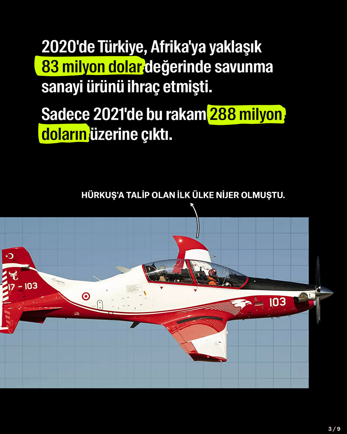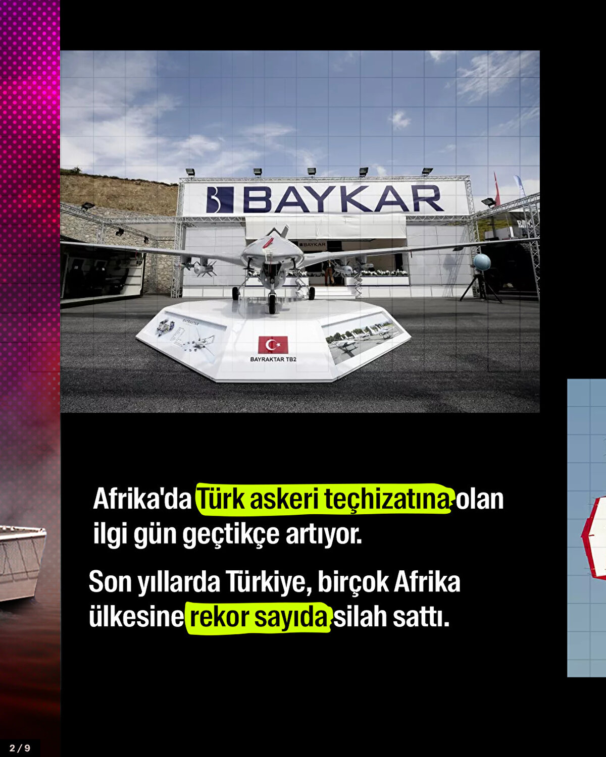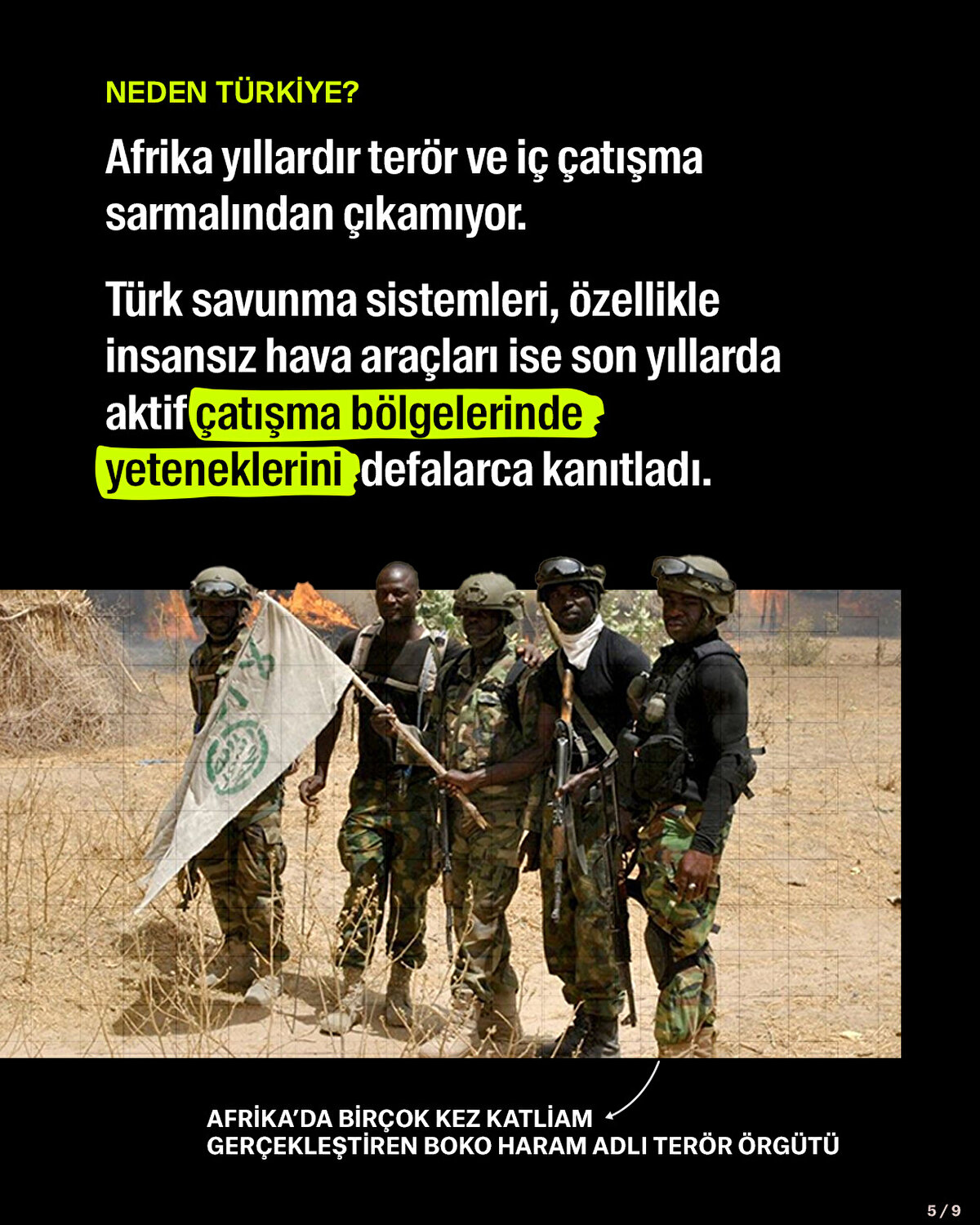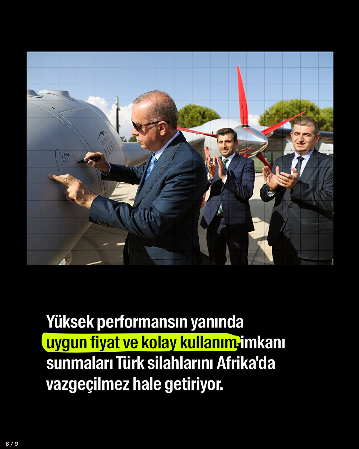 Afrika'da Türk askeri teçhizatına olan ilgi gün geçtikçe artıyor. Son yıllarda Türkiye, birçok Afrika ülkesine rekor sayıda silah sattı. Türk savunma sistemleri, özellikle insansız hava araçları bölgede tıkanan çatışmaların çözülmesine yardımcı oldu. Hatta bazı ülkelerde çatışmaların yayılmasını engelledi, buralarda siyasal istikrara katkı sağladı. Yüksek performansın yanında uygun fiyat ve kolay kullanım imkanı sunmaları Türk silahlarını Afrika'da vazgeçilmez hale getiriyor.