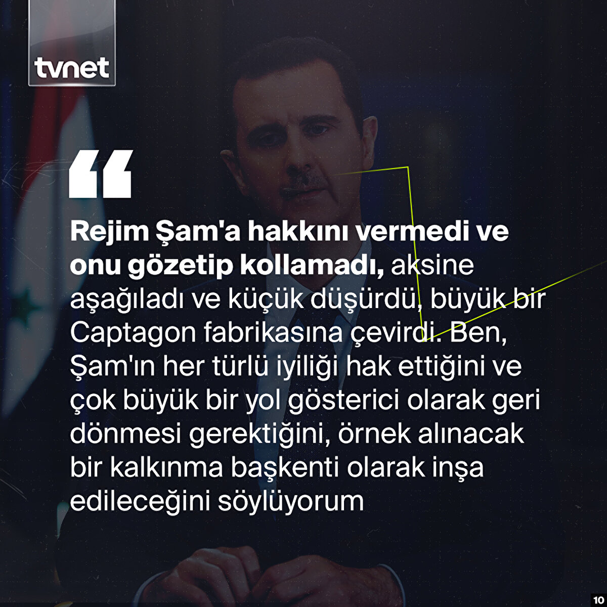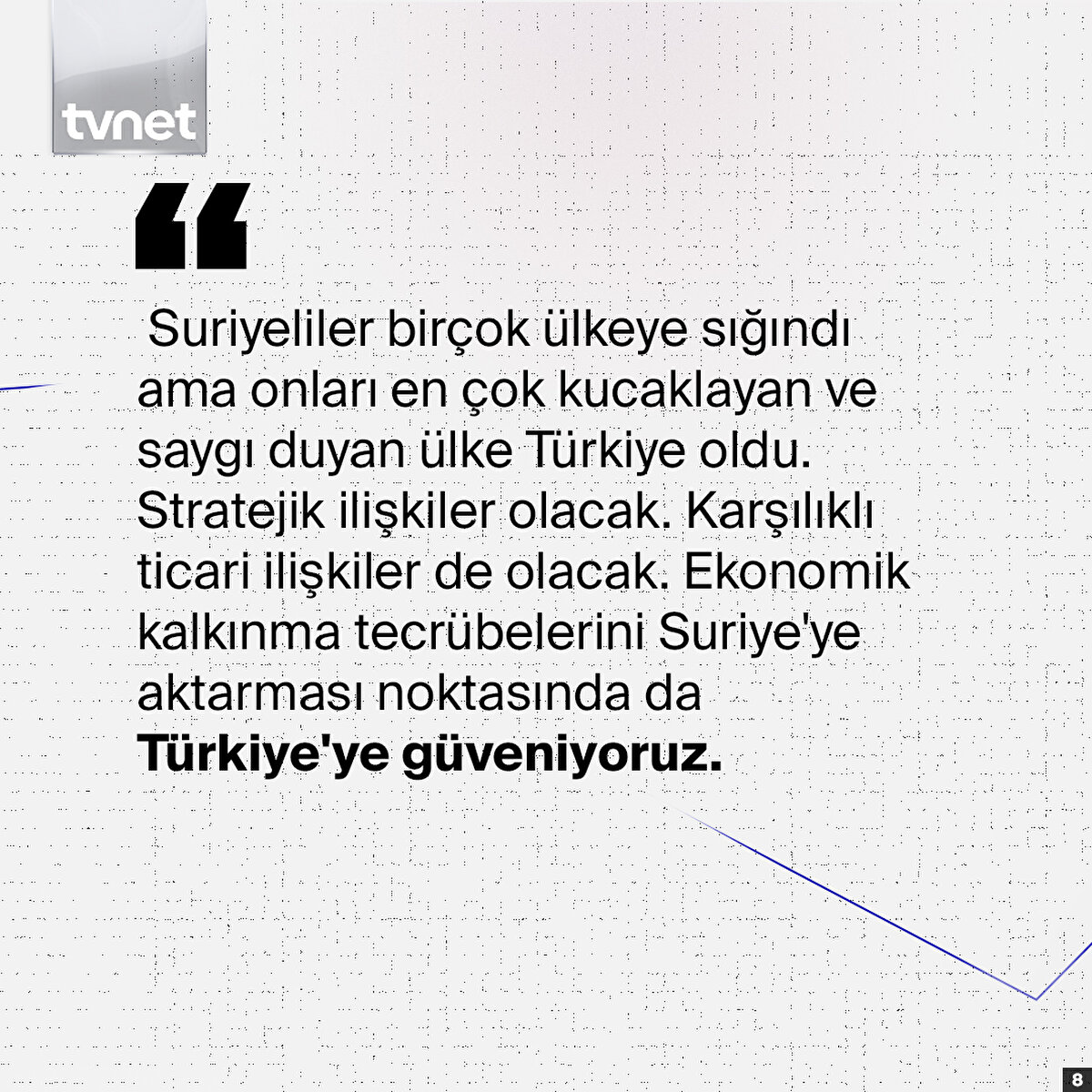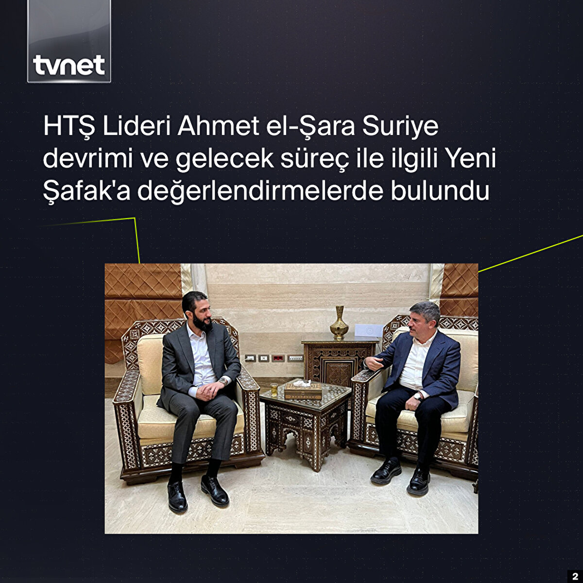 Baas rejimine son veren güçlerin komutanı Ahmed el-Şara, Şam'daki Başbakanlık Binasında Yeni Şafak'ın sorularını yanıtladı. Önceliklerinin halklarının sorunlarını çözmek, onların insan gibi yaşamalarına imkân verecek şartları oluşturmak ve ülkeyi kalkındırmak olduğunu söyleyen Ahmet el Şara, bu zaferin sadece Suriye halkının değil, Türkiye halkının da zaferi olduğunu ifade etti. Ahmet el Şara ayrıca Yeni Suriye devletinin inşasında Türkiye'nin birçok önceliği olduğunu da dile getirdi.