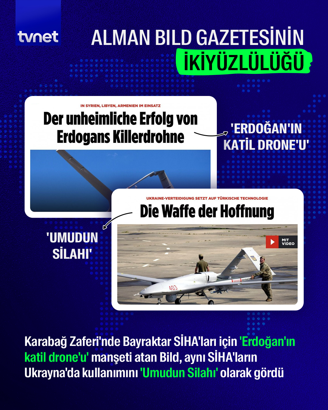 Azerbaycan'ın Karabağ'ı kurtarmasında büyük rol oynayan Bayraktar SİHA'ları için “Erdoğan'ın katil drone'u” tanımını yapan gazete, aynı SİHA'ların Ukrayna'da kullanılmasının ardından “Umudun Silahı Bayraktar” tanımını yaptı.