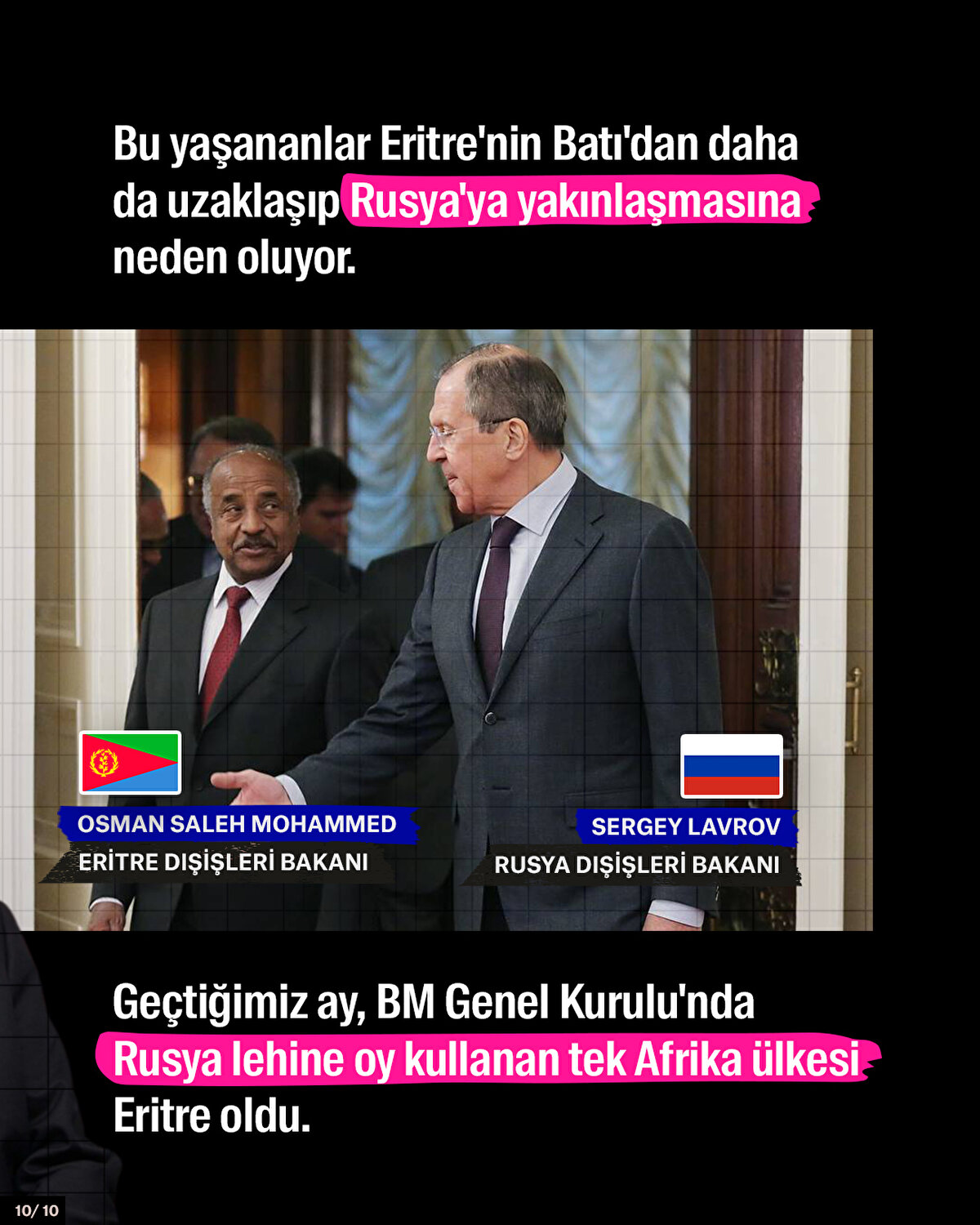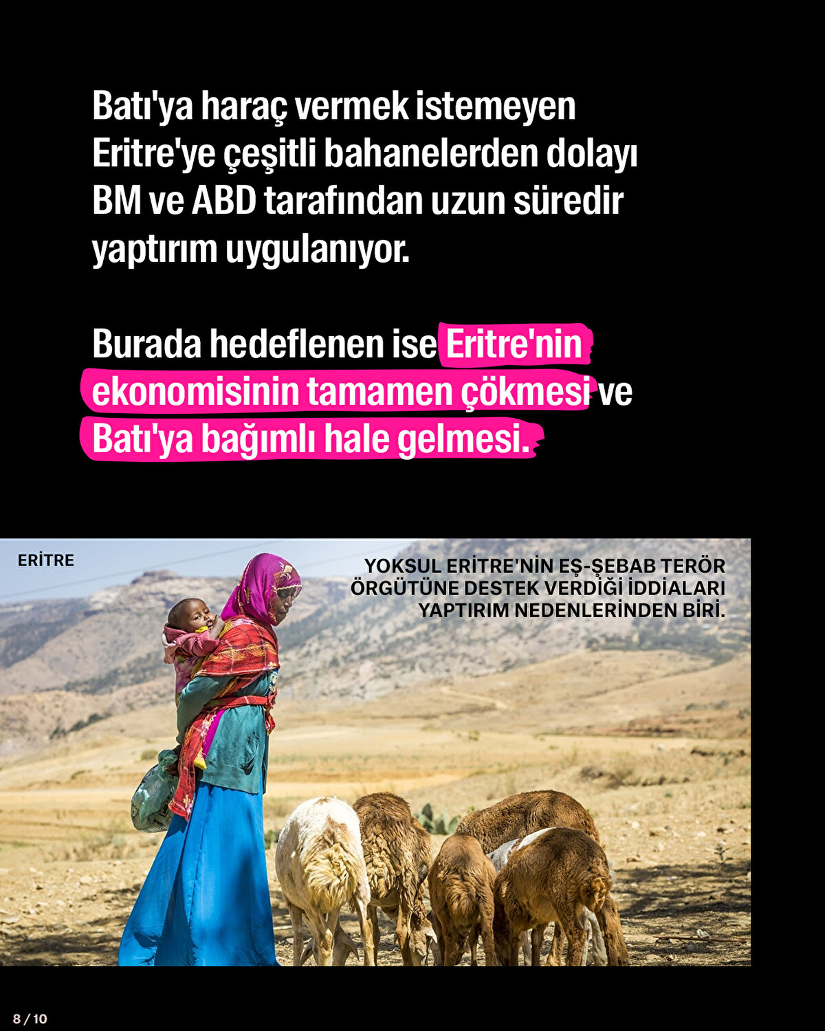 Batı'ya harç vermek istemeyen Eritre'ye çeşitli bahanelerden dolayı BM ve ABD tarafından uzun süredir yaptırım uygulanıyor.
