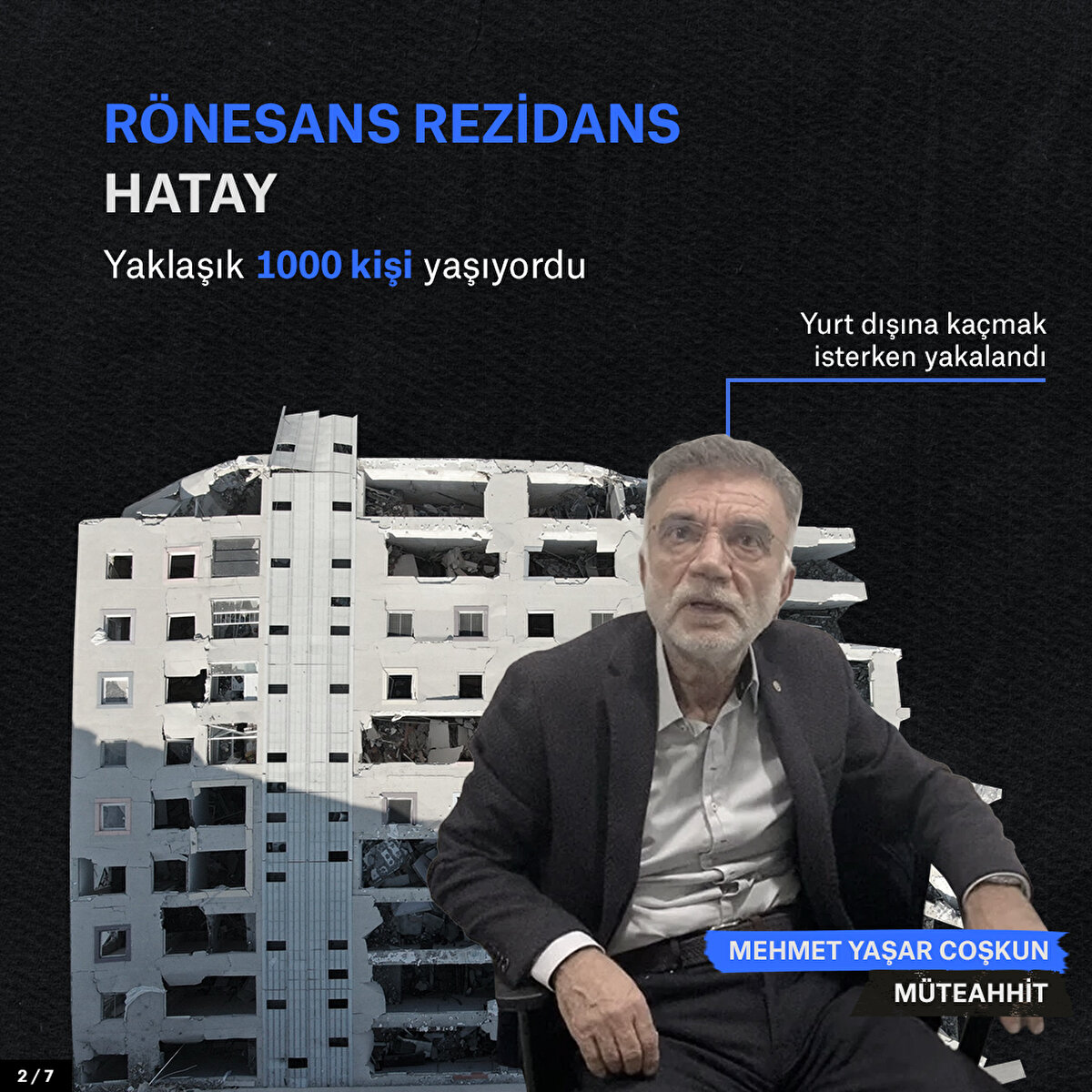 Bin avukat, yıkılan binaların müteahhitleri hakkında işlem yapılması için savcılığa başvurdu. Hatay'ın en lüks yapılarından Rönesans Rezidans yıkıldı ve birçok insana mezar oldu. Rezidansın müteahhidi Mehmet Yaşar Coşkun, yurt dışına kaçmak üzereyken yakalandı. Yıkımlardan sorumlu müteahhitlere bakalım.