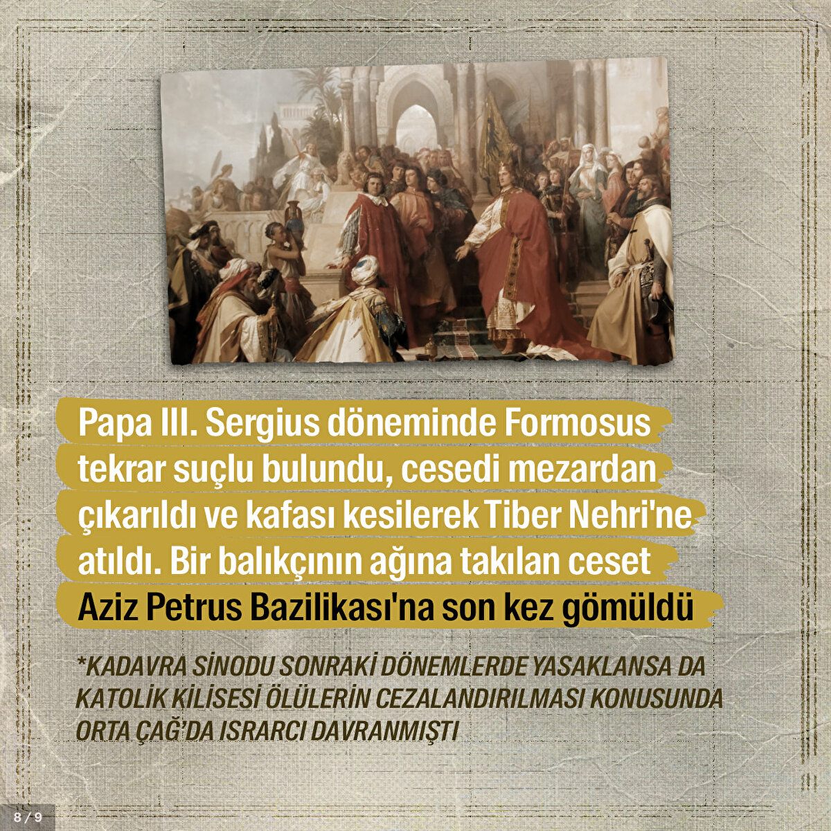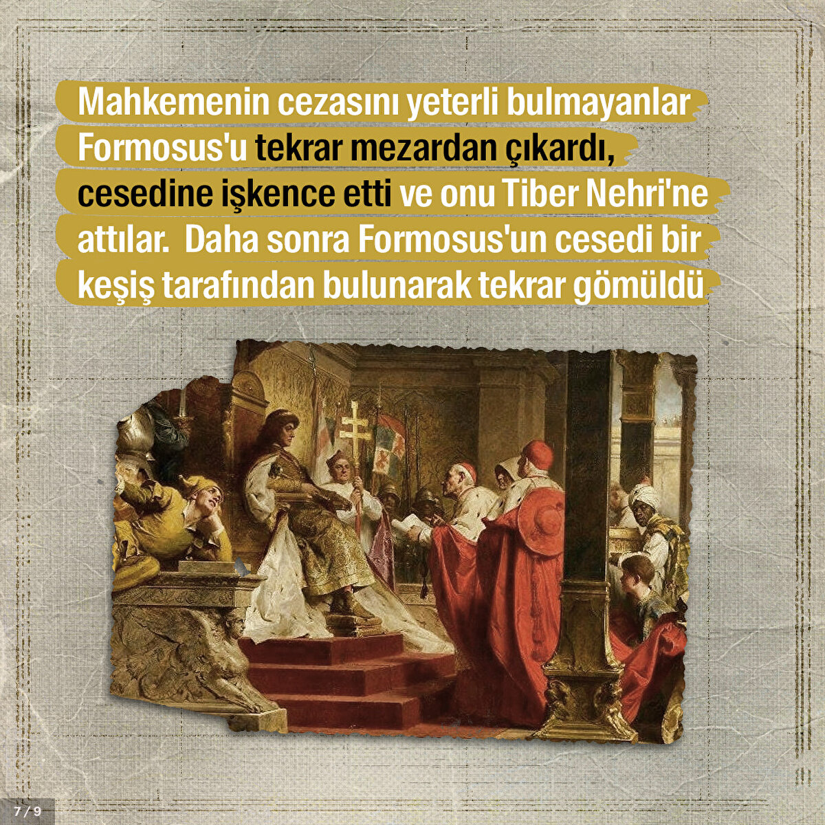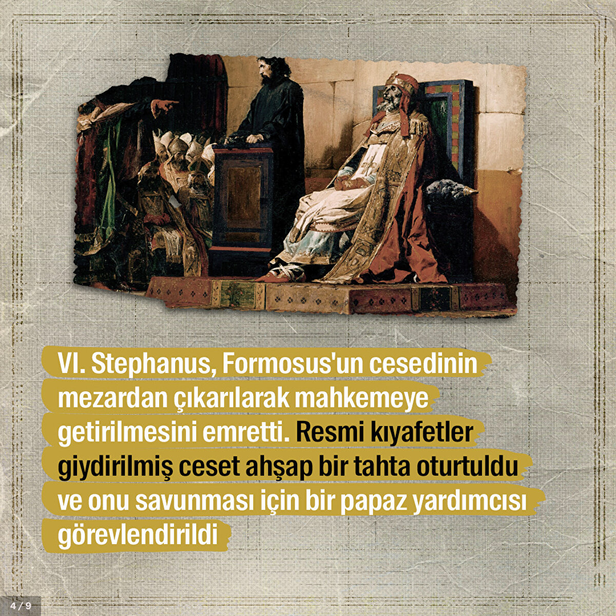 Papa Formosus işlediği suçlar yüzünden yargılanması kaçınılmazdı. Çünkü papalık tarih boyunca Roma'nın güç mücadelesinde önemli bir yere sahipti. Kilise kanunlarını ihlal ettiği öne sürülen Formosus'un cesedi sanık koltuğuna nasıl oturtuldu ve kendisini savunması için neler yapıldı?