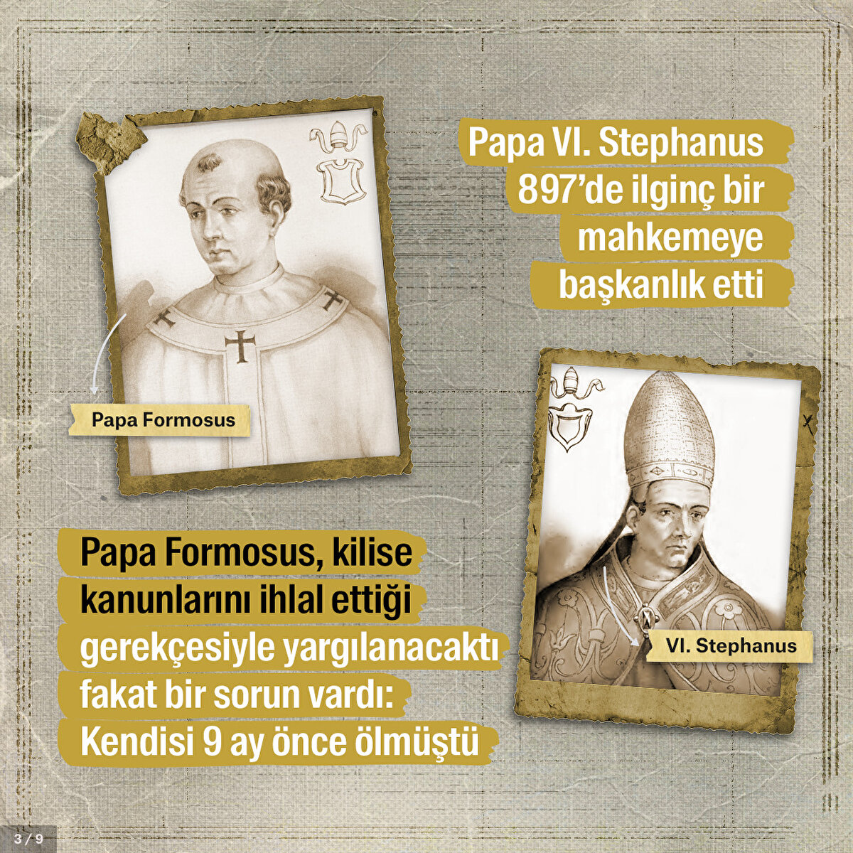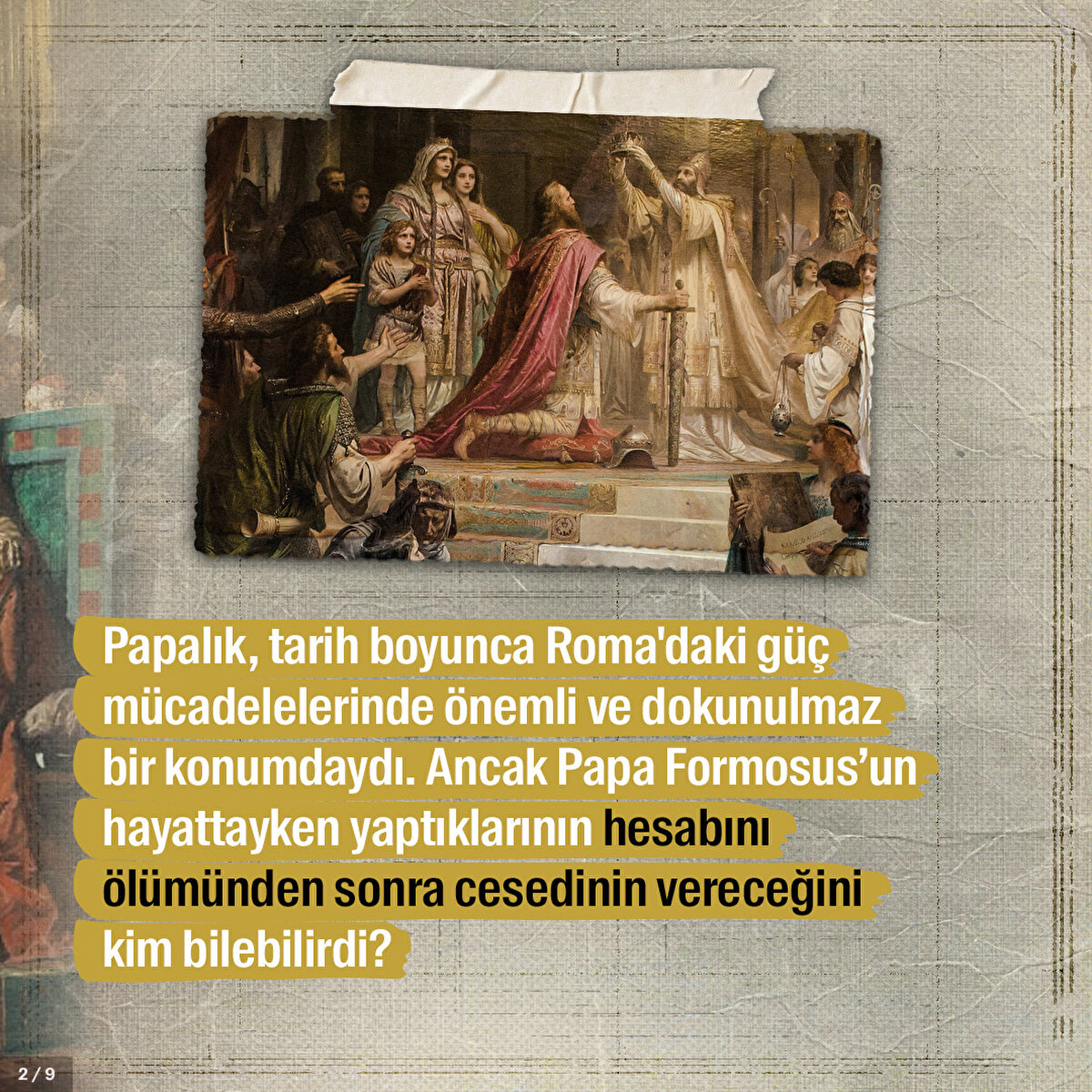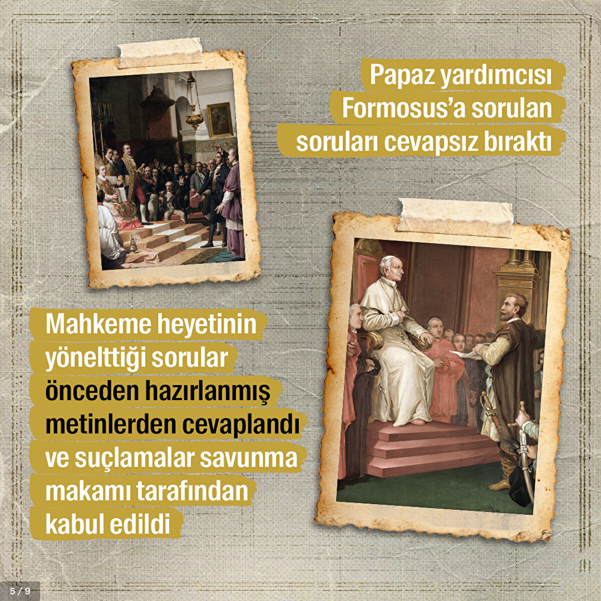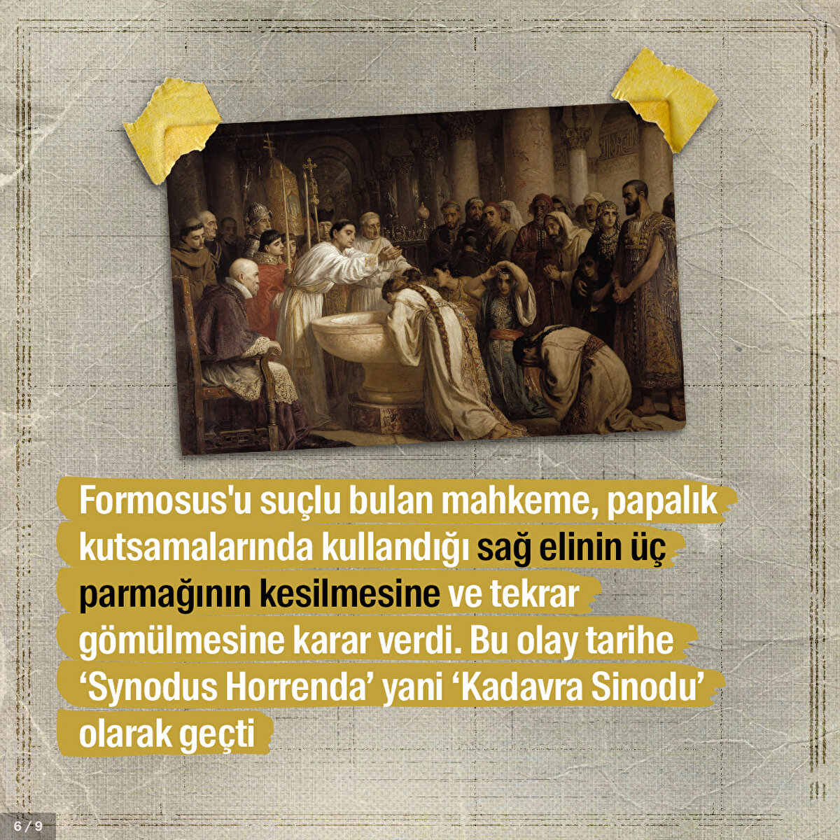 Papa Formosus işlediği suçlar yüzünden yargılanması kaçınılmazdı. Çünkü papalık tarih boyunca Roma'nın güç mücadelesinde önemli bir yere sahipti. Kilise kanunlarını ihlal ettiği öne sürülen Formosus'un cesedi sanık koltuğuna nasıl oturtuldu ve kendisini savunması için neler yapıldı?