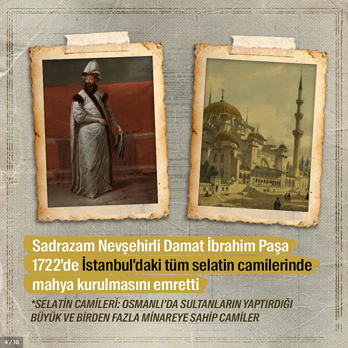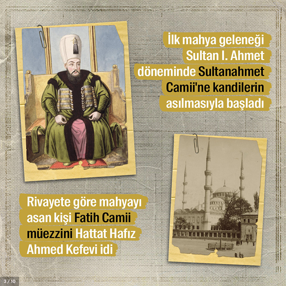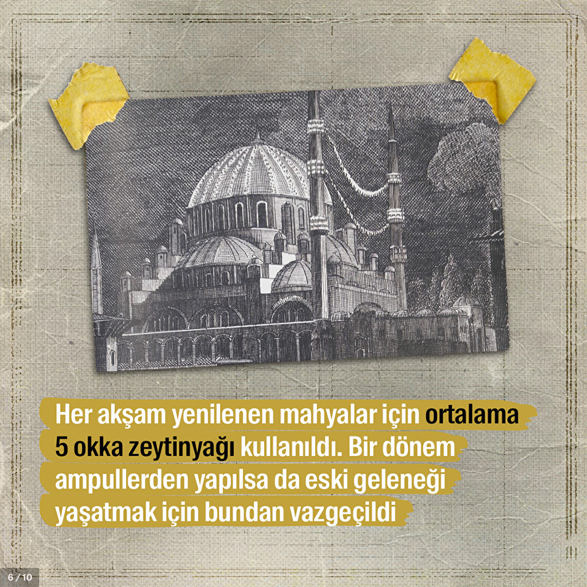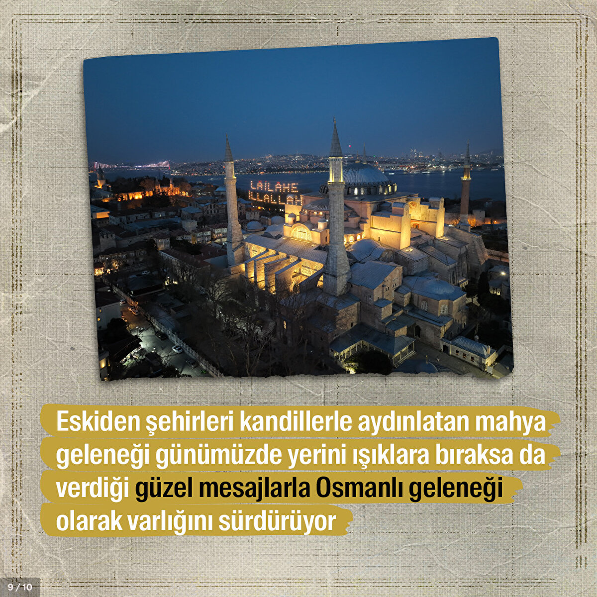 Camilerde kandil yakma geleneği İslamiyet'in ilk yıllarından itibaren varlığını sürdürse de, minarelerde kandil yakılması yalnızca Osmanlı'ya has bir gelenek. Ayet, hadis veya gül, Ay gibi motifleriyle şehri aydınlatan mahyalar, 16. yüzyıldan itibaren verdiği güzel mesajlarla insanları iyiliğe teşvik etmeye devam ediyor.