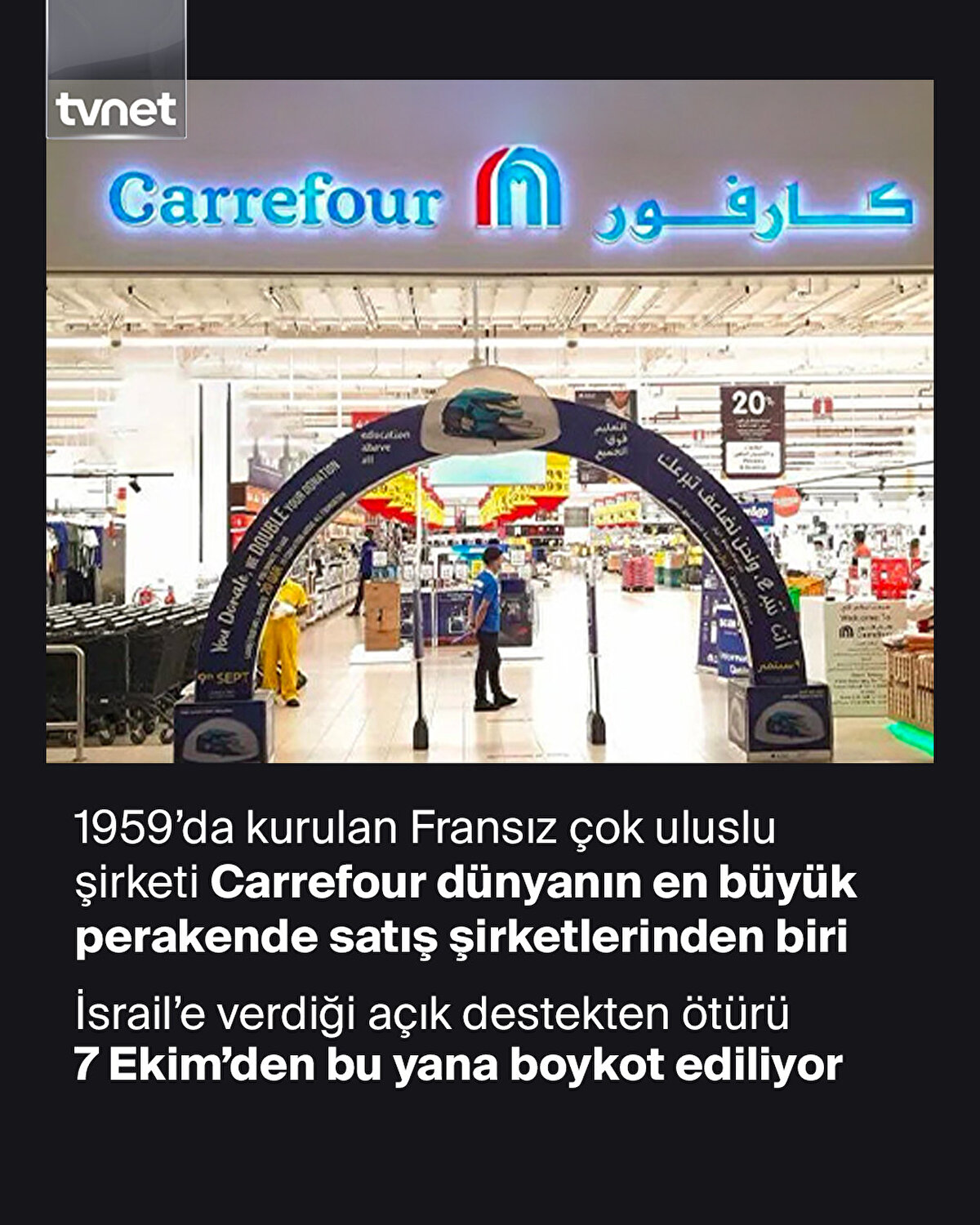 Carrefour, 1959'da kurulan Fransız çok uluslu şirketi Carrefour dünyanın en büyük perakende satış şirketlerinden biri. İsrail'e verdiği açık destekten ötürü 7 Ekim'den bu yana boykot ediliyor. İsrail ordusuna insanî yardım setleri hazırlayıp doğrudan destek sağlayan sayılı markadan biri. Öyle ki katil orduya ücretsiz yiyecek ve kişisel bakım paketleri gönderdiği defaatle kayıt altına alındı ve sosyal medyada dolaşıyor. Bu durum boykot hassasiyetini körükledi ve tüketicileri alternatif markalara yönlendirdi. Facebook'ta yaptığı resmî açıklamada haberi şöyle duyurdu: "Carrefour, 4 Kasım 2024'ten itibaren Ürdün'deki tüm operasyonlarını durduracak ve artık Krallık içinde faaliyet göstermeyecektir"