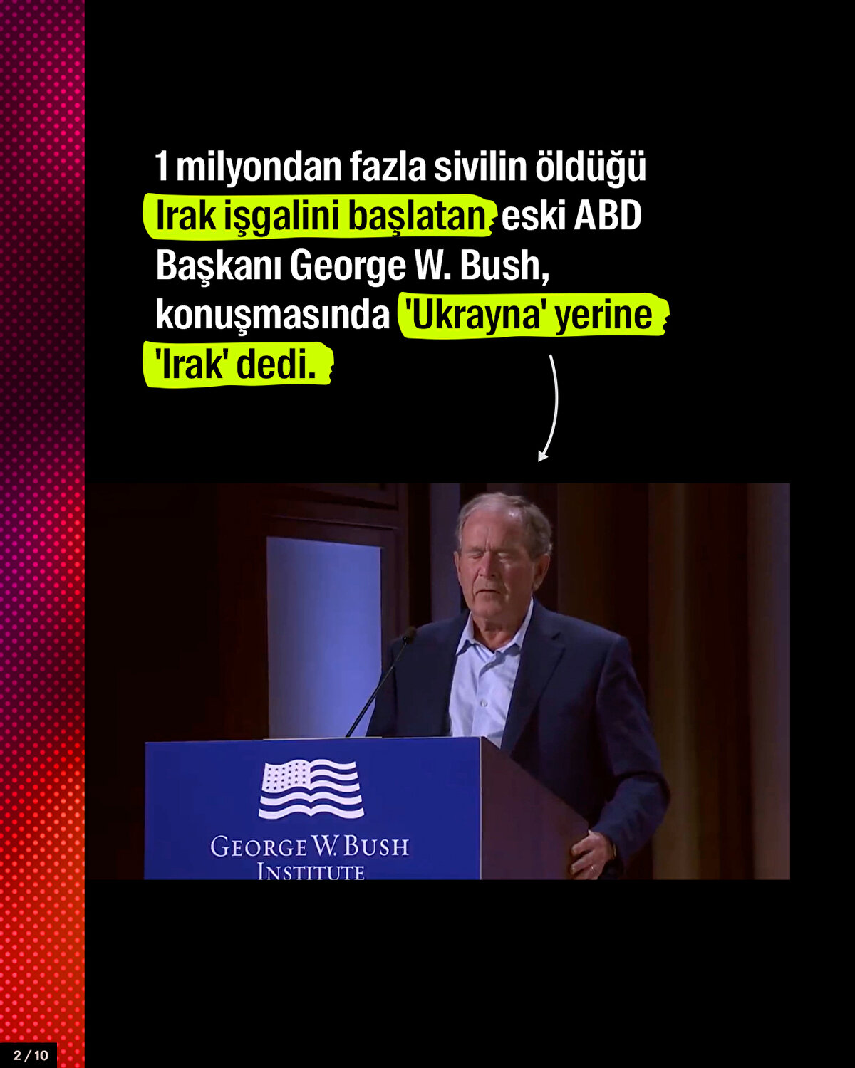 1 milyondan fazla sivilin öldüğü Irak işgalini başlatan eski ABD Başkanı George W. Bush, konuşmasında 'Ukrayna' yerine 'Irak' dedi.