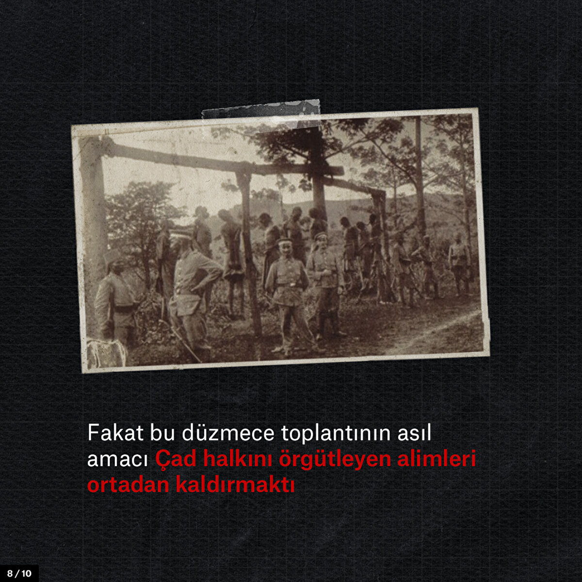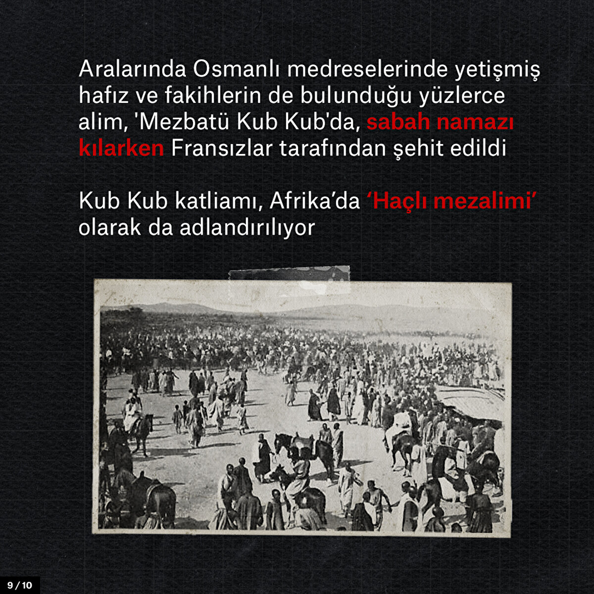 Tarihini sömürgecilik üzerine inşa etmiş Fransa'nın sayısız zulümlerinden biri de Kub Kub katliamıdır. Karanlık geçmişine bir iz olarak bıraktığı bu katliamda 400 Çadlı İslam alimi acımasızca öldürüldü. Bunun tek sebebi ise alimlerin Fransa'nın ülkeyi soktuğu ekonomik kriz ve dinden uzaklaştırma politikalarına karşı direniş göstermeleriydi. Osmanlı medreselerinde yetişmiş hafız ve fakihlerin de öldürüldüğü bu olay, Afrikalılar tarafından 'Haçlı mezalimi' olarak görülüyor.