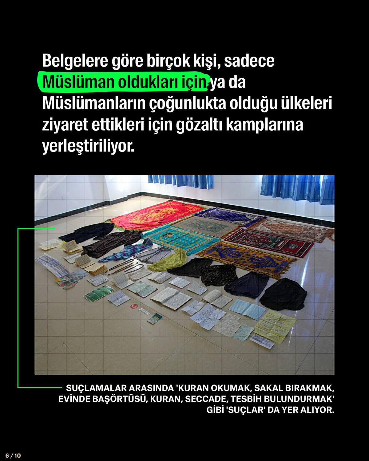 Belgelere göre birçok kişi, sadece Müslüman oldukları için ya da Müslümanların çoğunlukta olduğu ülkeleri ziyaret ettikleri için gözaltı kamplarına yerleştiriliyor. Çin ise kanıtlara dayalı bu bilgileri yalanlıyor.