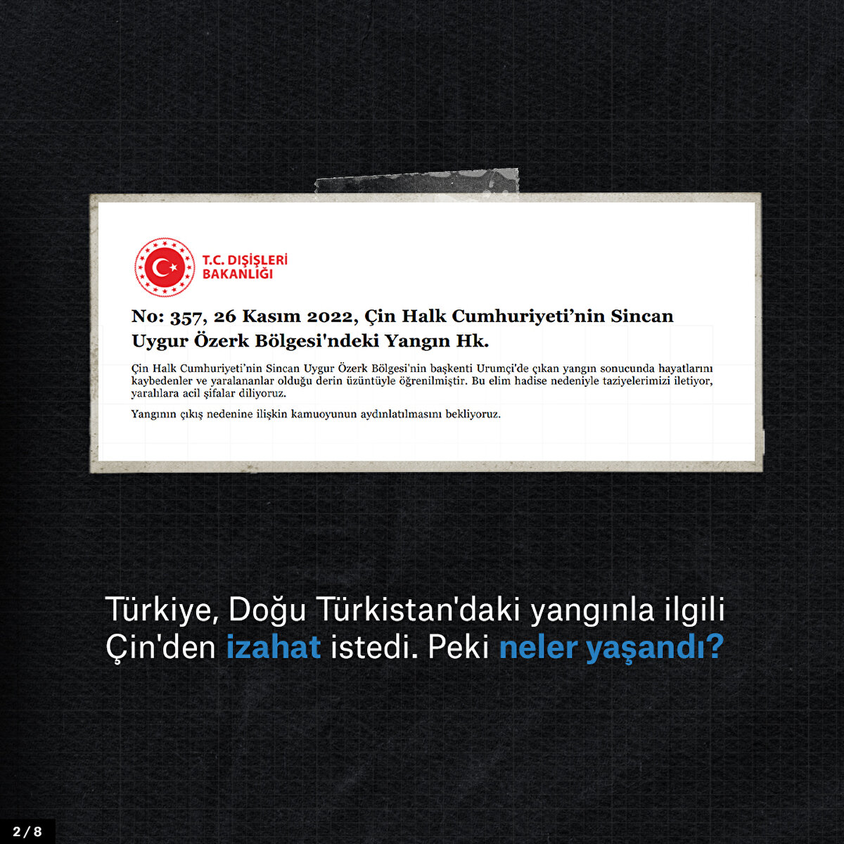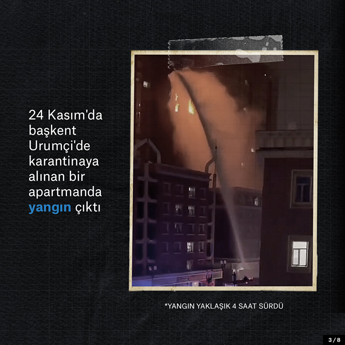 Türkiye, Doğu Türkistan'daki yangınla ilgili Çin'den izahat istedi. Peki neler yaşandı? 24 Kasım'da başkent Urumçi'de karantinaya alınan bir apartmanda yangın çıktı. Pandemi bahanesiyle kapılarına kilit vurulan çok sayıda Uygur Türkü dışarı çıkamadı; alevlerin arasında kaldı. Çocukların da aralarında bulunduğu 40'tan fazla kişi yanarak hayatını kaybetti.