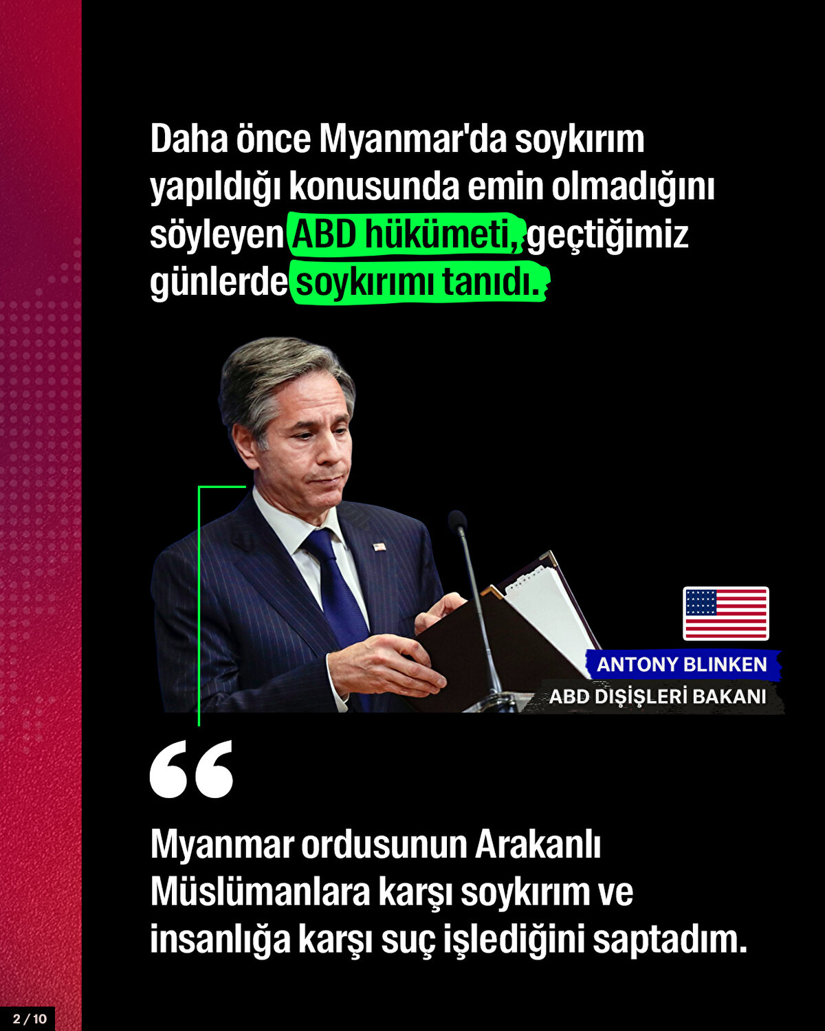 Daha önce Myanmar'da soykırım yapıldığı konusunda emin olmadığını söyleyen ABD hükümeti, geçtiğimiz günlerde soykırımı tanıdı.