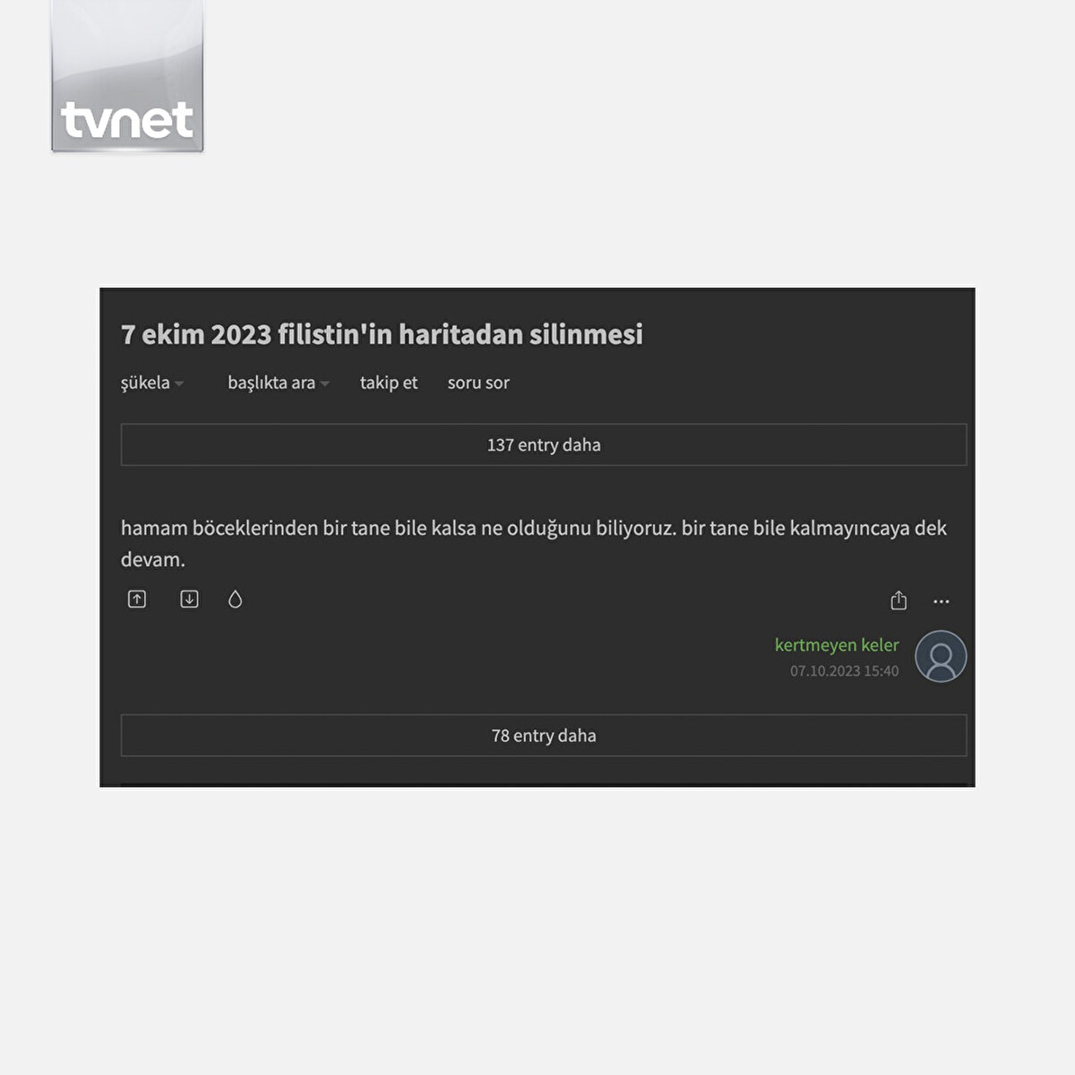 Başak Purut'un sahibi olduğu Ekşi Sözlük'te Filistinlilere soykırım çağrısı yapılıyor. Görüldüğü üzere hakaret, küfür içerikli ve hatta Filistinlileri insan yerine koymayan nefret söylemleri ekşi sözlükte kendine yer bulabiliyor. İddialara göre tam aksine İsrail hakkında en ufak bir olumsuz söylem giren yazarların hesabı hızla kapatılıyor.