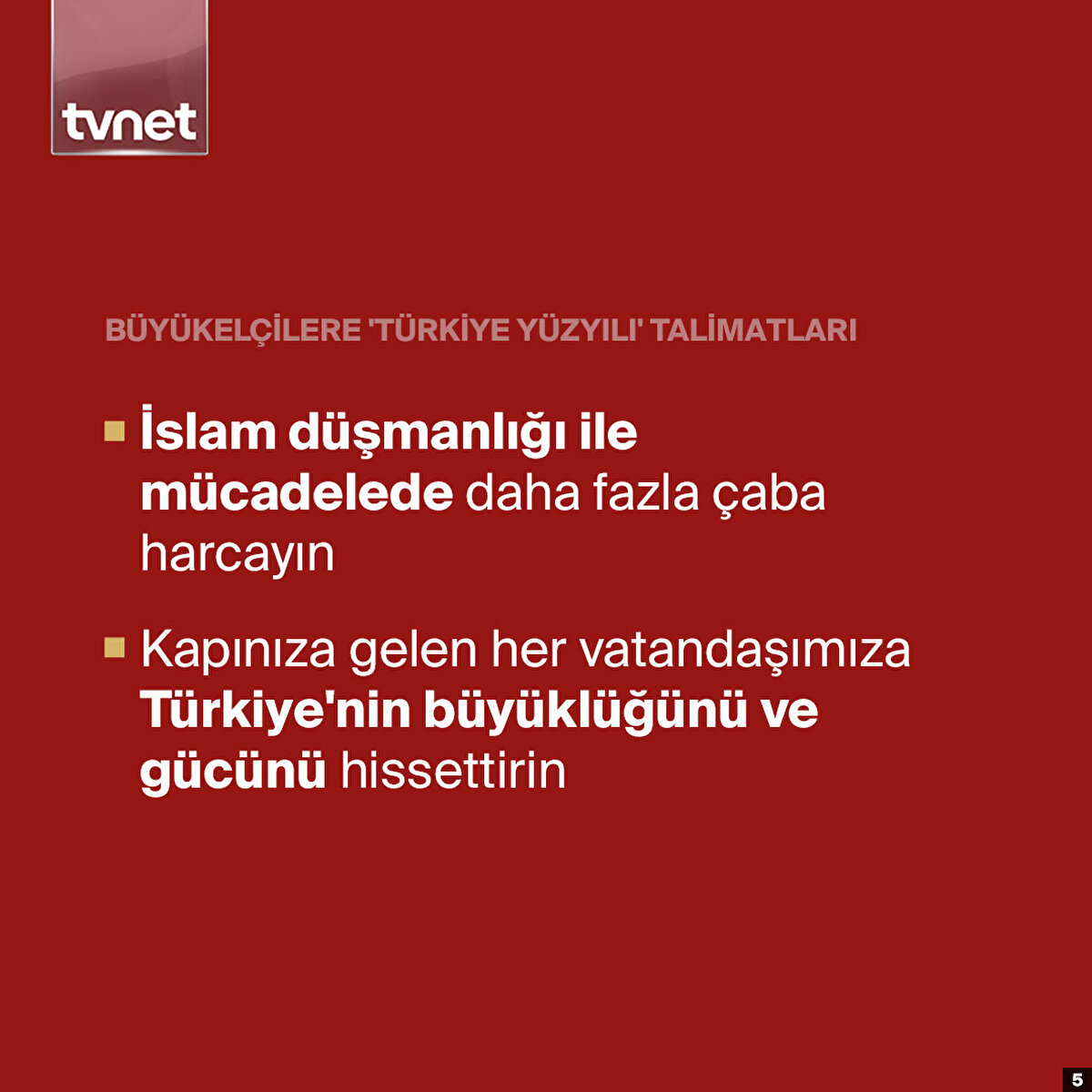 2008'den beri düzenlenen Büyükelçiler Konferansı'nın 14'üncüsü, bu yıl 5-9 Ağustos'ta Ankara'da gerçekleştirilecek. Cumhurbaşkanı Erdoğan, Cumhurbaşkanlığı Külliyesi'ndeki konferansta katılımcılara hitap etti ve büyükelçilere bazı talimatlarda bulundu. Türkiye Yüzyılı vizyonuna sahip çıkılmasını isteyen Erdoğan, İslam düşmanlığı ile mücadelede daha fazla çaba harcanması gerektiğini vurguladı.