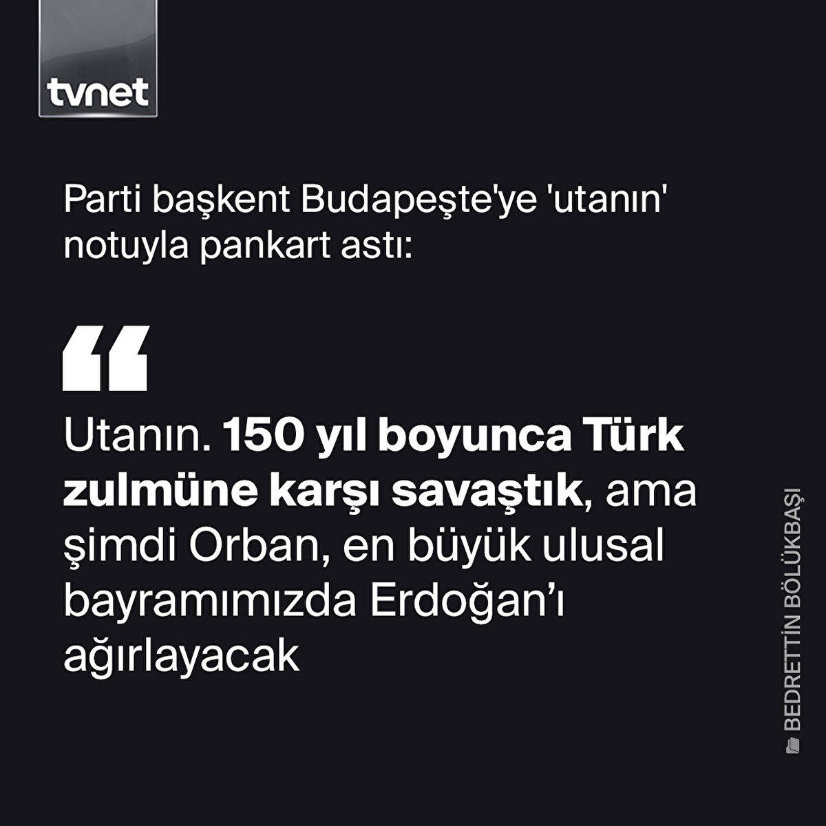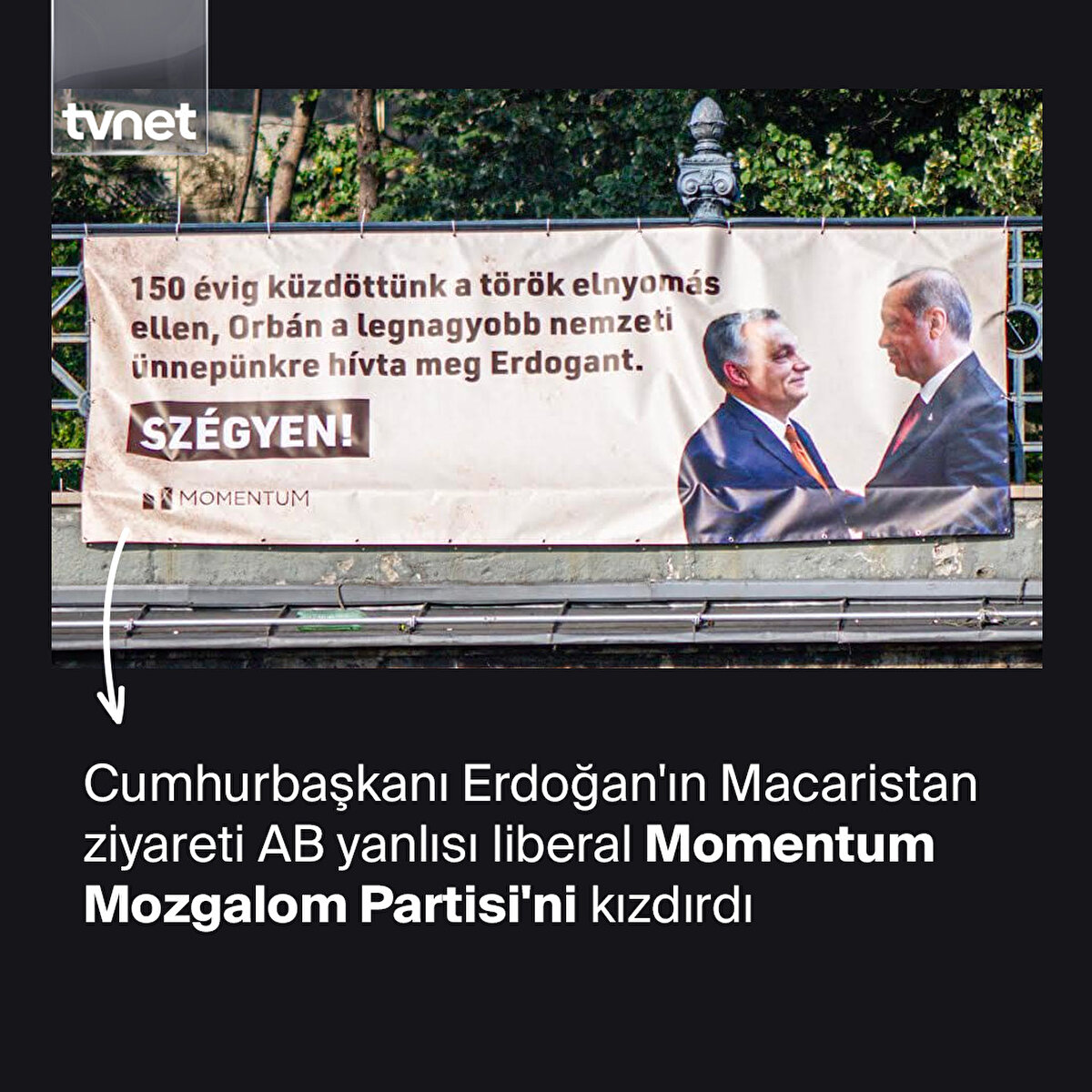Recep Tayyip Erdoğan bugün Macaristan'a günübirlik ziyaret gerçekleştirecek. Ancak bu ziyaret liberal ve AB yanlısı muhalefet partisi Momentum Mozgalom'u pek de memnun etmedi. Öyle ki parti tarafından Budapeşte'ye bir pankart asıldı. Pankarttaki ifadeler ise Cumhurbaşkanı Erdoğan'a duydukları rahatsızlığı alenen belli ediyor. Pankartta "Utanın. 150 yıl boyunca Türk zulmüne karşı savaştık, ama şimdi Orban, en büyük ulusal bayramımızda Erdoğan'ı ağırlayacak" ifadeleri yer alıyor.