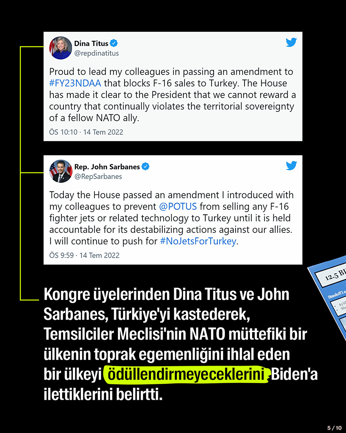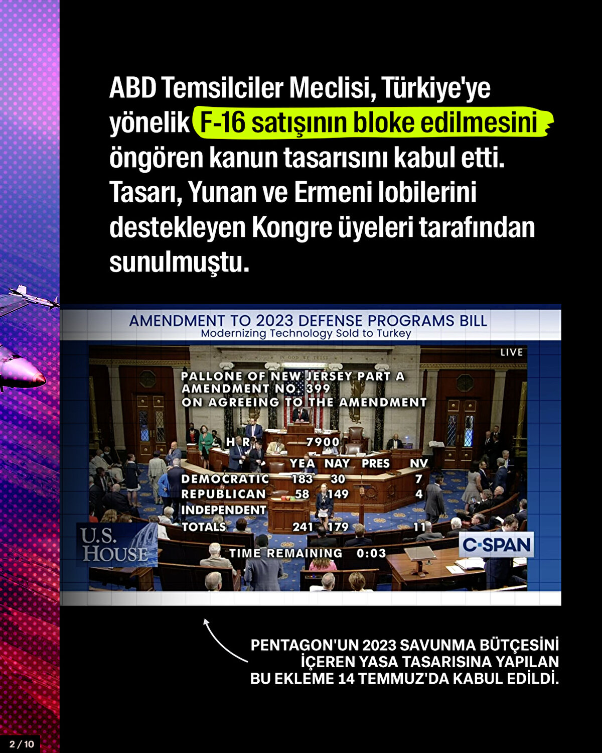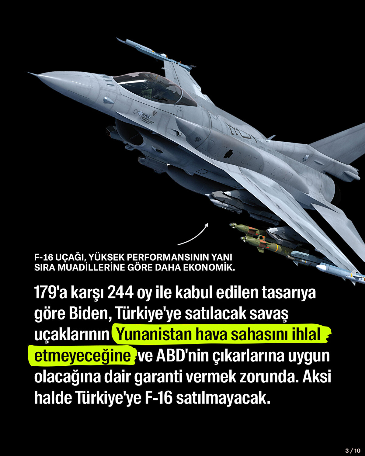 ABD Temsilciler Meclisi, Türkiye'ye yönelik F-16 satışının bloke edilmesini öngören kanun tasarısını kabul etti. Tasarı, Yunan ve Ermeni lobilerini destekleyen Kongre üyeleri tarafından sunulmuştu. 179'a karşı 244 oy ile kabul edilen tasarıya göre Biden, Türkiye'ye satılacak savaş uçaklarının Yunanistan hava sahasını ihlal etmeyeceğine ve ABD'nin çıkarlarına uygun olacağına dair garanti vermek zorunda. Aksi halde Türkiye'ye F-16 satılmayacak.