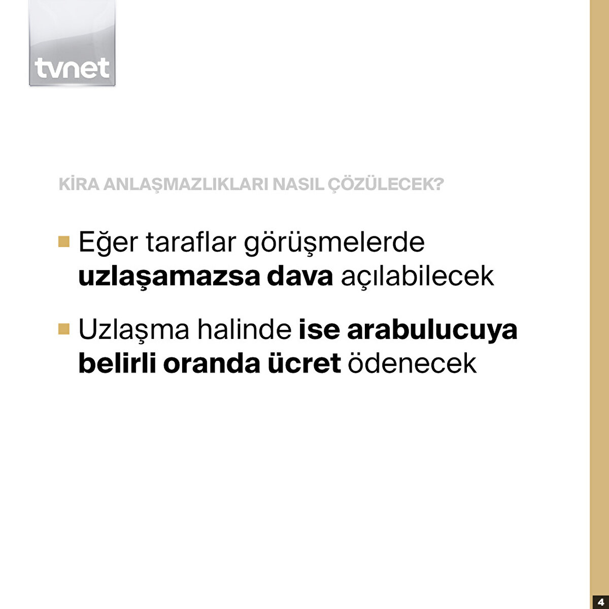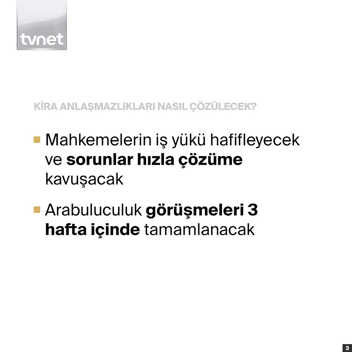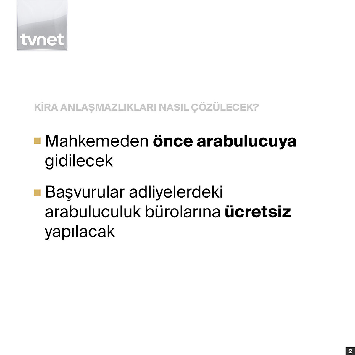 Ev sahipleri ile kiracılar arasındaki anlaşmazlıklar son iki yıldır gündemde ve mahkemelere taşınan davaların sayısı bir hayli yüksek. Yeni uygulama ile sorunlar mahkemeden önce arabulucuyla çözülecek. Başvurular adliyelerdeki arabuluculuk bürolarına ücretsiz yapılacak. 3 hafta içerisinde tamamlanacak arabuluculuk görüşmelerinde taraflar arasında uzlaşma sağlanmaya çalışılacak. Uzlaşma halinde ise arabulucuya belirli oranda ücret ödenecek. Uzlaşma sağlanamaması halindeyse mahkemeye gidilip dava açılabilecek. Yeni uygulama sayesinde mahkemelerin iş yükü hafifleyecek ve sorunlar hızla çözüme kavuşacak