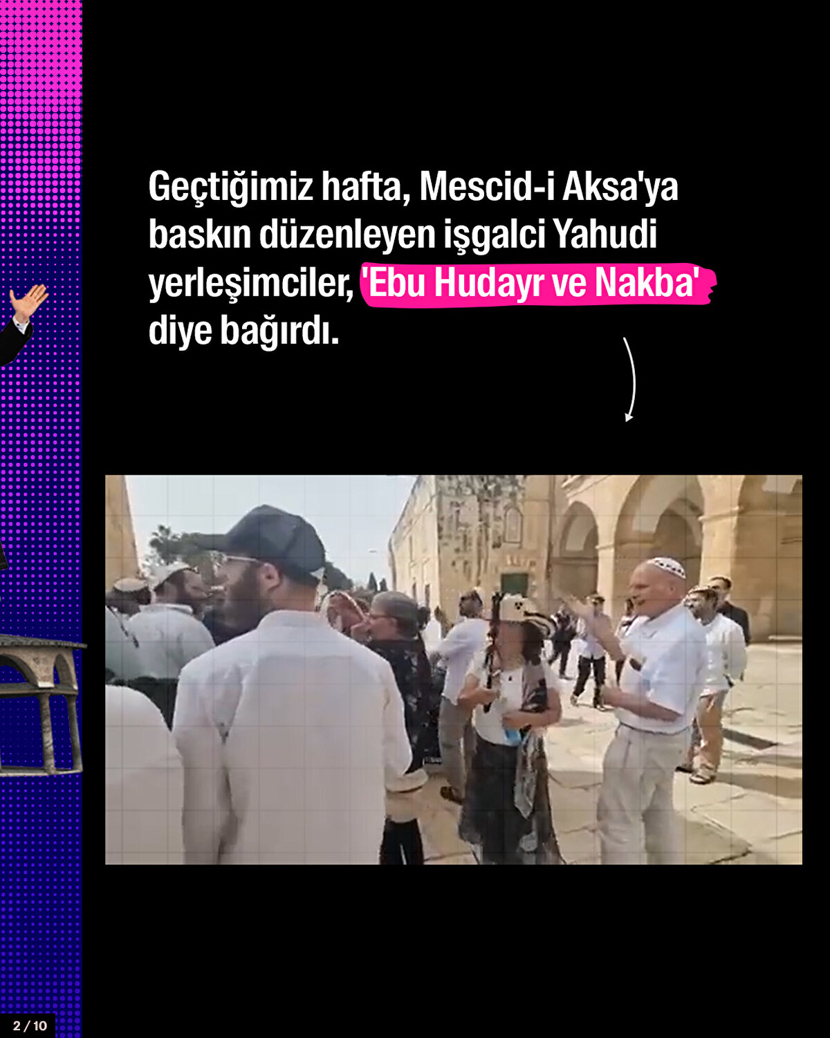 Geçtiğimiz hafta, Mescid-i Aksa'ya baskın düzenleyen işgalci Yahudi yerleşimciler, Filistinlileri kışkırtmak için 'Ebu Hudayr ve Nakba' diye bağırdı.