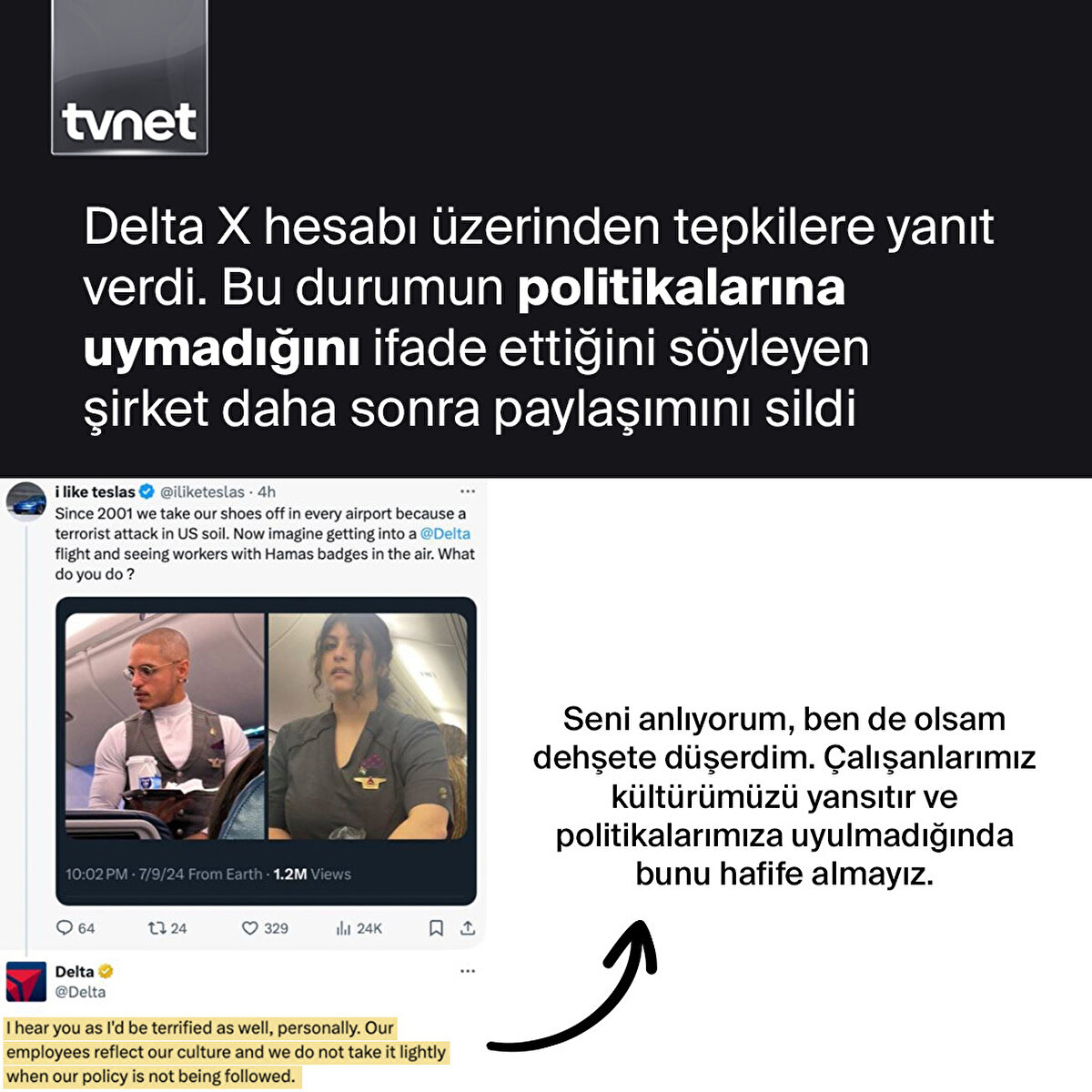 Delta Hava Yolları'nın Boston-West Palm Beach uçuşunda bir uçuş görevlisinin Filistin rozeti takması tepki topladı. Delta X hesabı üzerinden tepkilere yanıt verdi. Bu durumun politikalarına uymadığını ifade ettiğini söyleyen şirket daha sonra paylaşımını sildi.