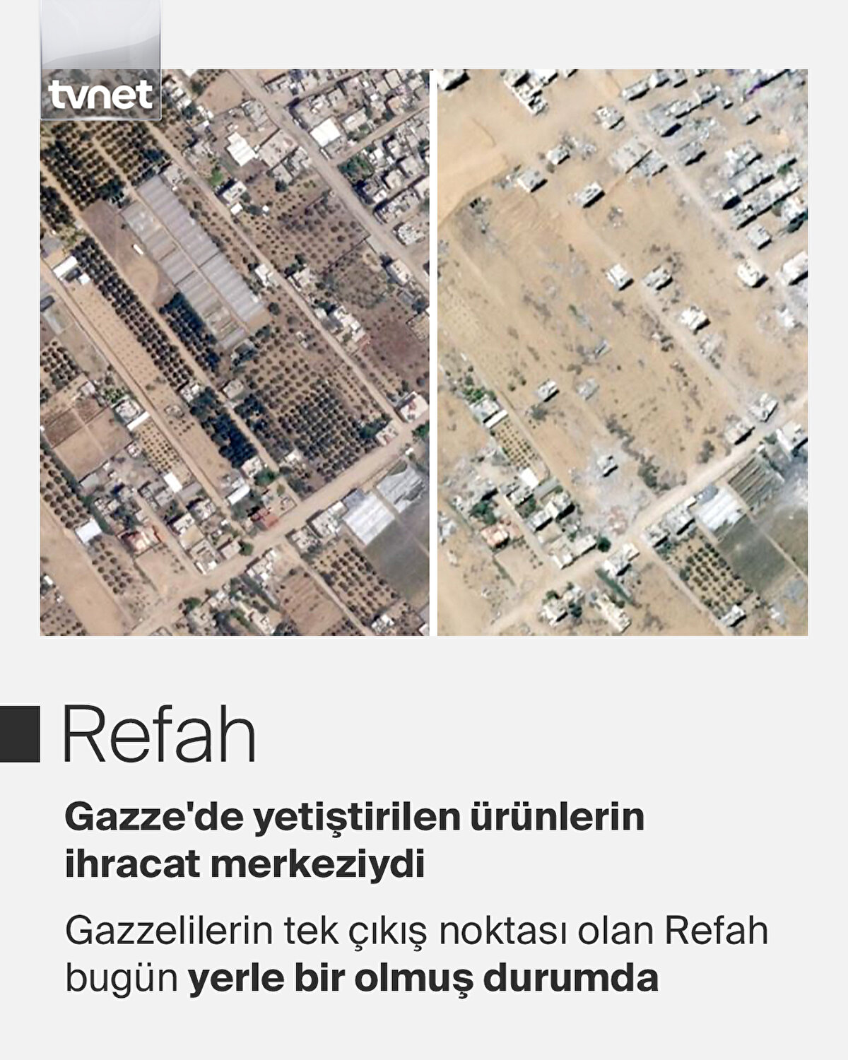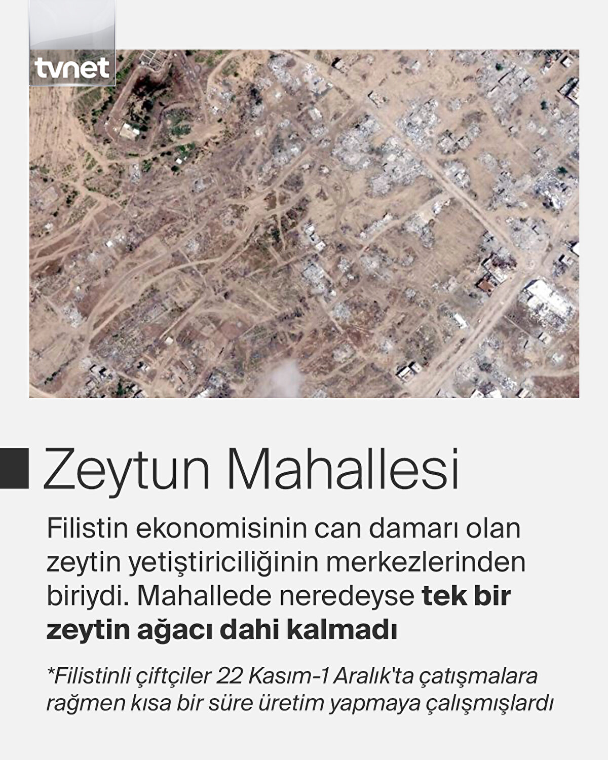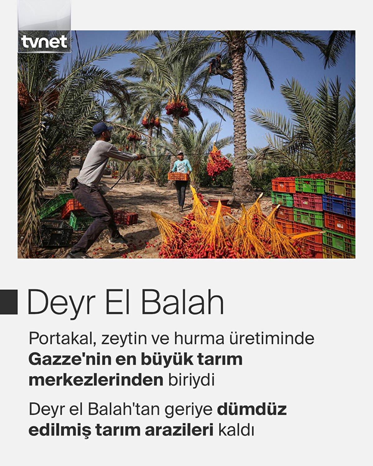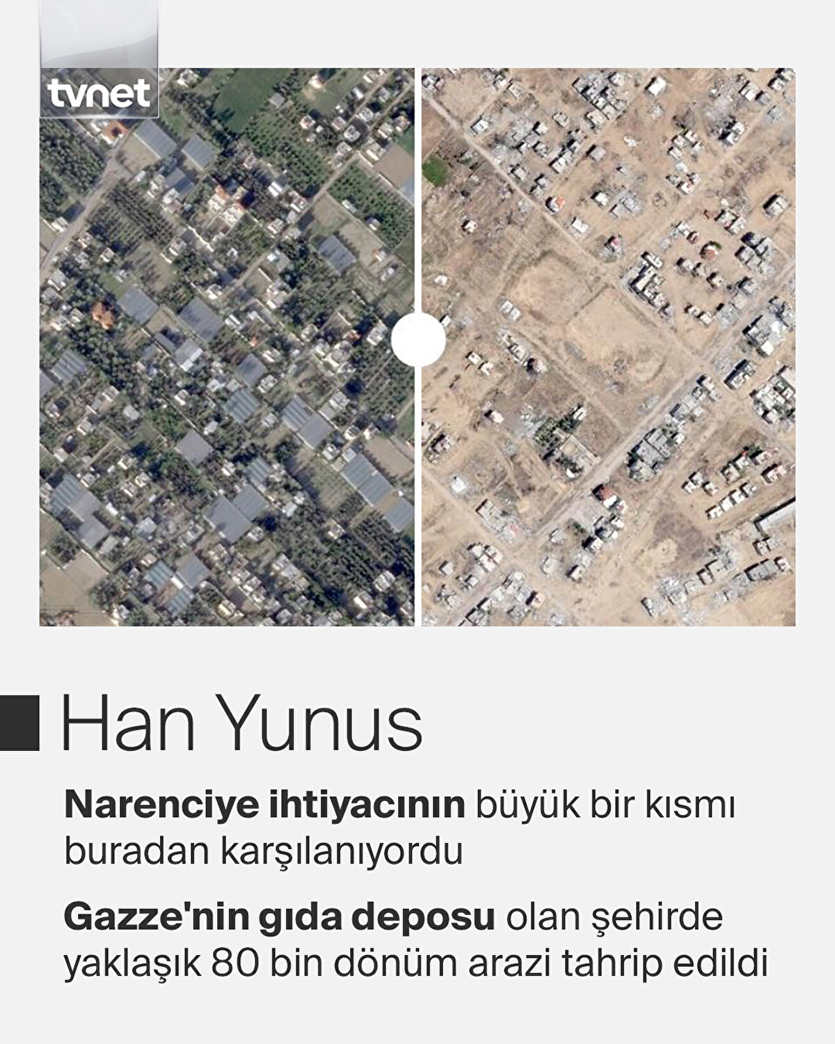İsrail ordusu Gazze'deki 120 bin dönüm tarım arazisini tahrip etti. Bu tahribatın 80 bin dönümü Han Yunus'un güneyinde, 25 bini kuzeyde ve 15 bin dönümü ise sınır bölgelerinde yaşandı. Gazze'de üretimi durma noktasına getiren İsrail binlerce insanın açlıkla karşı karşıya kalmasına neden oldu.
