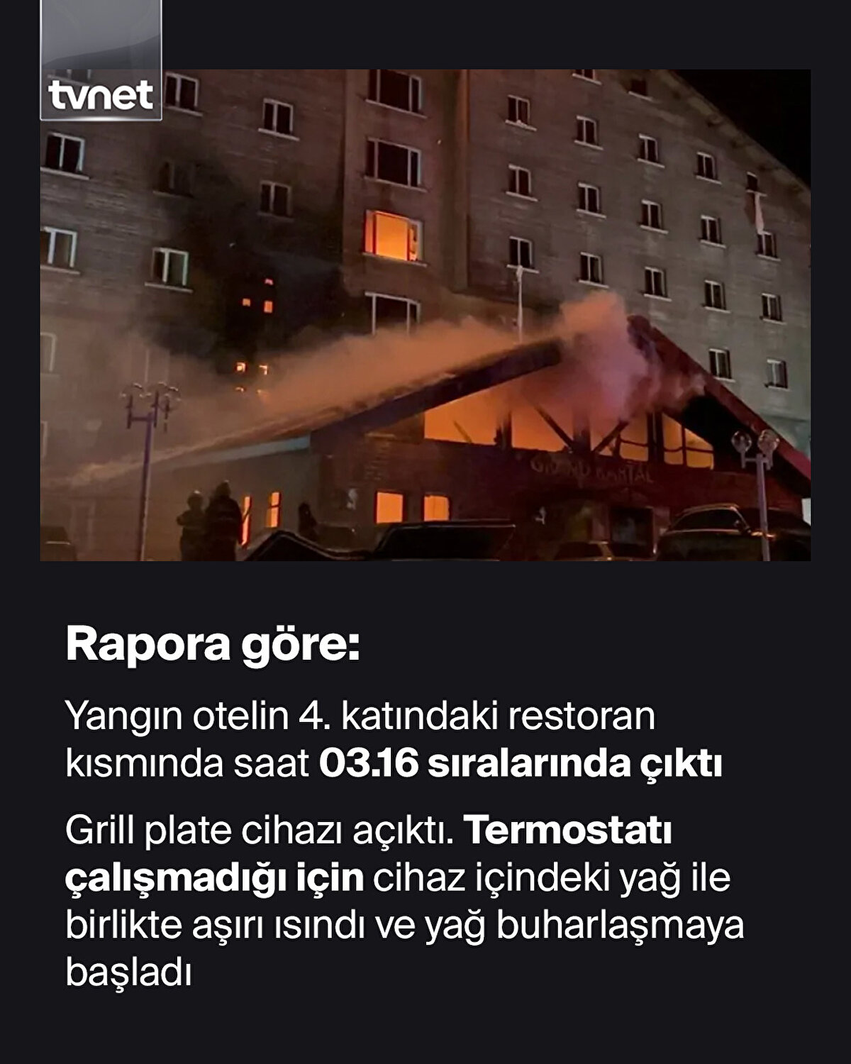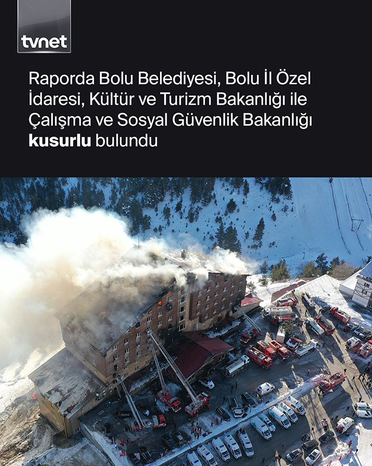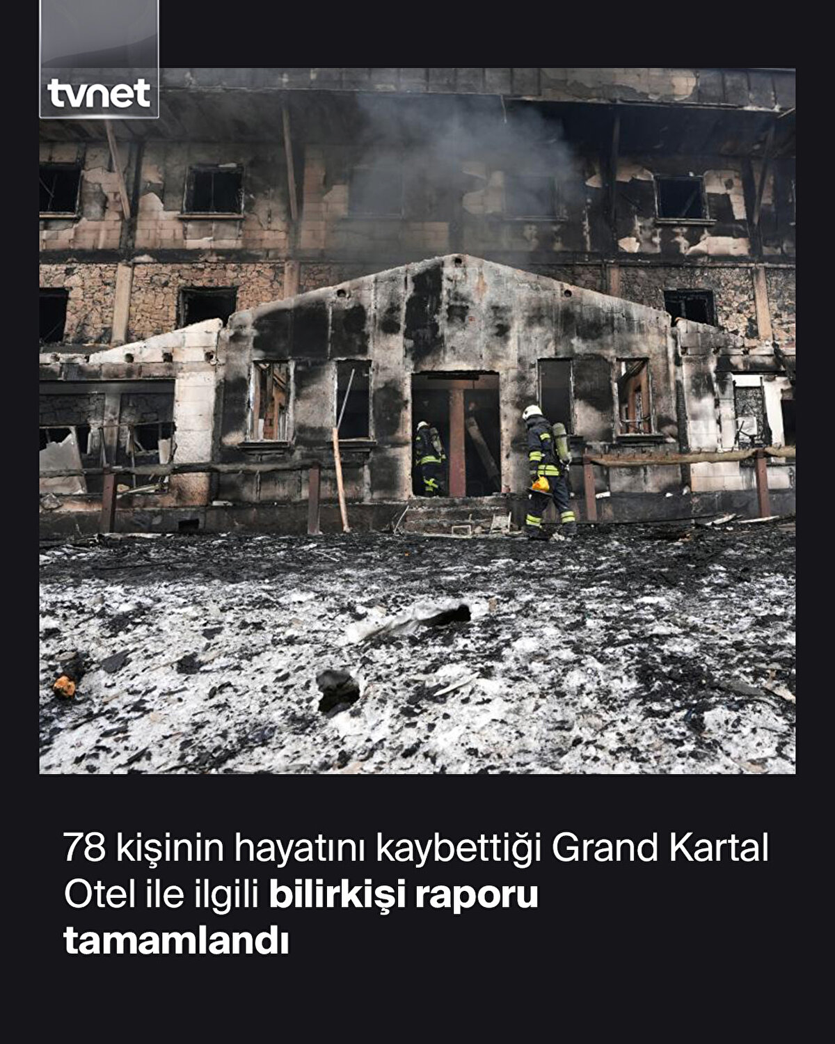 78 kişinin hayatını kaybettiği Grand Kartal Otel ile ilgili bilirkişi raporu tamamlandı. Raporda Bolu Belediyesi, Bolu İl Özel İdaresi, Kültür ve Turizm Bakanlığı ile Çalışma ve Sosyal Güvenlik Bakanlığı kusurlu bulundu