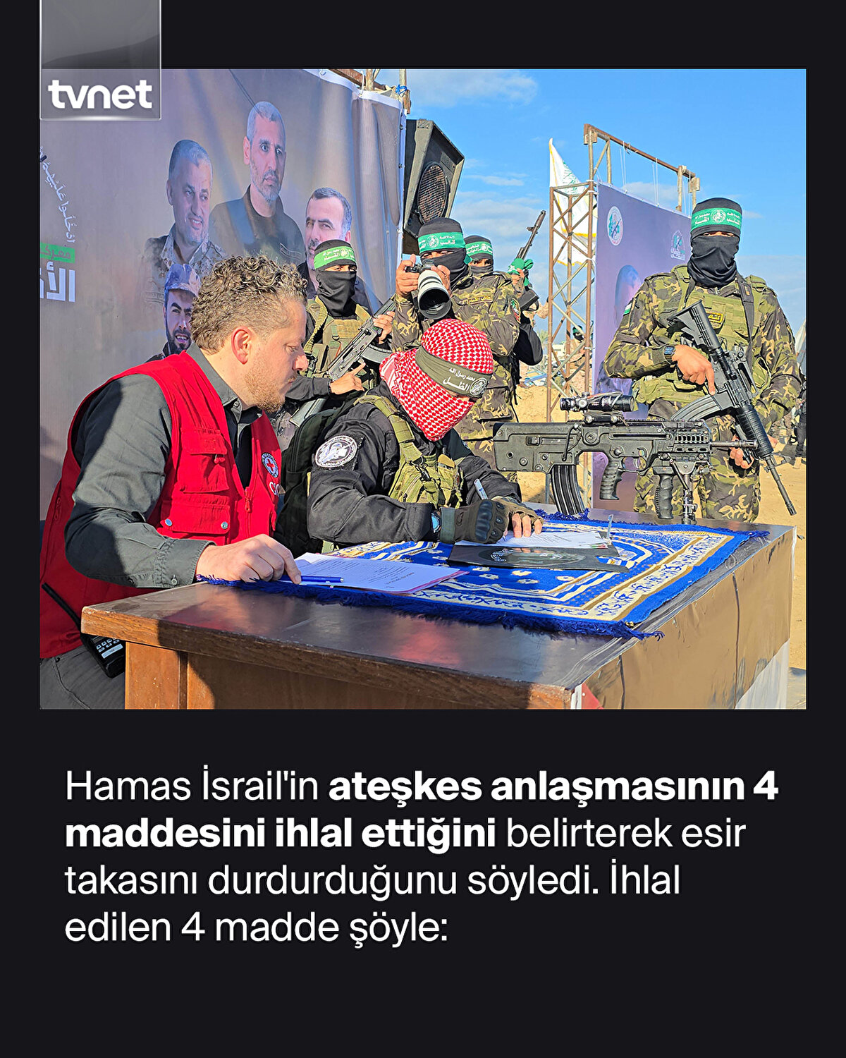 Hamas İsrail'in ateşkes anlaşmasının 4 maddesini ihlal ettiğini belirterek esir takasını durdurduğunu söyledi.