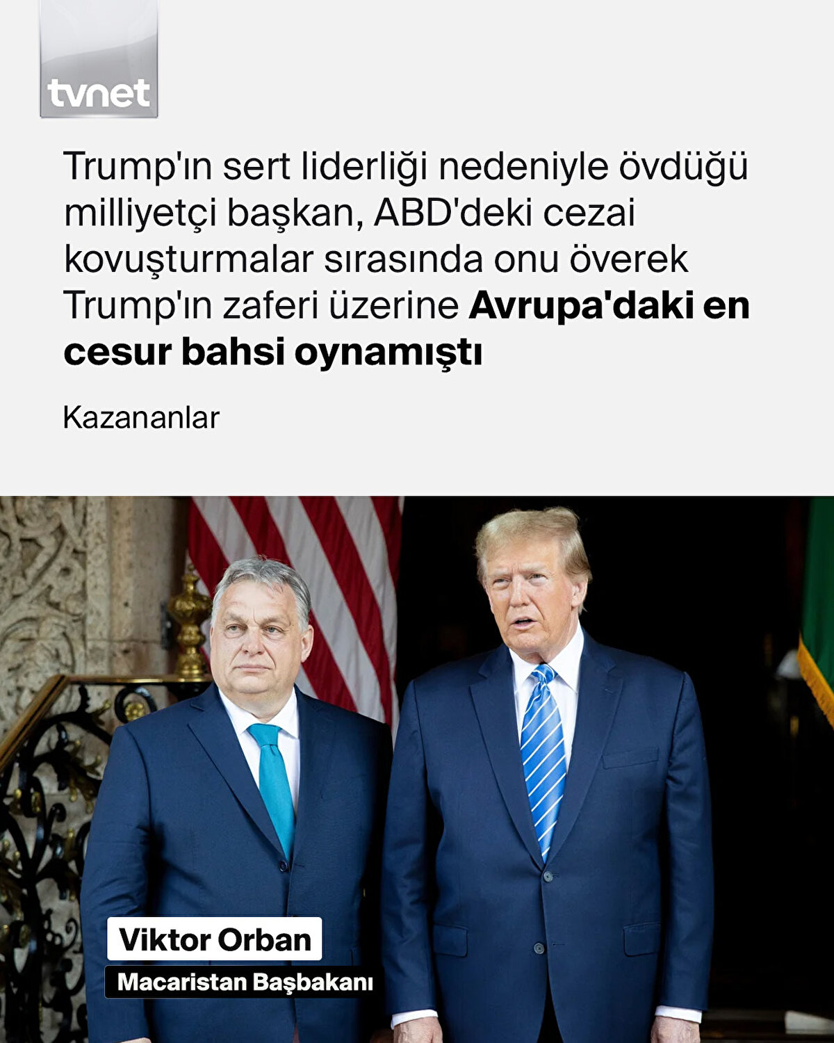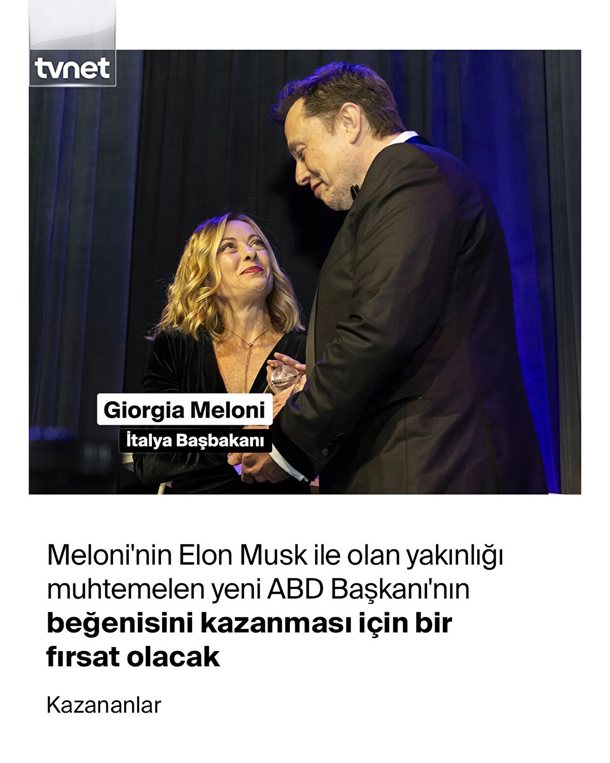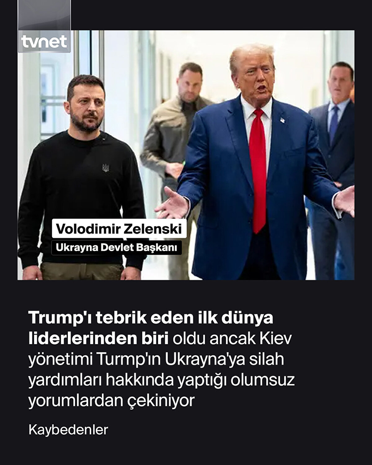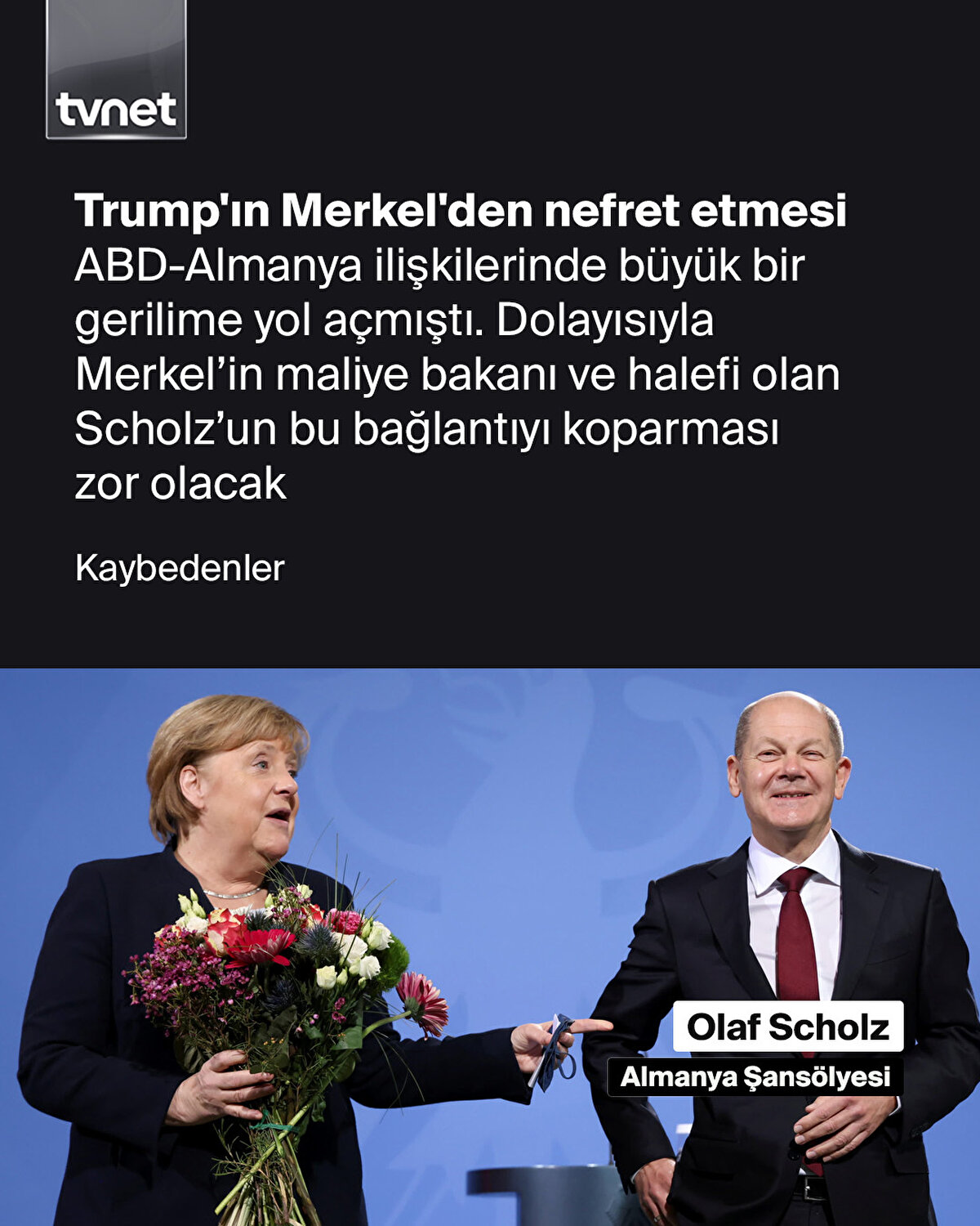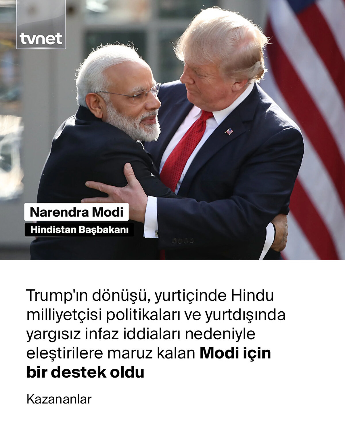 Trump'ın yeniden seçilmesi sonrası Bloomberg'in derlediği bilgilere göre bazı 'kazanan' ve 'kaybeden' liderler var...Türkiye ihtiyatlı bir iyimserlik içinde olabilir. Erdoğan ve Trump arasında samimi bir iletişim geçmişi var. Putin, Trump'ın geri dönüşünü Batı'daki bölünmelerden faydalanmak ve Ukrayna'da daha fazla kazanım elde etmek için bir fırsat olarak görüyor. Trump'ın dönüşü, yurtiçinde Hindu milliyetçisi politikaları ve yurtdışında yargısız infaz iddiaları nedeniyle eleştirilere maruz kalan Modi için bir destek oldu. Krallığın fiili yöneticisi, ABD ile önemli bir güvenlik anlaşmasını güvence altına almak için uzun süredir durmuş olan çabaları yeniden canlandırma fırsatı görecektir. Meloni'nin Elon Musk ile olan yakınlığı muhtemelen yeni ABD Başkanı'nın beğenisini kazanması için bir fırsat olacak. Trump'ın sert liderliği nedeniyle övdüğü milliyetçi başkan, ABD'deki cezai kovuşturmalar sırasında onu överek Trump'ın zaferi üzerine Avrupa'daki en cesur bahsi oynamıştı. Trump'ı tebrik eden ilk dünya liderlerinden biri oldu ancak Kiev yönetimi Turmp'ın Ukrayna'ya silah yardımları hakkında yaptığı olumsuz yorumlardan çekiniyor. Trump'ın %60'lık gümrük vergisi tehdidi Amerika ile ticareti mahvedecek ve Çin ekonomisini ayakta tutan en büyük sütunu ortadan kaldıracak. Trump'ın Merkel'den nefret etmesi ABD-Almanya ilişkilerinde büyük bir gerilime yol açmıştı. Dolayısıyla Merkel'in maliye bakanı ve halefi olan Scholz'un bu bağlantıyı koparması zor olacak