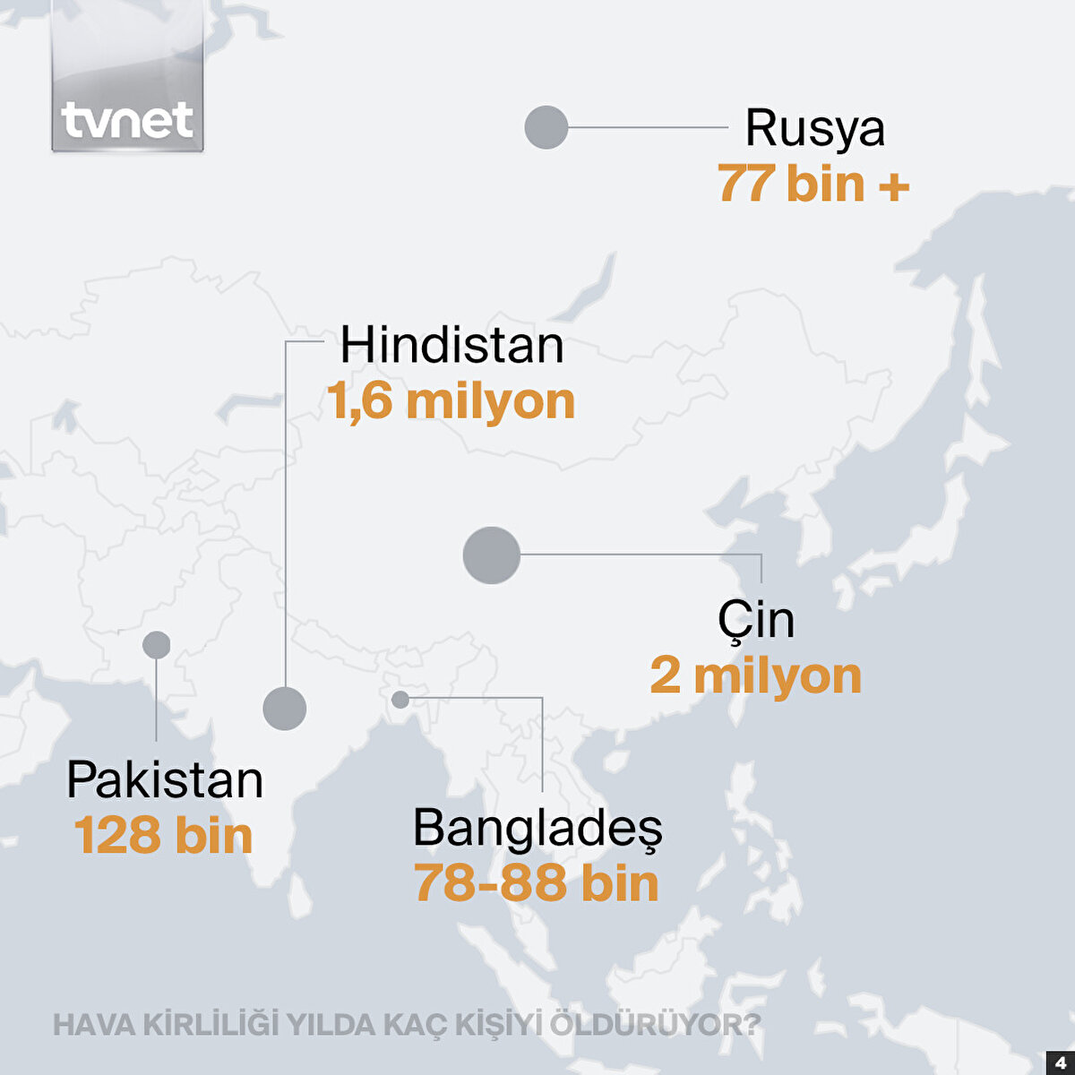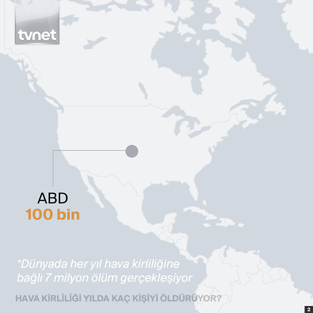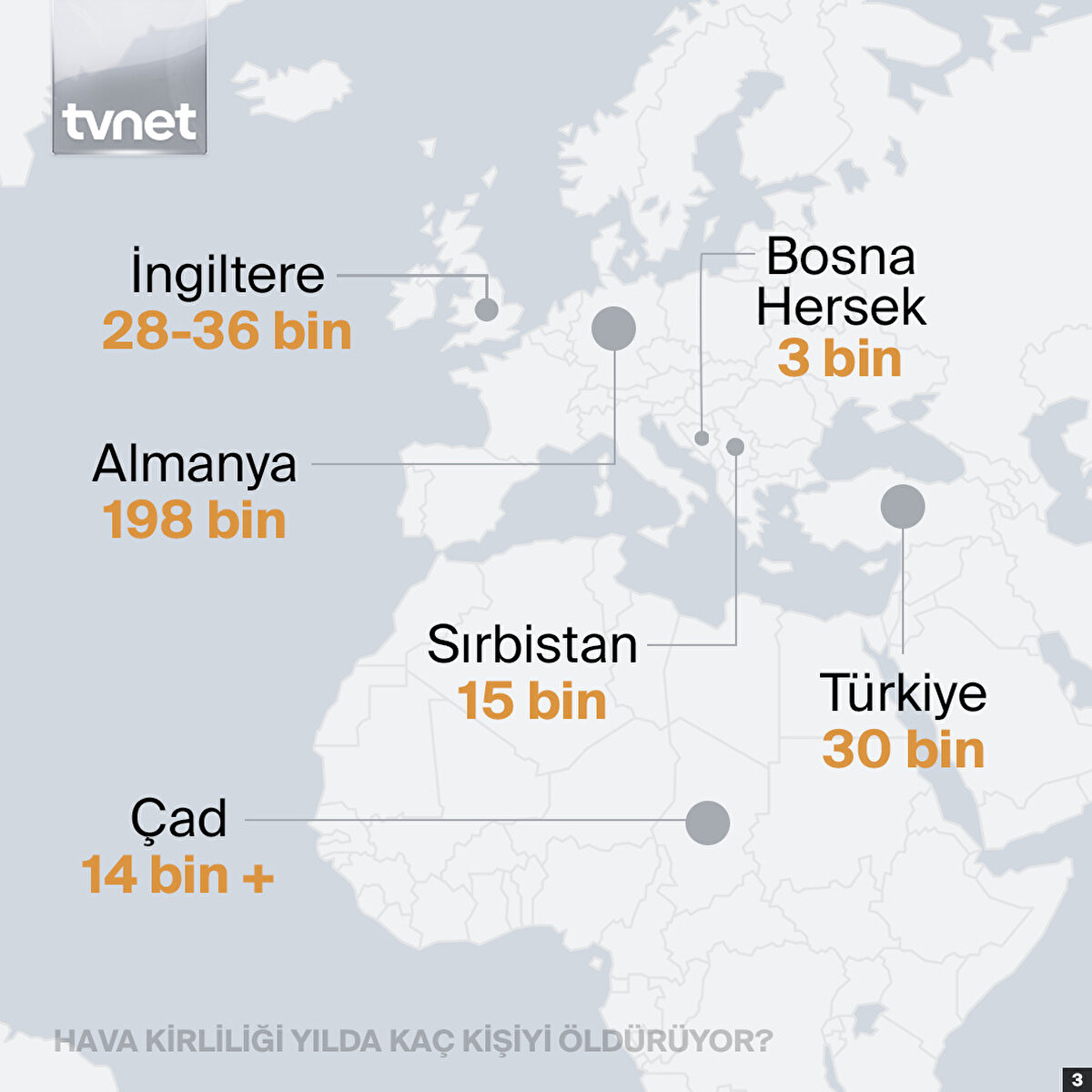 Dünya Sağlık Örgütü verilerine göre ise her yıl 7 milyon insan hava kirliliğinin sebep olduğu hastalıklar yüzünden ölüyor. Türkiye'den de 5 şehir Avrupa'nın en kirli 15 şehri arasında yer alıyor. Dünyanın havası en kirli ülkeleri arasında ilk beşte Çad, Irak, Pakistan, Bahreyn ve Bangladeş var. Bunlar; Iğdır, Gaziantep, Düzce, Mersin ve Konya.
