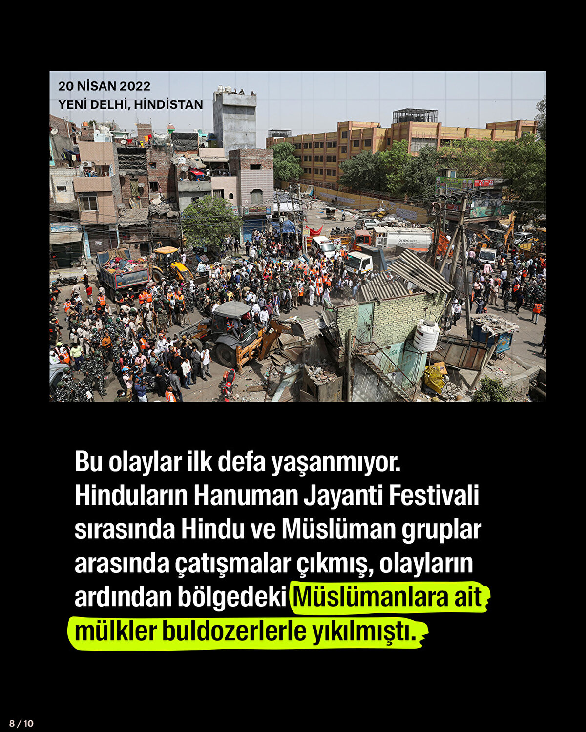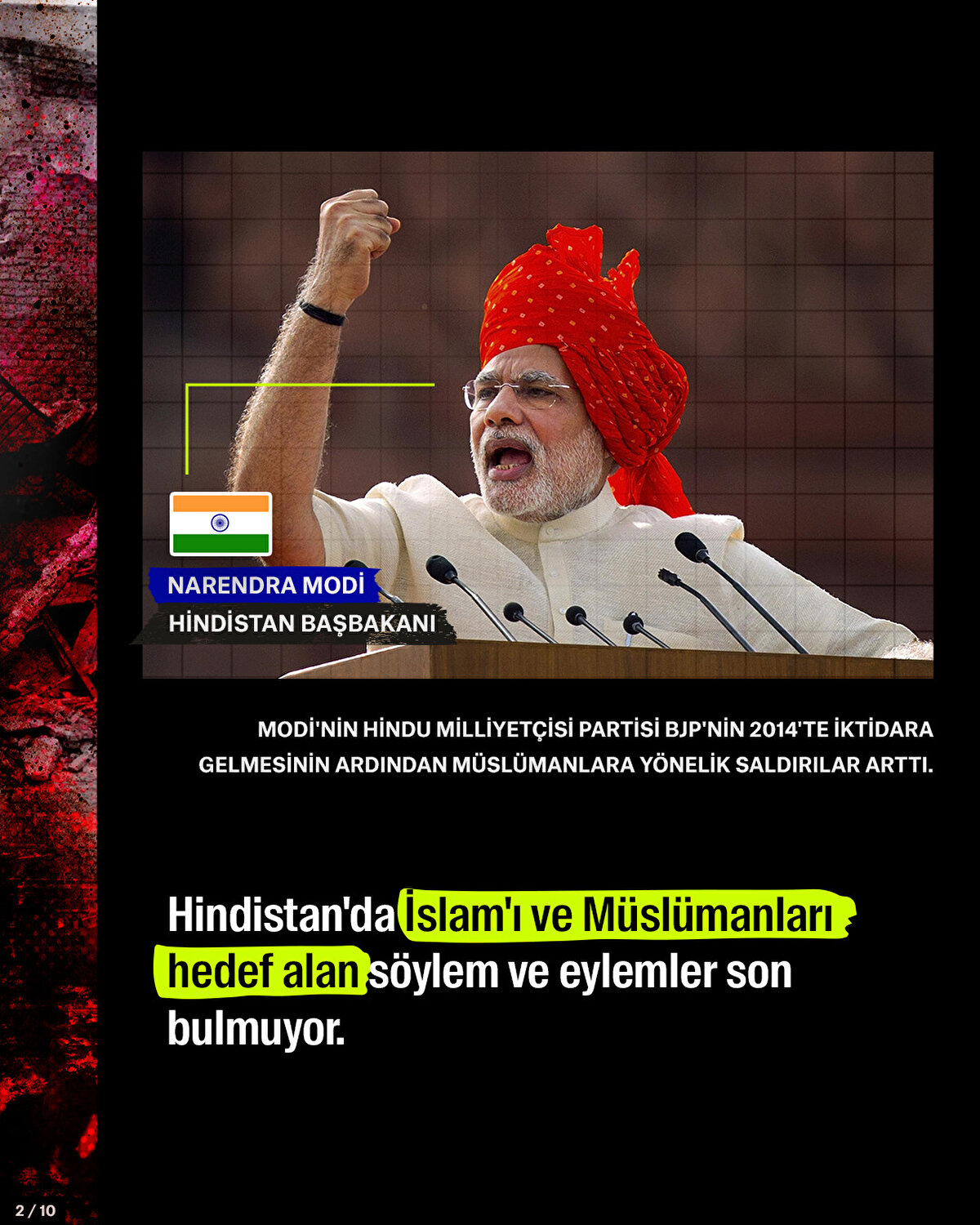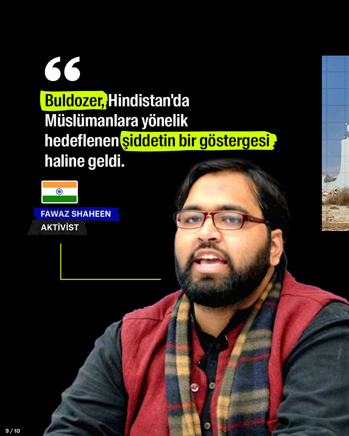 Hindistan'da İslam'ı ve Müslümanları hedef alan söylem ve eylemler son bulmuyor. Hindistan'da iktidardaki BJP Sözcüsü Nupur Sharma, geçen hafta katıldığı bir televizyon programında İslam'a ve Hz. Muhammed'e hakaret etti. Buna tepki olarak Müslümanlar, ülke genelinde protestolar düzenledi. Protestolara katılan Müslümanlardan bazılarının evleri 'ruhsatsız' olduğu ileri sürülerek yıkıldı. Buldozer, Hindistan'da Müslümanlara yönelik hedeflenen şiddetin bir göstergesi haline geldi.