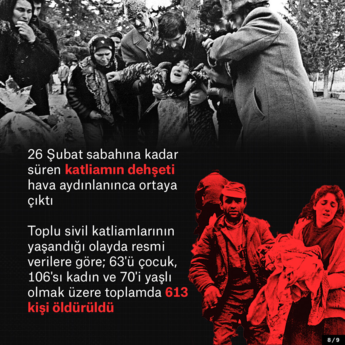 Dünyanın gözü önünde tam 31 yıl önce büyük bir soykırım yaşandı. SSCB'nin dağılma sürecine girmesiyle birlikte Karabağ bölgesinde nüfuzunu artırmak isteyen Ermeniler, Rusları da arkalarına alarak Hocalı'da büyük bir katliama kalkıştı. 25 Şubat gecesinde Hocalı'ya giren Ermeni çeteleri, o gecenin sabahında 613 Azerbaycan Türkü'nü katletti. Katliamda 8 aile tamamen yok edildi, 25 çocuk anne ve babasını, 130 çocuk ise ebeveynlerinden birini kaybetti.