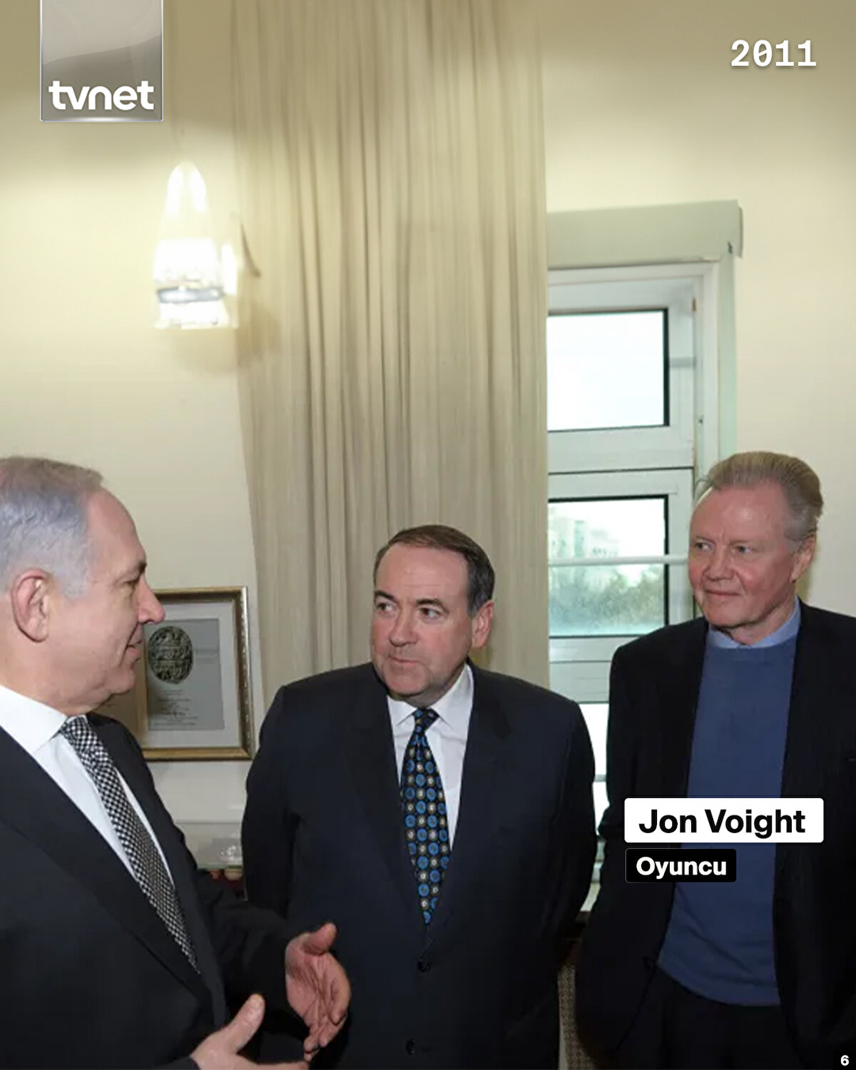 Hollywood yıldızları Gazze'de yaşanan soykrımda Netanyahu'nun yanında olmaya tercih etti. Dünyanın gözü önünde yapılan katliam için sesini çıkarmayan Hollywood yıldızları arasından 700 önemli isim İsrail'i destekleyen açık mektup imzalamıştı. Ayrıca geçtiğimiz yıllarda Keanu Reeves, Leonardo DiCaprio ve Chuck Norris gibi meşhur isimler de Netanyahu ile bizzat görüşme de gerçekleştirdi.