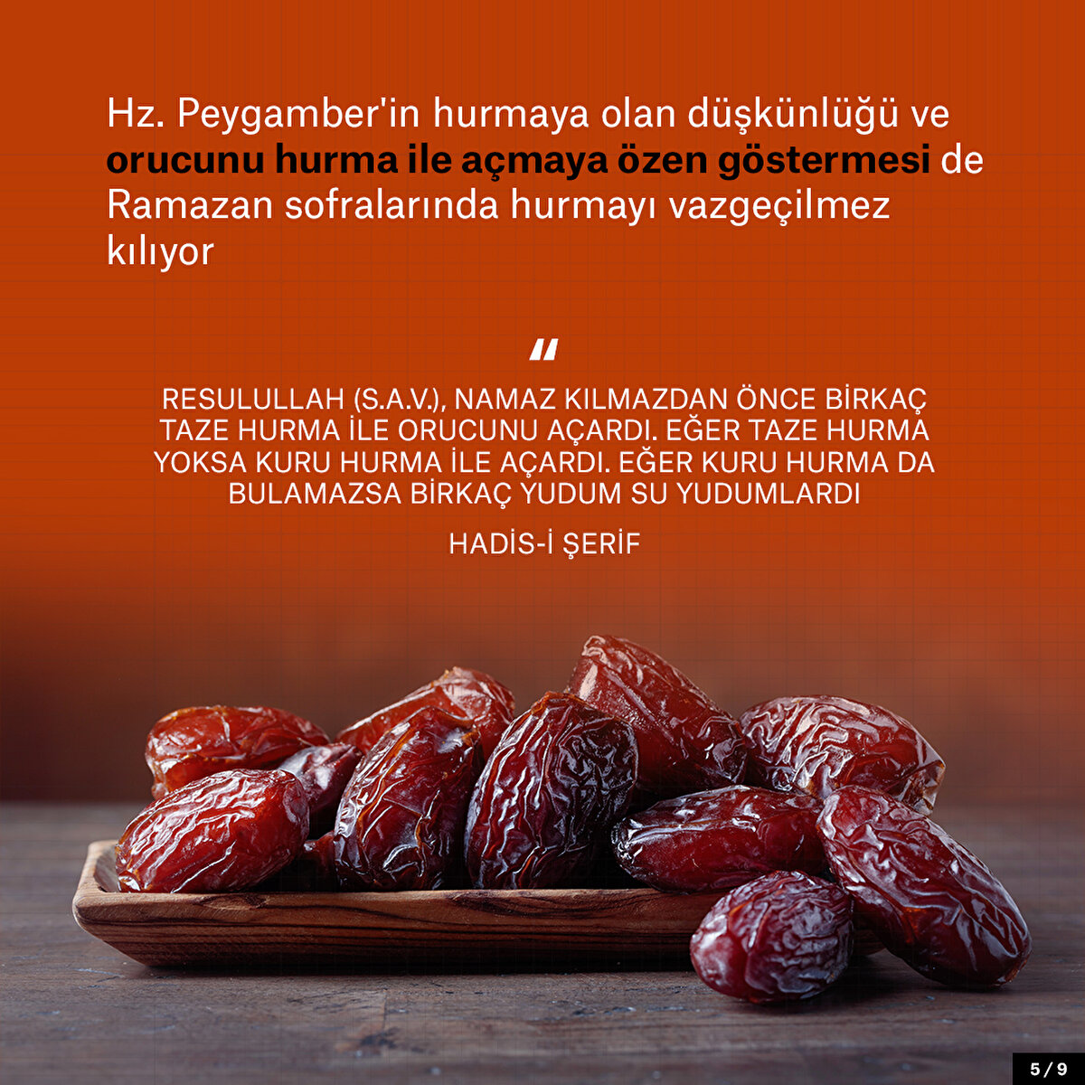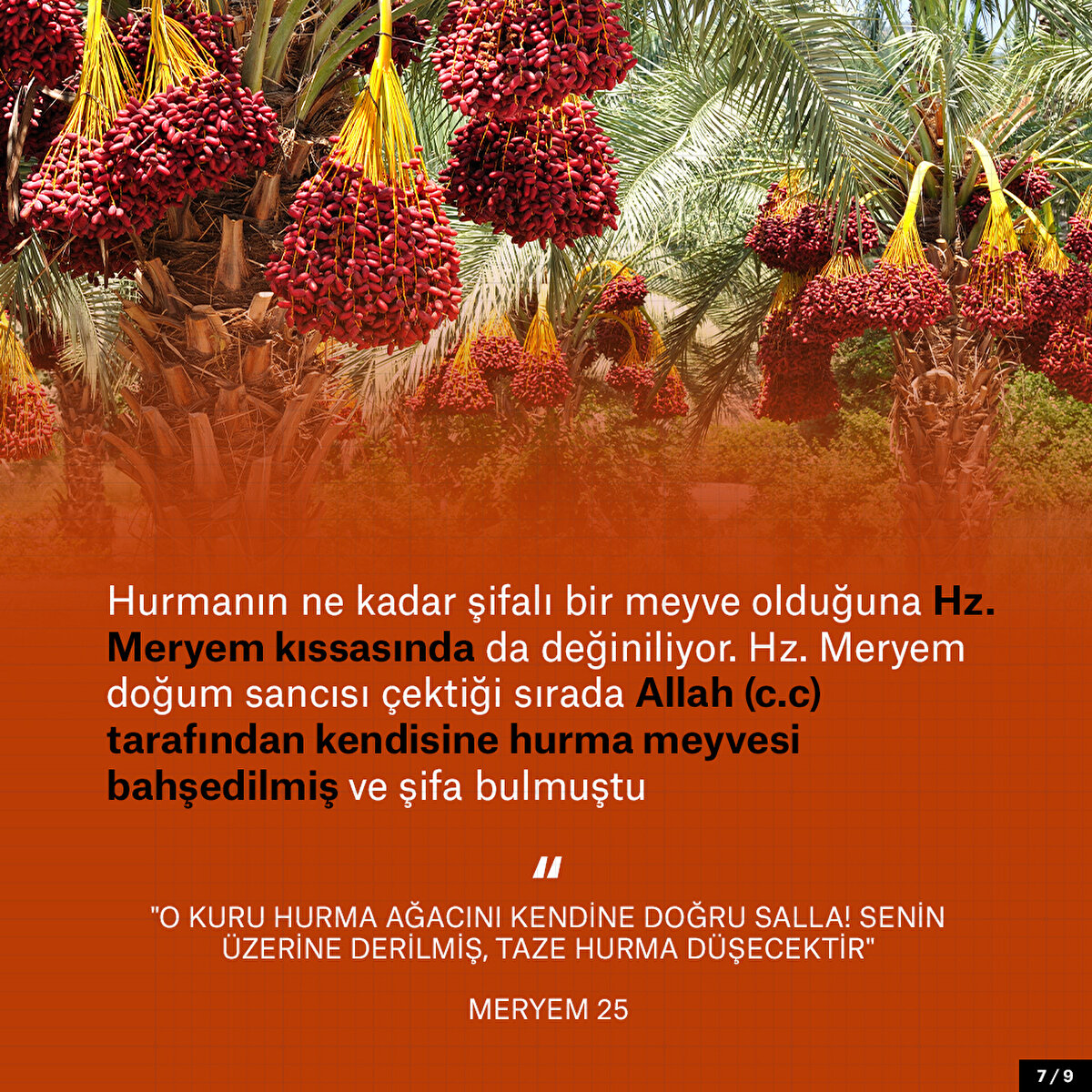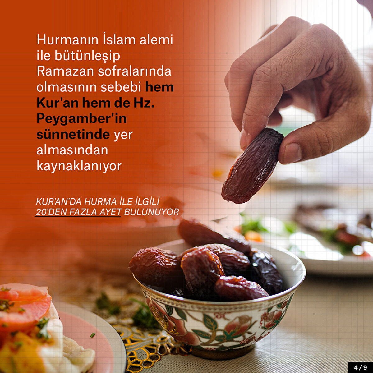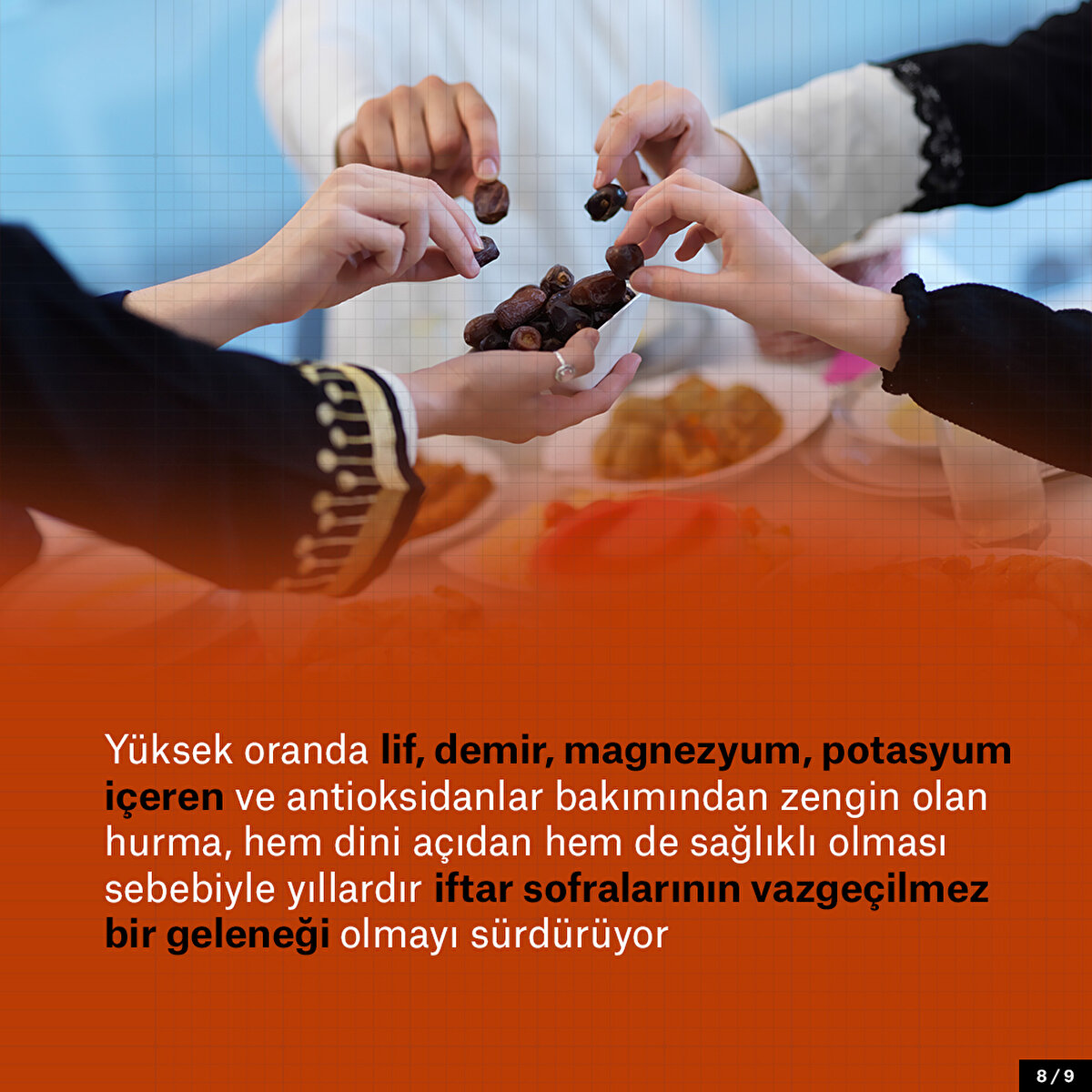 Ramazan ayı geldiğinde iftar sofralarında yüzyılladır değişmeyen bir yiyecek vardır: Hurma. Hurmanın özellikle Ramazan'da bu kadar tüketilmesinin çeşitli sebepleri var elbette. Bunlardan en önemlisi Kur'an'da ve Hz. Muhammed'in sünnetinde geçiyor olması. Ancak hurmanın geçmişi oldukça eskiye dayanıyor. M.Ö. 7500'lere dayandığını söylense de yaratılan ilk insandan bu yana da var olduğu da rivayetler arasında. Kur'an'da 20'den fazla kez tekrarlanan hurma meyvesi besin açısından oldukça da faydalı. Öyle ki Hz. Meryem'e de doğum sancısı çektiği sırada Allah (c.c) tarafından hurma bahşedilmişti. Yani iftar sofralarında oluşu aynı zamanda sağlıklı ve doyurucu etkisinden de kaynaklanıyor. Çünkü hurma antioksidan açısından zengin, kolesterolü dengeleyen, kemik, sindirim ve beyin sağlığına da iyi gelen bir meyve.