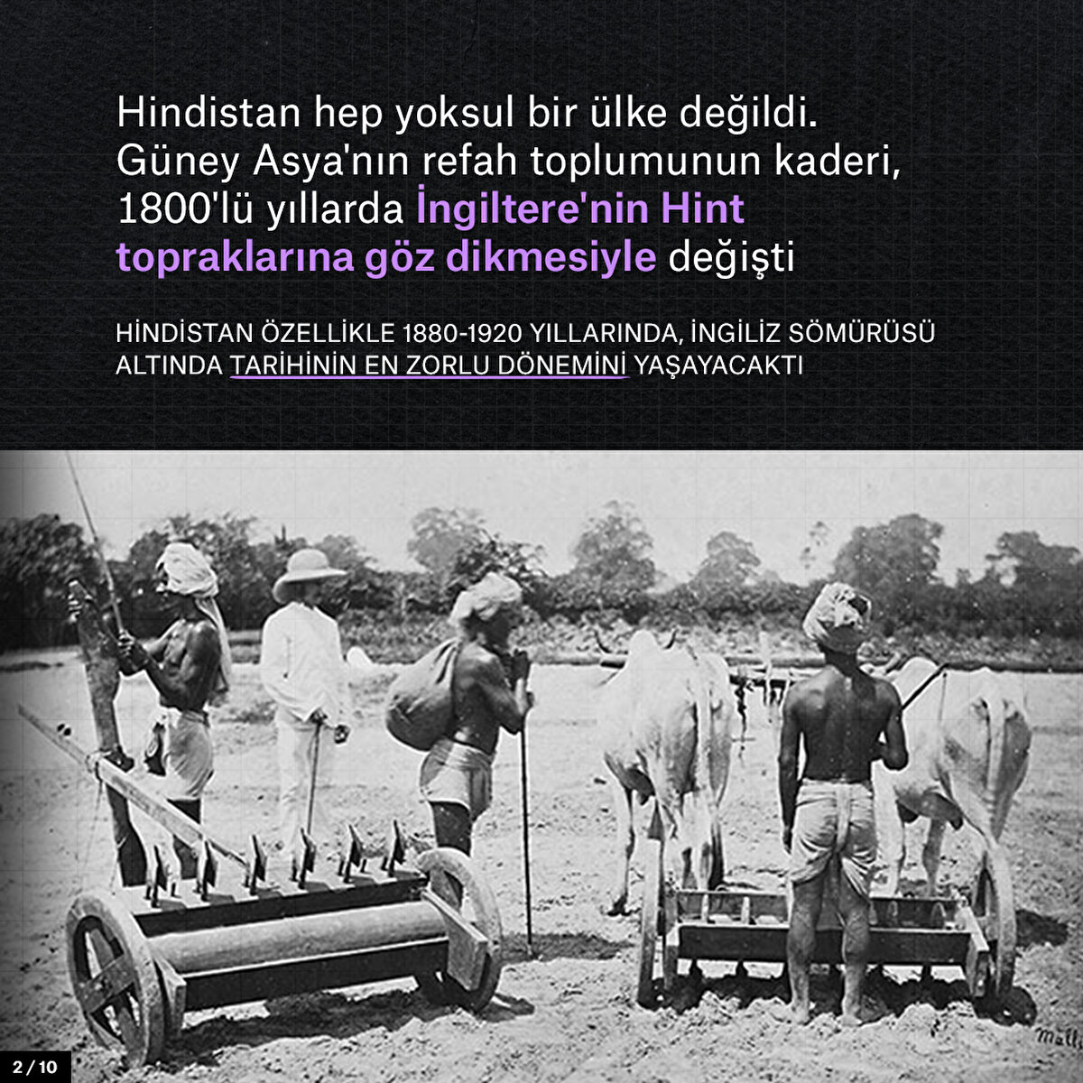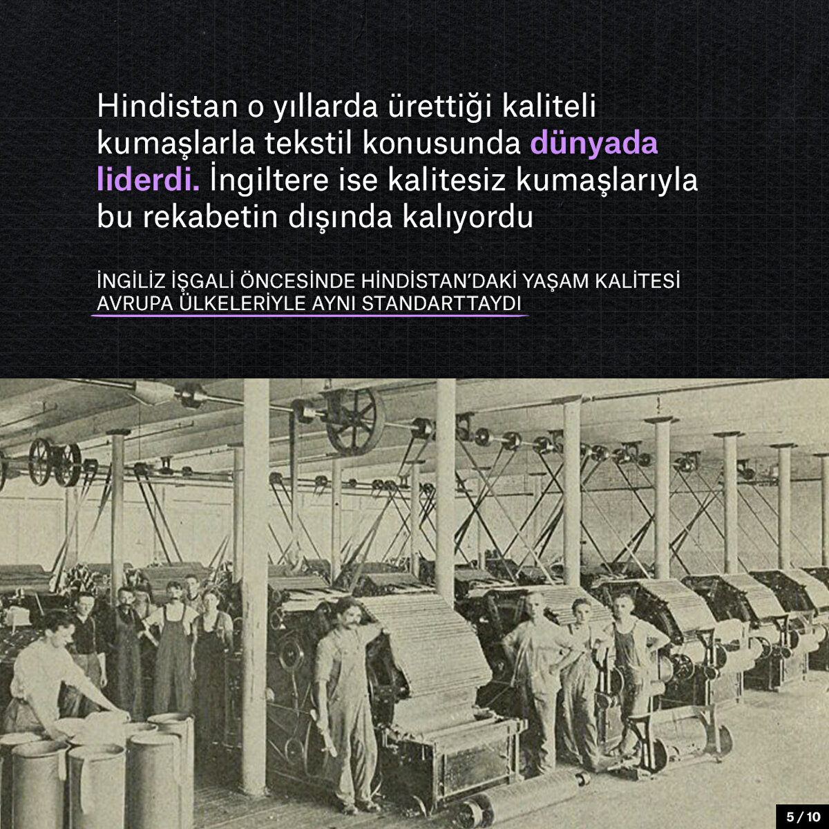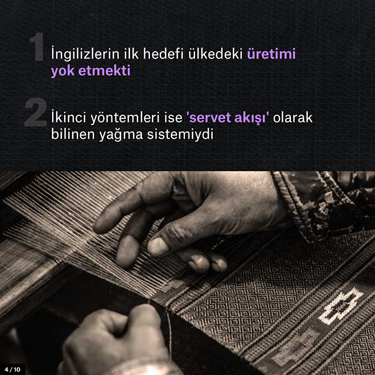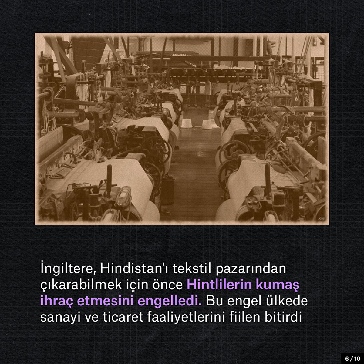 Hindistan, özellikle 1800'lü yıllarda tekstil ürünlerindeki üretiminde dünyada birinci sıradaydı. Ancak sömürü sisteminin baş aktörlerinden biri olan İngiltere, Hindistan'ın ticaretteki payına el koymak için girişimlerde bulundu. Ülkeyi vergiye bağlayarak sermaye kıtlığına neden olan İngiliz sömürüsü nedeniyle ülke genelinde 40 yılda 100 milyon insan öldü.