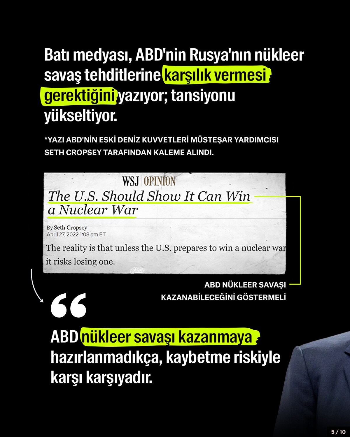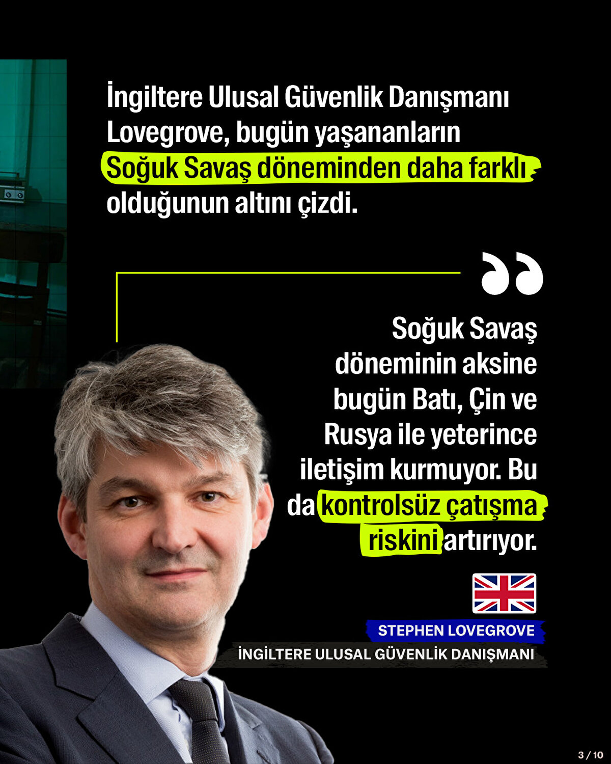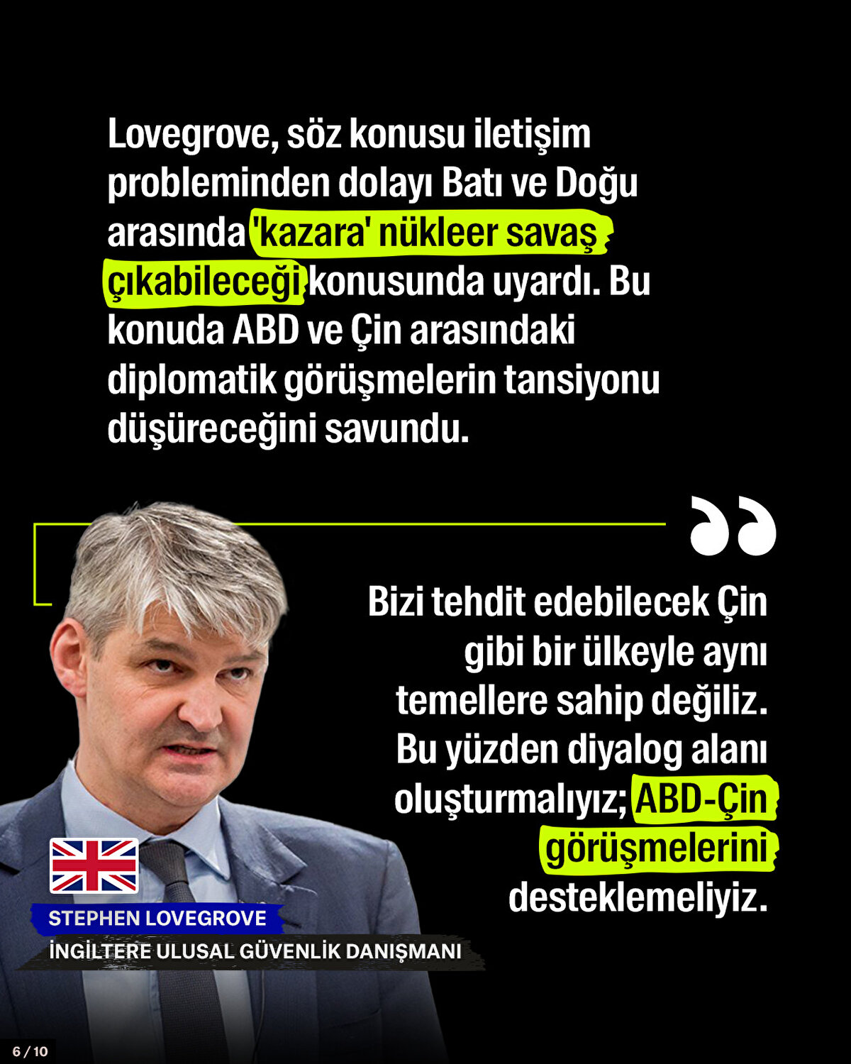 Rusya-Ukrayna savaşı, Çin-Tayvan gerilimi ve ABD'nin kışkırtıcı adımları 'nükleer çatışma' riskini bir kez daha gündeme getirdi. İngiltere Ulusal Güvenlik Danışmanı Lovegrove, iletişim probleminden dolayı Batı ve Doğu arasında 'kazara' nükleer savaş çıkabileceği konusunda uyardı.