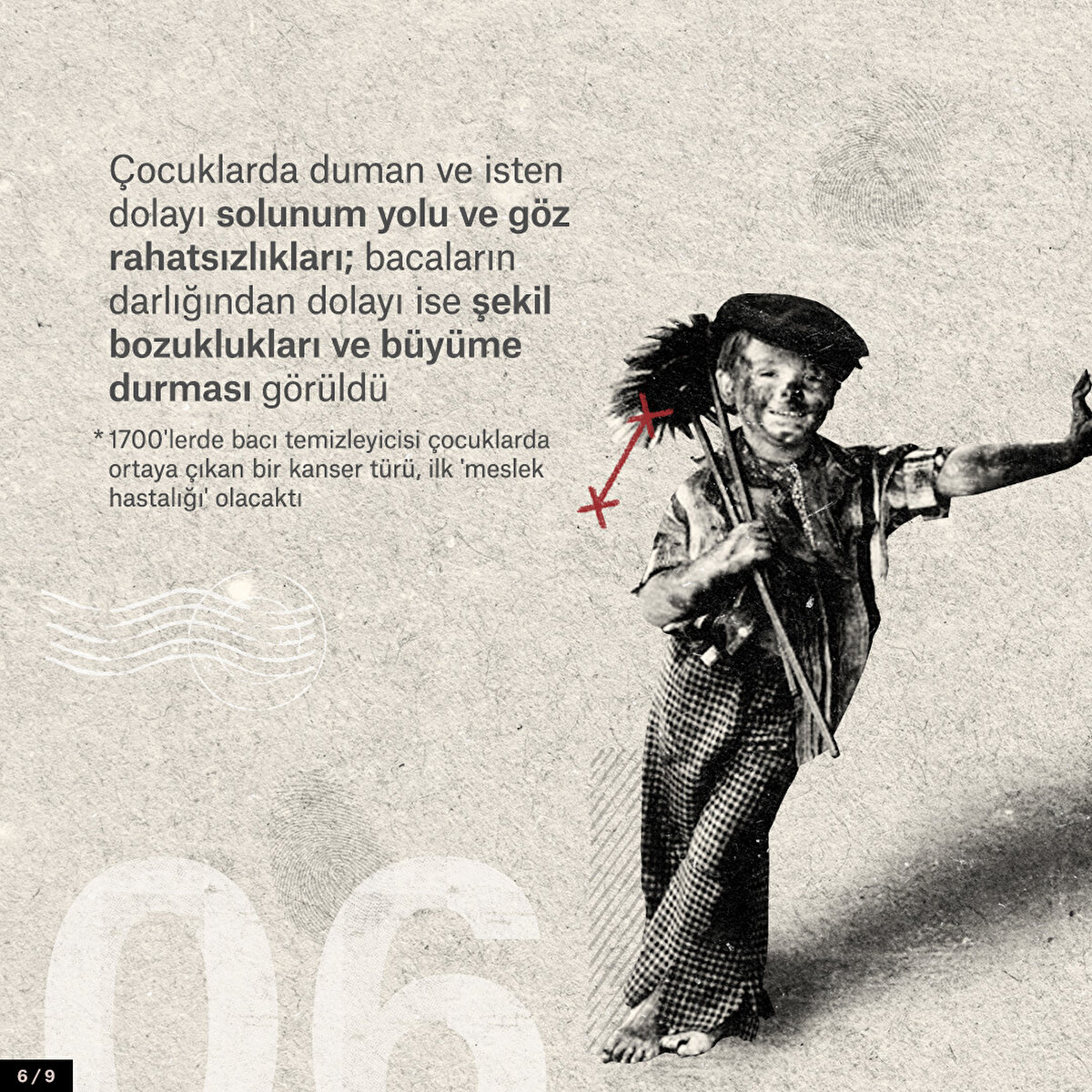 İngiltere'de 1666'da büyük bir yangın faciası yaşandı. Yangının ardından binaların daha dar bacalar yapılması için talimat verildi. Baca temizleyicisi ustalar ve çırakların çalıştığı bir sektör ortaya çıktı. Dar bacaları temizleyen küçük çocuklar duman ve isten solunum yolu hastalıklarına maruz kaldı. 200 yıl süren çocuk işçi sömürüsünde binlerce çocuk sağlıksız koşullarda çalıştırıldı; çoğu yetişkinliğe eriştiğinde hastalıklı bireyler haline geldi.