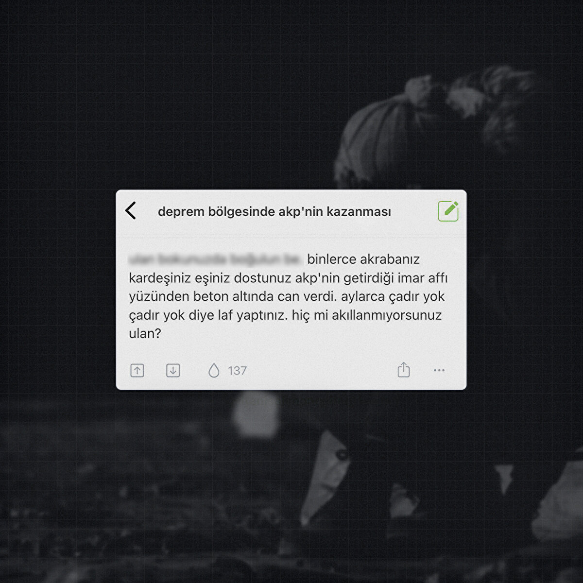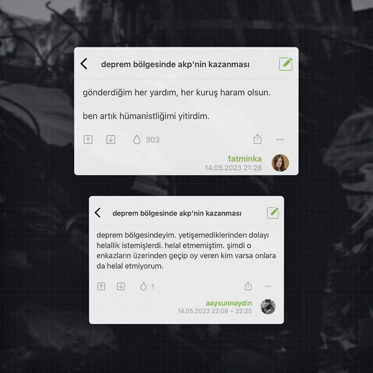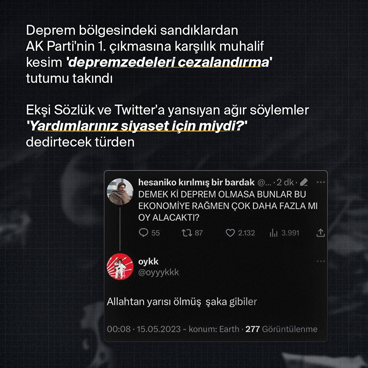 Deprem bölgesindeki sandıklardan AK Parti'nin 1. çıkmasına karşılık muhalif kesim 'depremzedeleri cezalandırma' tutumu takındı. Ekşi Sözlük ve Twitter'a yansıyan ağır söylemler 'Yardımlarınız siyaset için miydi?' dedirtecek türden.