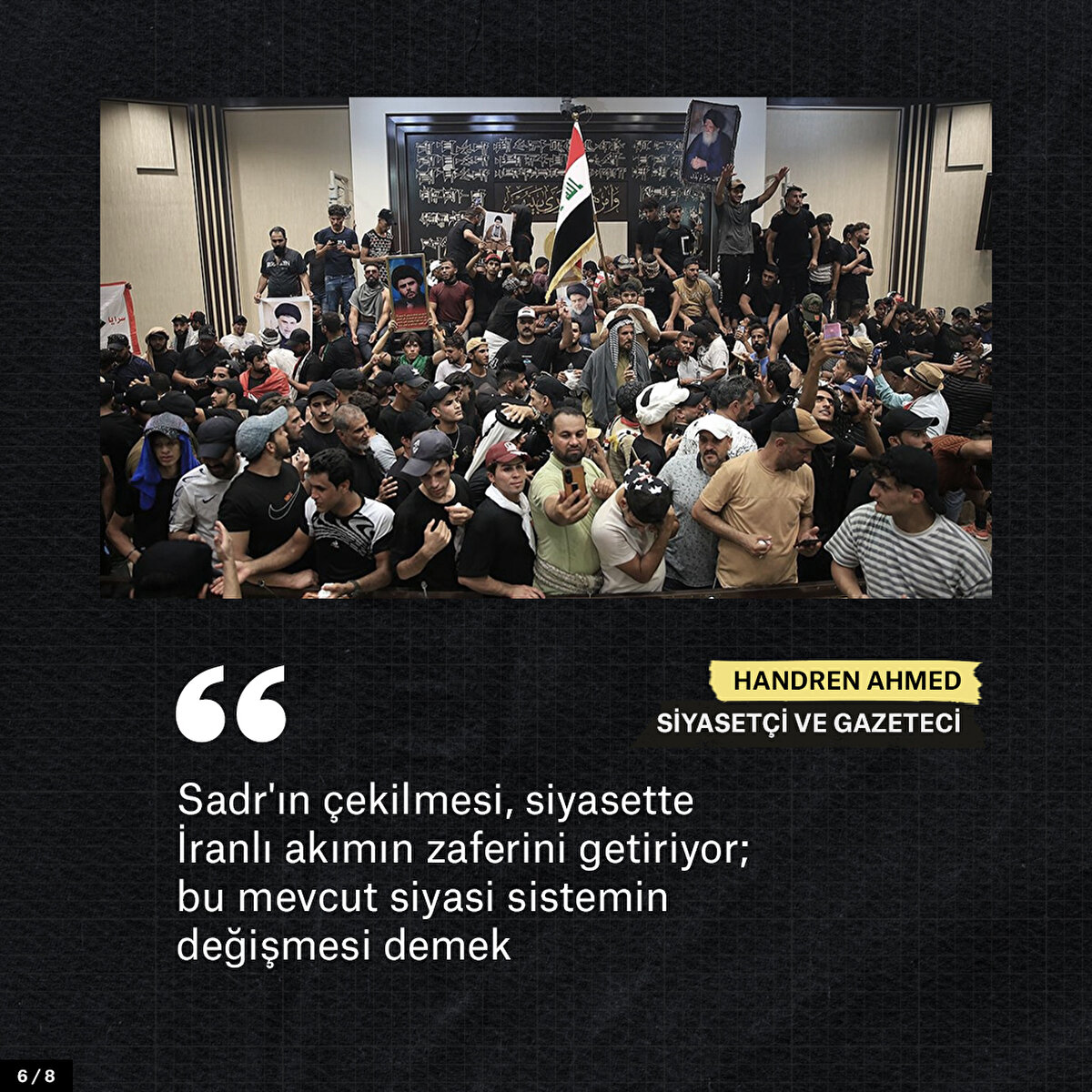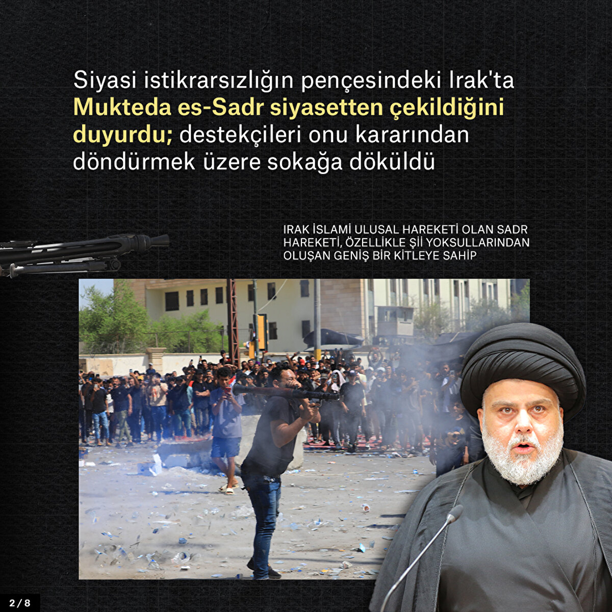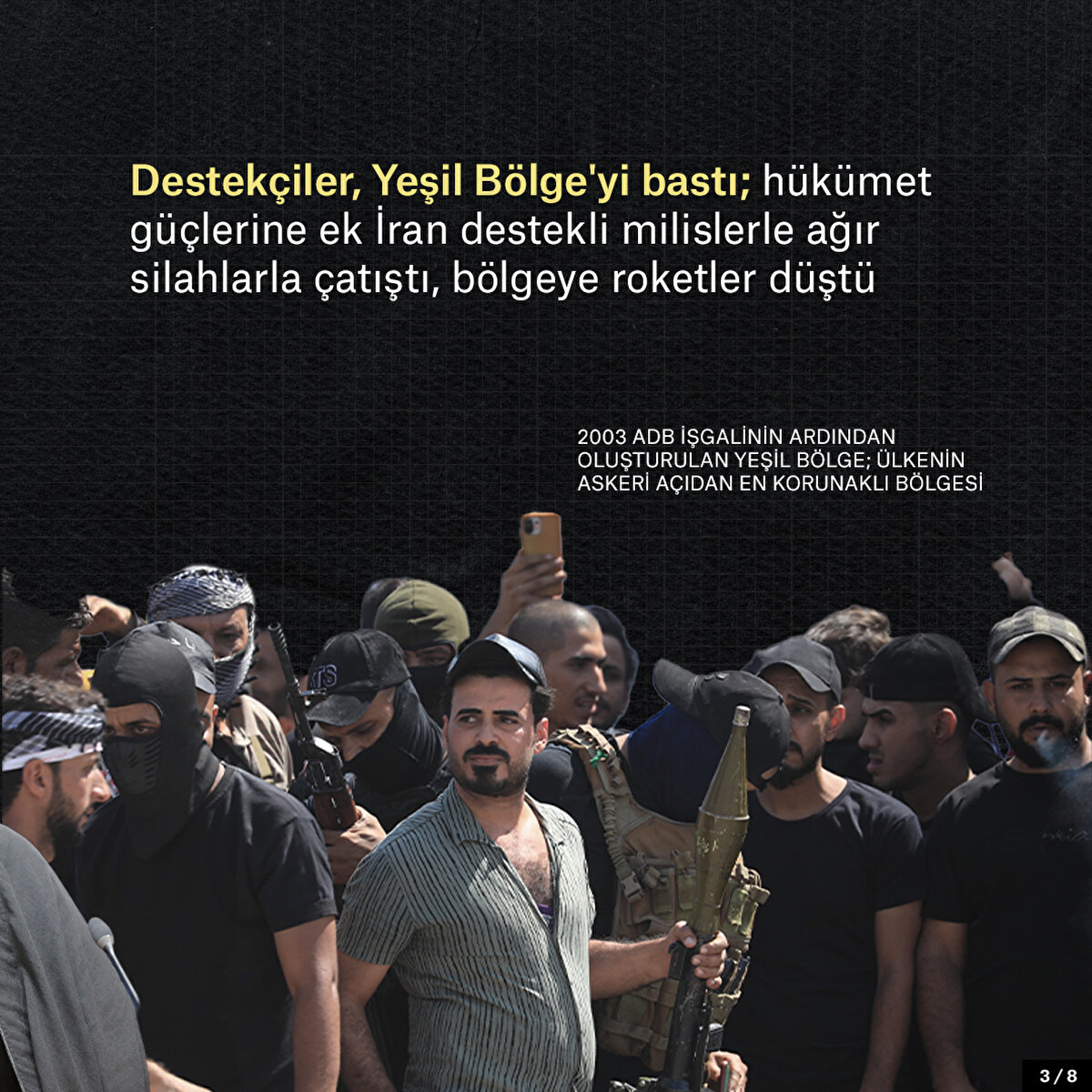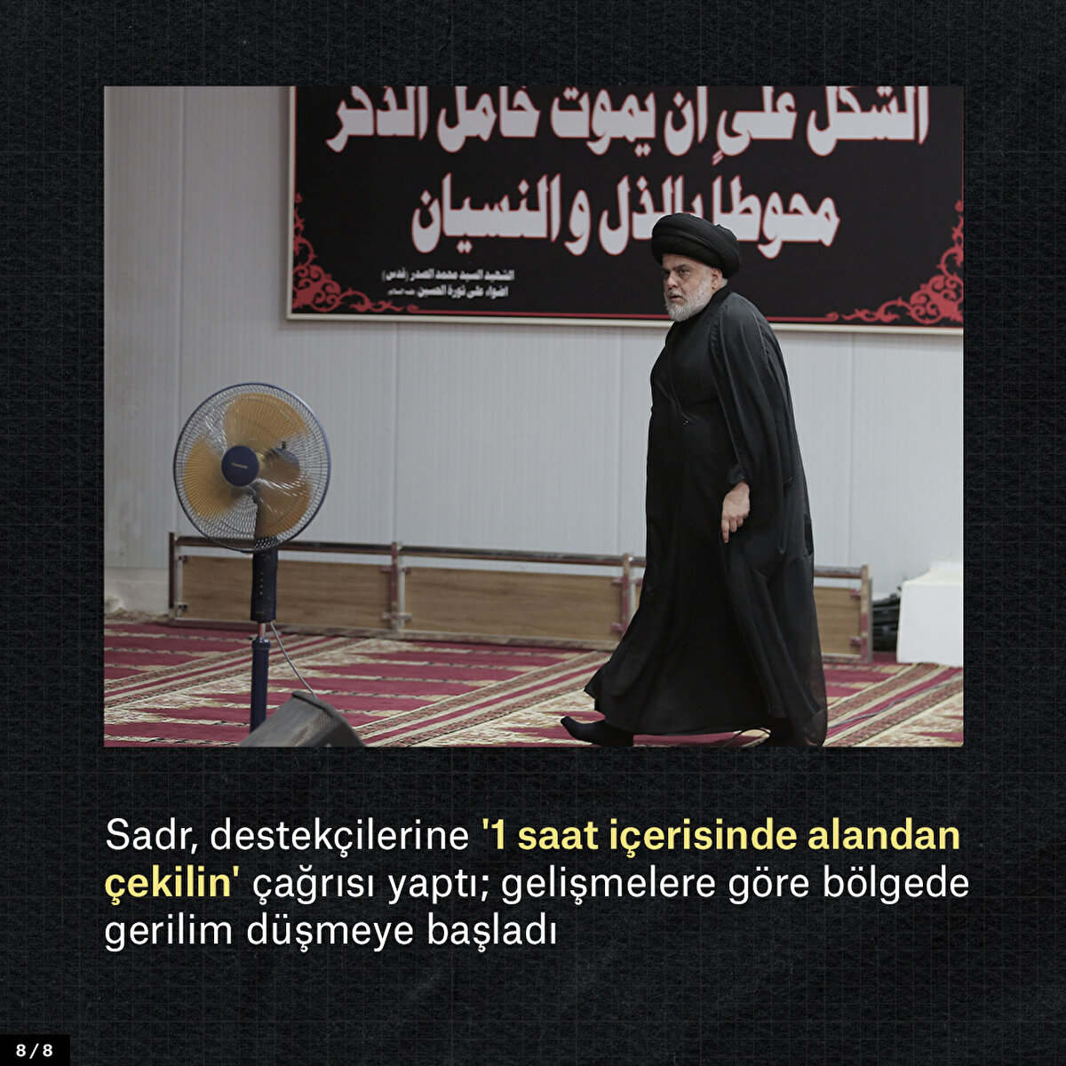 Siyasi istikrarsızlığın pençesindeki Irak'ta Mukteda es-Sadr siyasetten çekildiğini duyurdu; destekçileri onu kararından döndürmek üzere sokağa döküldü. Destekçiler, Yeşil Bölge'yi bastı; hükümet güçlerine ek olarak İran destekli milislerle ağır silahlarla çatıştı, bölgeye roketler düştü.